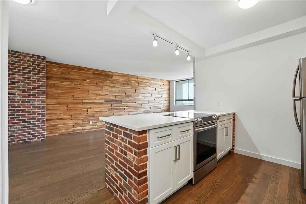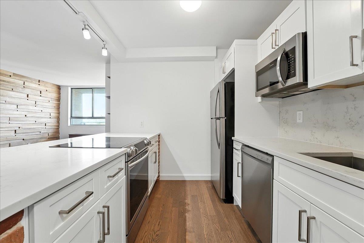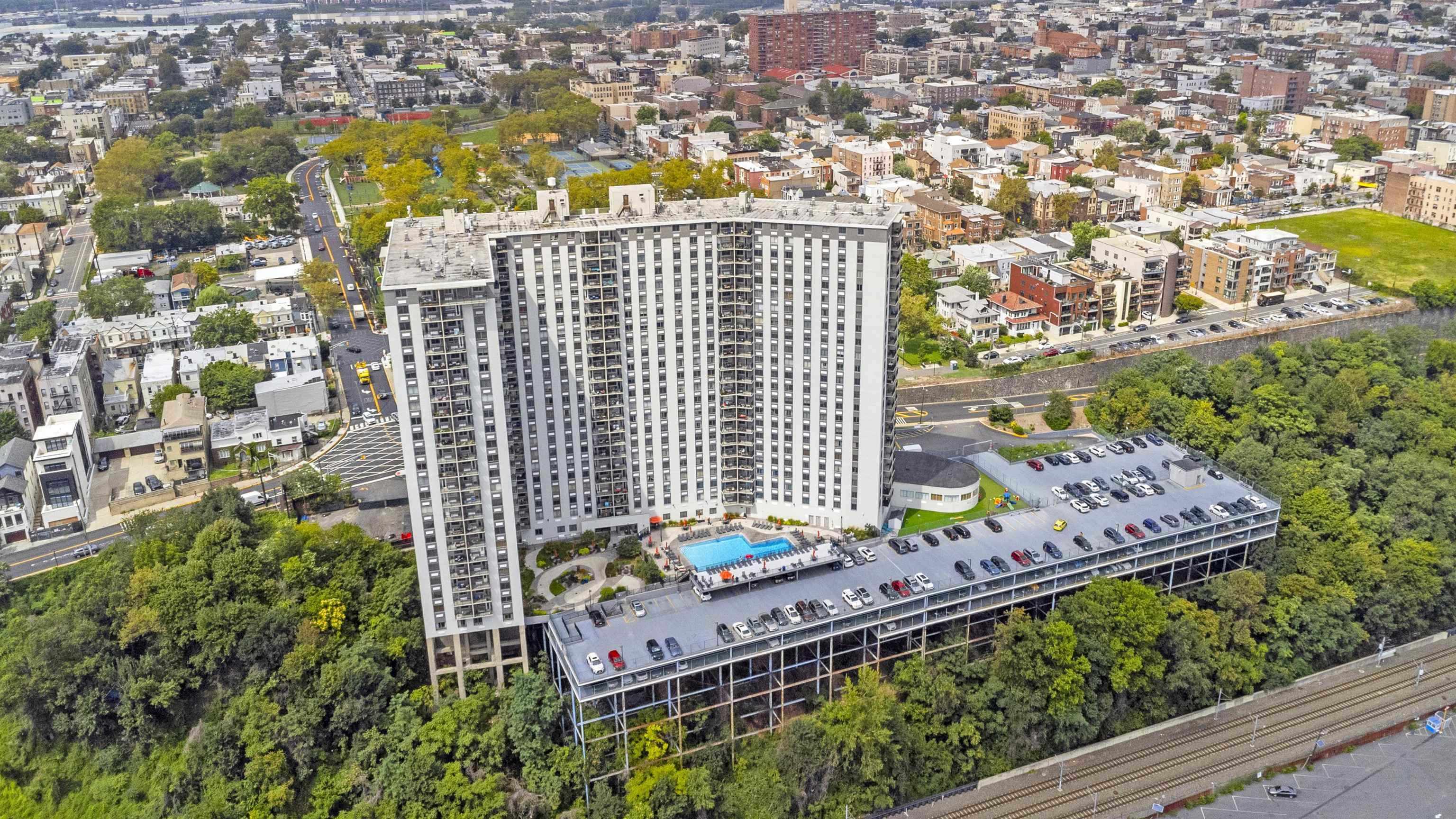 One-bedroom w/Den! Bright, Modern, and Move-In Ready with Iconic Views. The beautifully renovated 780 sq ft is the perfect home. Pride of ownership can be seen throughout with thoughtful upgrades including custom designed walls, newer hardwood flooring, sleek kitchen cabinetry with quartz countertops, and newer stainless steel appliances. The spa-inspired bathroom is fully tiled for a clean, contemporary feel. The living room is sizable and came be split into living and dining along with plenty of large cosets offered in every room. The home features your own private balcony to soak in breathtaking NYC skyline views and vibrant sunsets—a daily luxury that doesn’t get old. Located in the sought-after Doric, this full-service building offers a vibrant community and an unmatched lifestyle. Enjoy 24/7 concierge service, a secure package room, on-site convenience store a spacious laundry room, fitness center, residents’ lounge, bike storage, indoor storage, and parking. In the warmer months, unwind by the outdoor pool or take in the beautifully maintained garden area. Commuter-friendly and perfectly situated, you’re minutes from Midtown buses right out front, with easy access to the Light Rail, PATH, Turnpike, airport, and both the Lincoln and Holland Tunnels. With a dog run across the street and on-site childcare, everything you need is at your doorstep. The Doric—where convenience meets comfort and community.