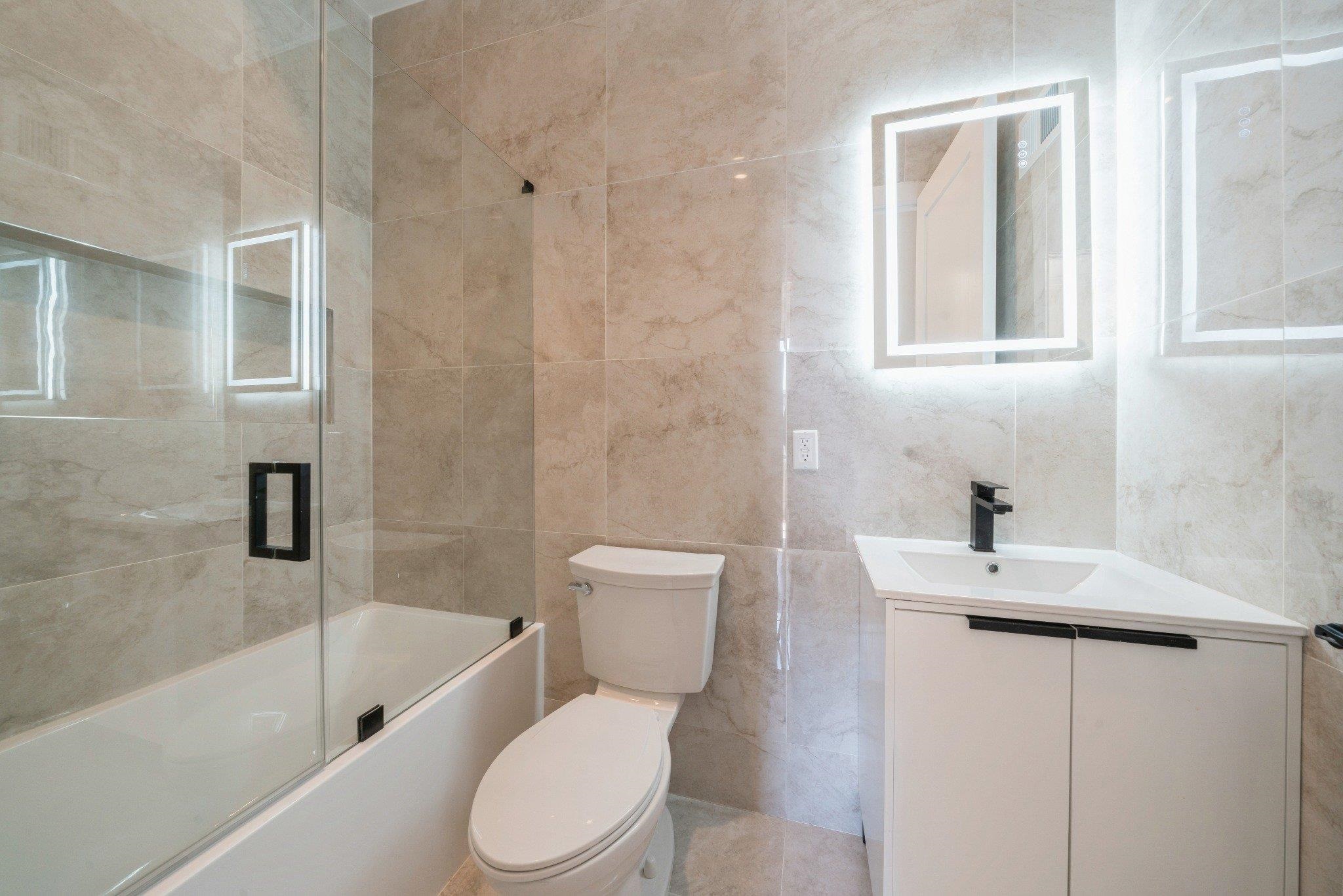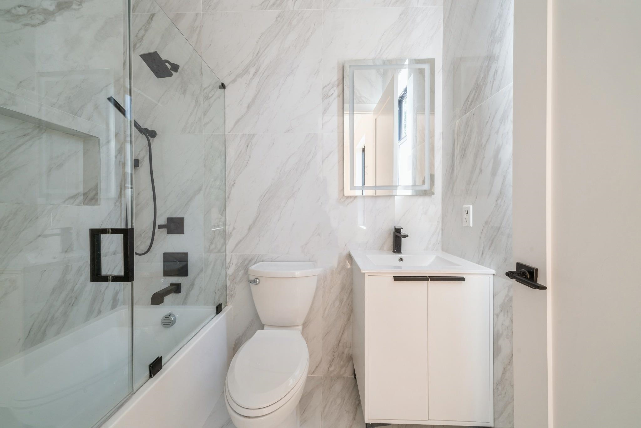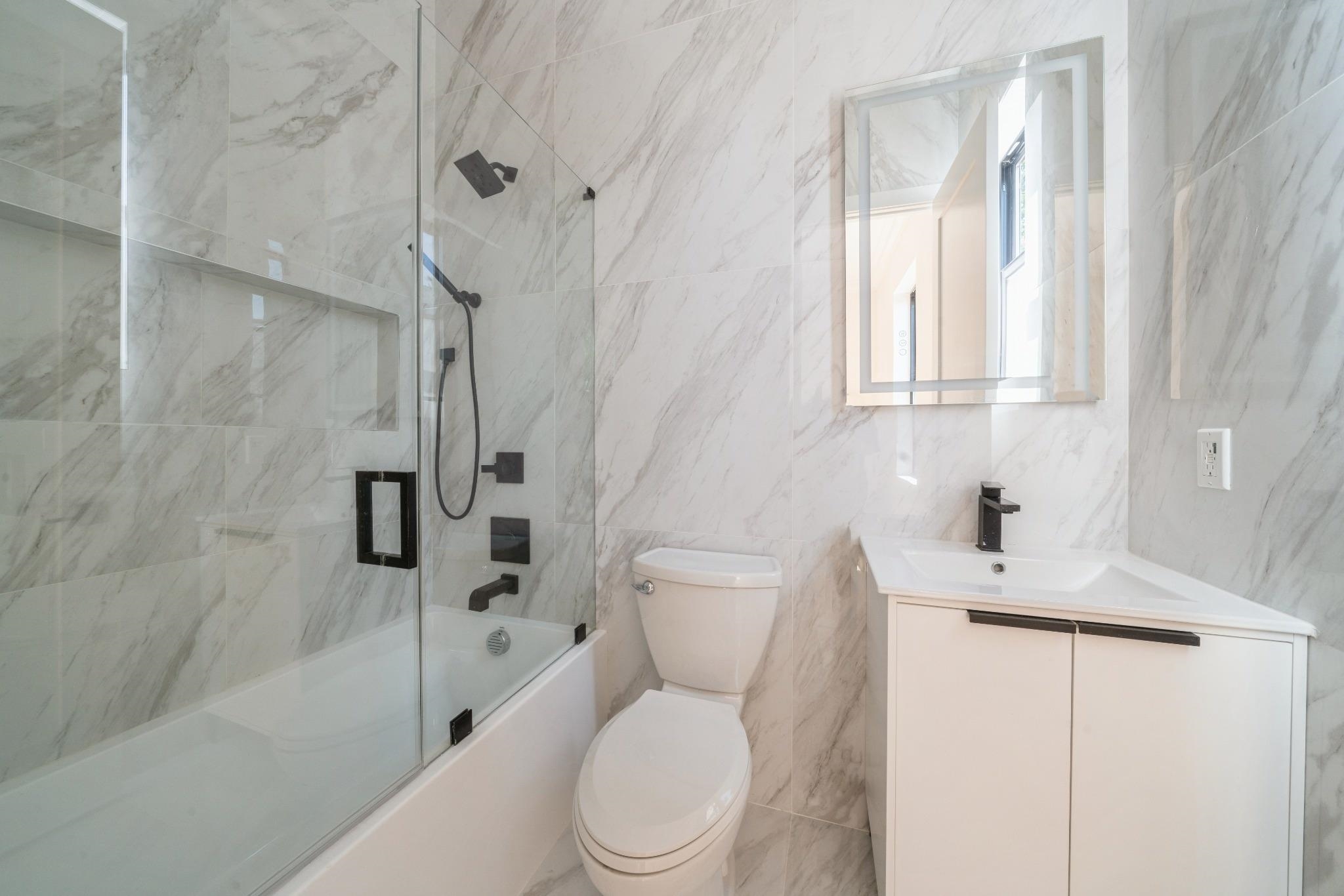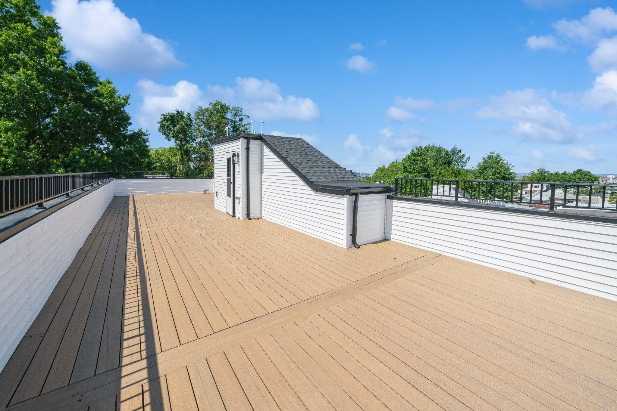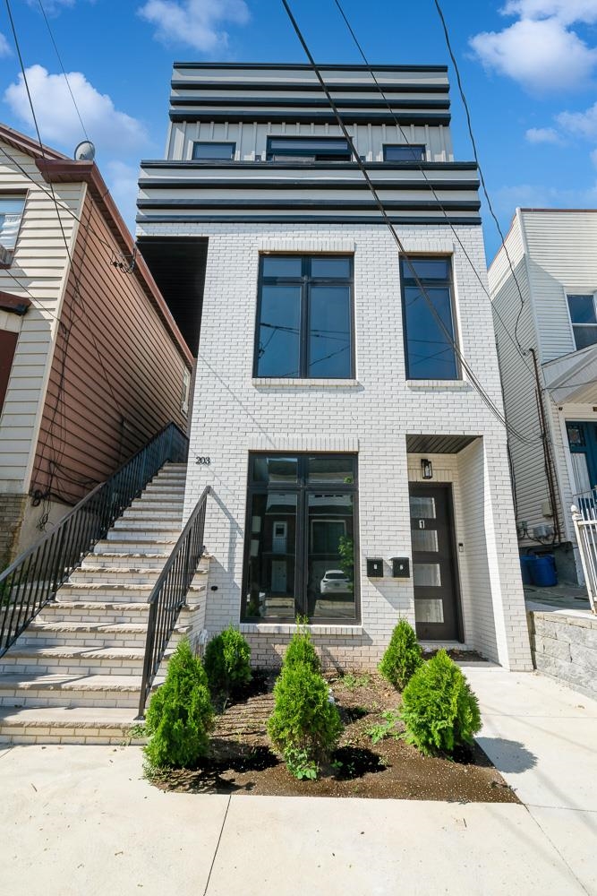 Step into an exceptional top unit duplex at 203 Hutton St where modern design meets timeless craftsmanship in the heart of Jersey City Heights. Spanning over 2,000 square feet, this five-bedroom, three-and-a-half-bath residence combines elegant finishes, abundant natural light, and panoramic skyline views for an elevated living experience. The main level features a bright open layout with 10-foot ceilings, 8-foot custom doors, and wide-plank solid oak flooring throughout. Oversized Andersen windows fill the space with sunlight from multiple exposures. The chef’s kitchen is finished with custom white quartz countertops, stainless-steel appliances, linen-finished cabinetry, a wine fridge, and a full-size washer and dryer, balancing refined style with everyday function. Offering two primary bedrooms featuring ensuite bathrooms, the home provides flexibility and privacy for family or guests. The front and rear bedrooms each include private terraces, creating ideal spots for morning coffee or evening relaxation. Bathrooms are finished in Pastorelli porcelain tile with smart mirrors and premium fixtures, blending modern technology with spa-like comfort. Crowning this residence is a 1,000-square-foot private rooftop deck offering unobstructed views of the Manhattan skyline—a rare outdoor retreat perfect for entertaining or quiet escape. Located just minutes from Pershing Field Park and Riverview-Fisk Park, residents enjoy access to green spaces, playgrounds, and sweeping Hudson River views. Central and Palisade Avenues are moments away, offering local shops, cafés, and restaurants. Bus routes and the Hoboken Light Rail provide quick access to Downtown Jersey City and Manhattan, with an average commute to the World Trade Center of about 35 minutes. 203 Hutton Street, Unit 2 delivers expansive living, timeless craftsmanship, and stunning city views—defining contemporary luxury in the heart of Jersey City Heights.