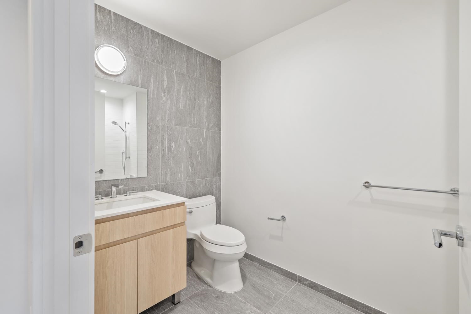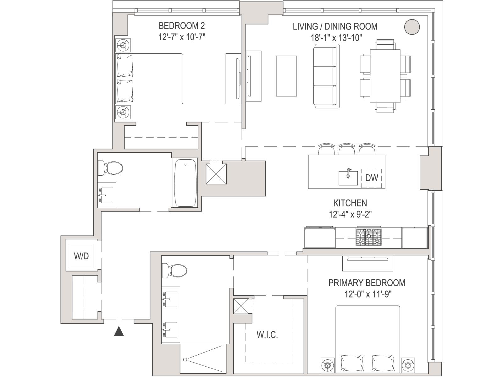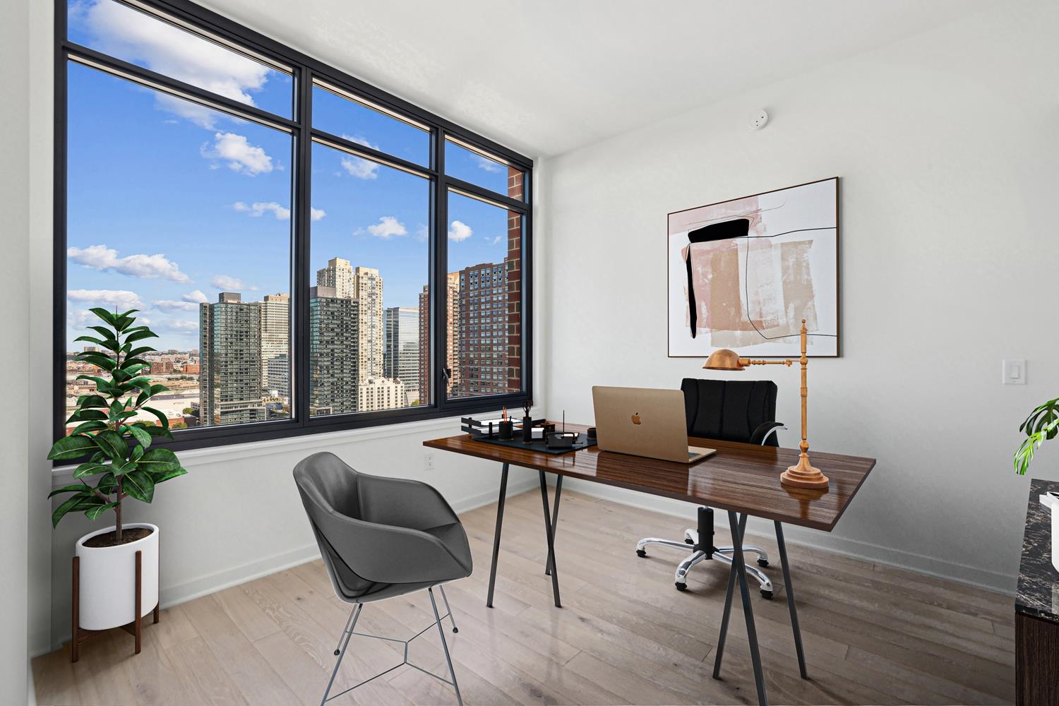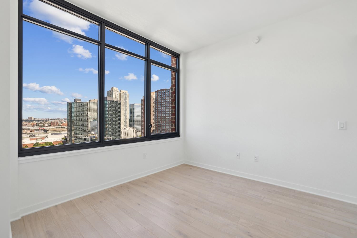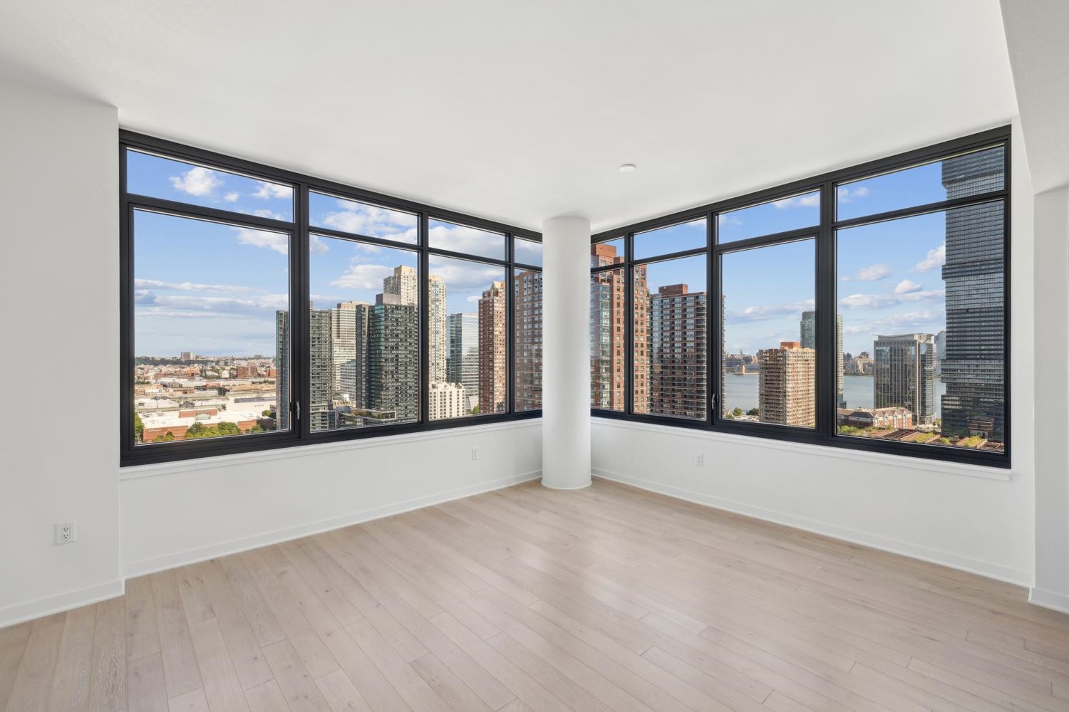 Experience elevated urban living in Residence 1203 at 155 Bay Street, nestled in Jersey City's vibrant Powerhouse Arts District. This thoughtfully designed 1,199 sq. ft. corner two-bedroom, two-bathroom home blends modern form with refined function. Expansive northeast-facing windows flood the space with natural light, enhancing the sleek, minimalist design and white oak flooring. 155 Bay Street features 259 residences distributed over 34 floors, offering an array of options, including studio, one-bedroom, two-bedroom, two-bedroom with den, and three-bedroom layouts. The open-concept kitchen effortlessly integrates the living and dining areas and is appointed with custom Italian walnut and dove gray cabinetry, quartz countertops, and Bosch and Thermador appliances. The primary suite offers a peaceful retreat, featuring a spacious layout and a spa-inspired ensuite bathroom with dual custom vanities, Kohler fixtures, and elegant porcelain tile accents. The second bedroom offers remarkable versatility, easily adapting to either a comfortable bedroom or a sophisticated home office, providing both comfort and functionality for a range of lifestyle needs. Additional highlights include a vented Whirlpool washer and dryer, and 1 deeded parking space. Residents enjoy access to world-class amenities, including a sky lounge, fitness center, outdoor pool, residents' lounge, children's playroom, dog run and spa, and a 24-hour attended lobby. Located just moments from the Grove Street PATH station, this residence offers unparalleled convenience and sophistication.