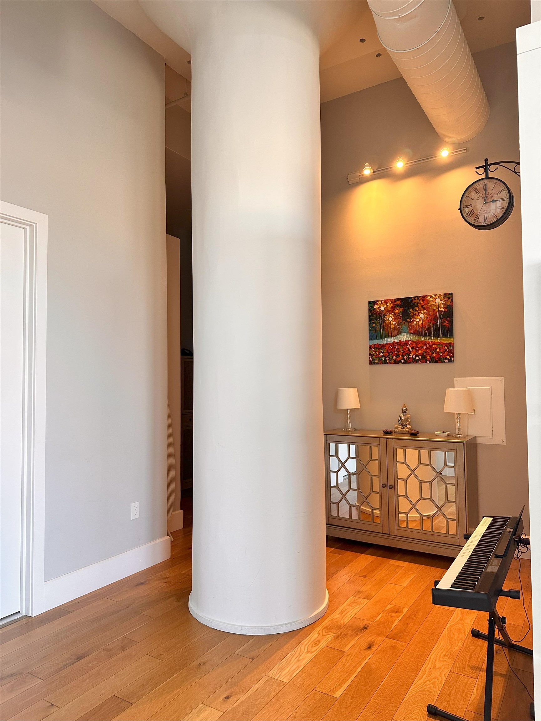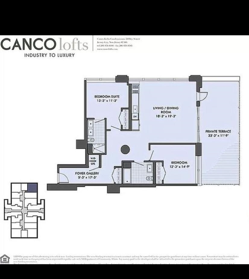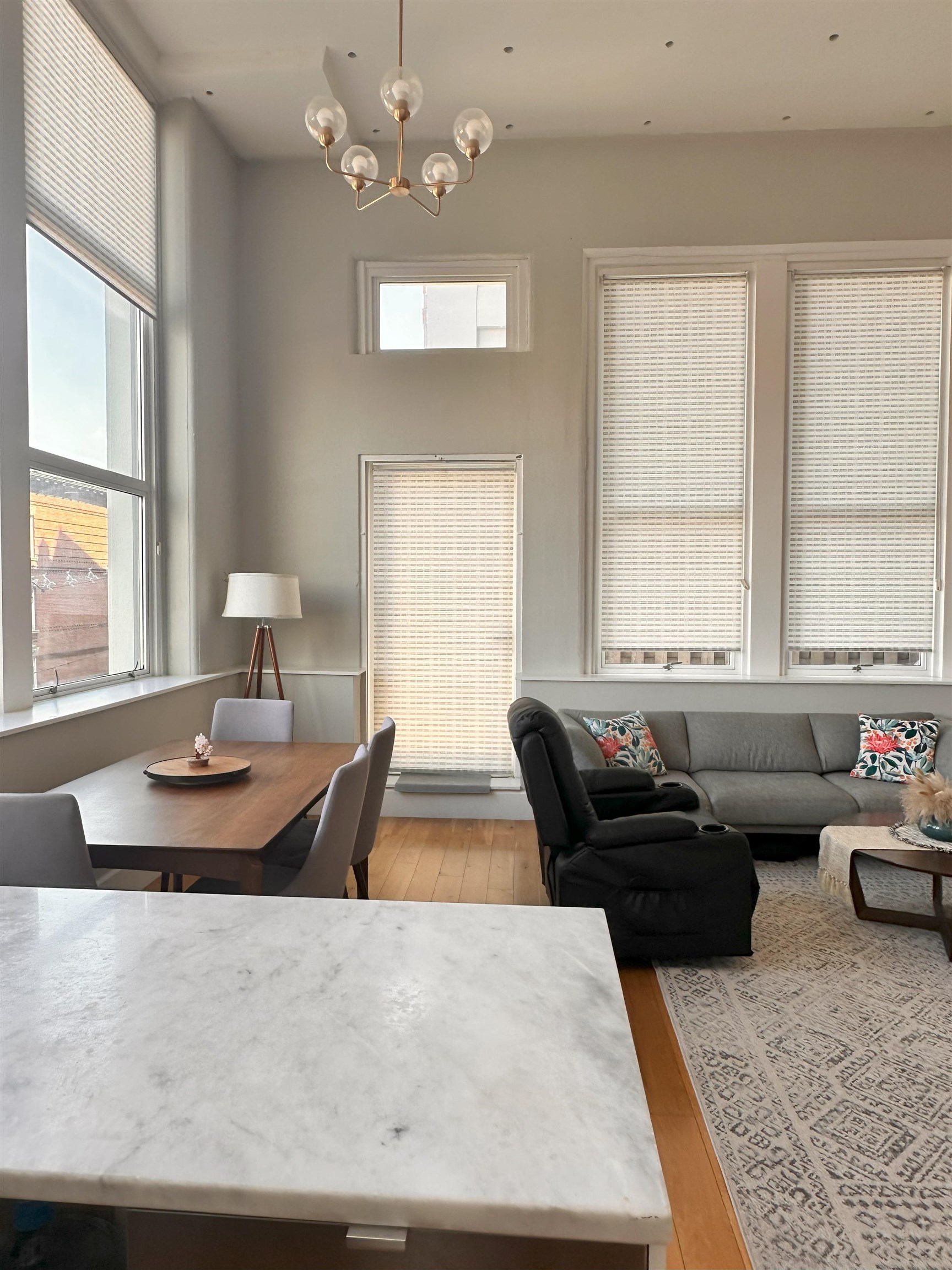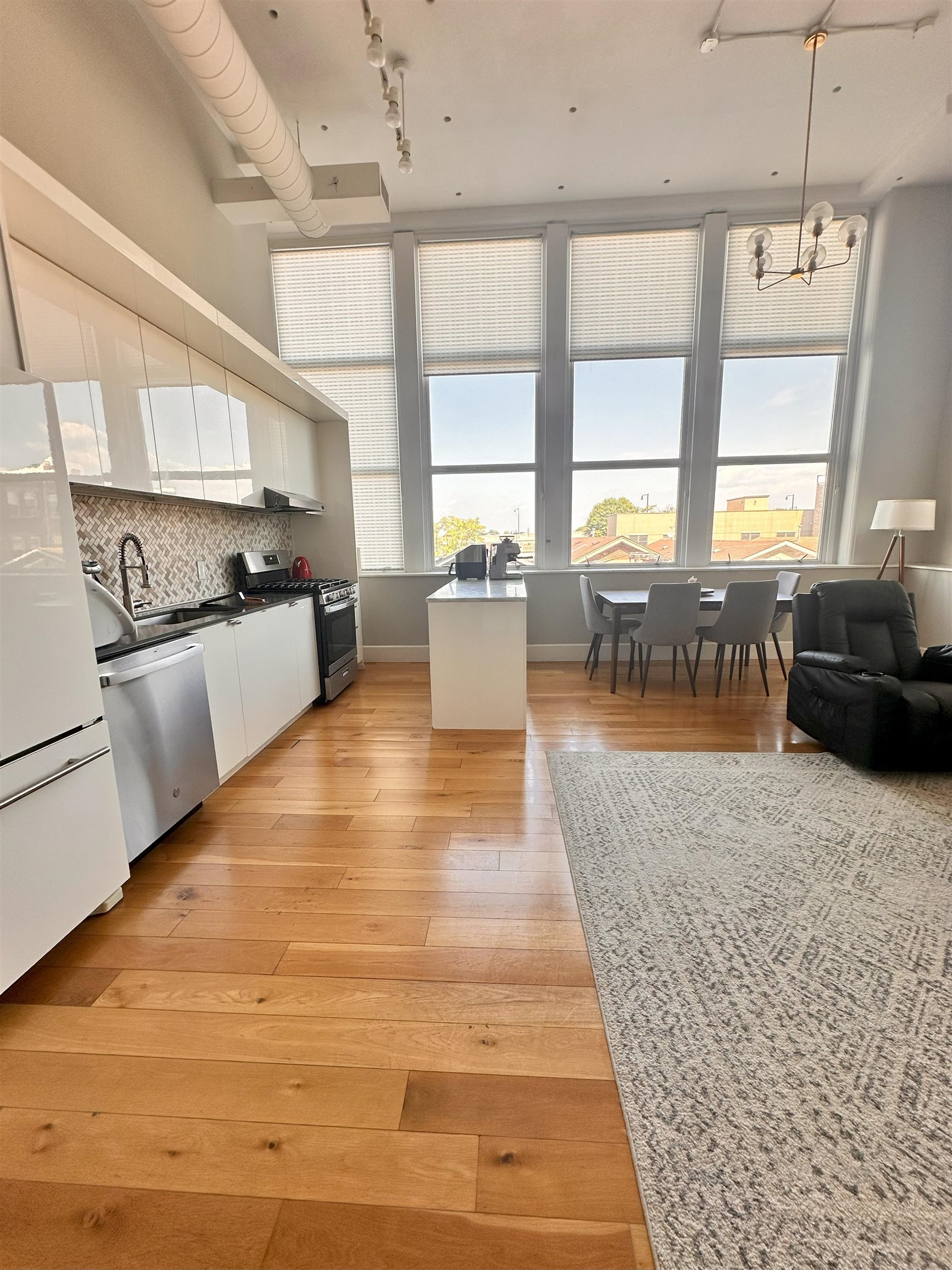 Canco Lofts, a full-service, amenity-rich building in the heart of Journal Square. 1300sq ft 2-bedroom, 2-bathroom condo with soaring 14' ceilings and 11' windows that flood the open-concept living and dining area with an abundance of natural light. Desirable corner unit with a rare 400-square-foot private terrace and a deeded storage unit on the same floor. The primary and guest bedrooms located on opposite sides of the living space. Sleek, modern GE cooking range with oven, range hood, dishwasher and washer-dryer. Brand-new HVAC system installed in 2024 with Nest thermostat. Gorgeous marble mosaic backsplash and a custom island with marble countertop and a deep sink with garbage disposal. Original hardwood floors. Full window blinds, remote controlled ceiling fans in both bedrooms, new faucets and bidet in bathrooms. The terrace is in the process of being refurbished as part of building upgrades and will boast brand new decking by the end of October. Residents of Canco Lofts enjoy an incredible suite of over 10,000 square feet of amenities, including a 24-hour concierge, a state-of-the-art gym with Peloton bikes, Yoga Room, a basketball court, a screening room with recliner seating, an outdoor lounge with BBQ, a dog spa, common recreation lounge with pool tables and catering kitchen, a kids' playroom and in-building rental parking at $250/month. The building offers a private shuttle to the PATH station, making your commute to NYC a breeze. Tax abatement until 2038.