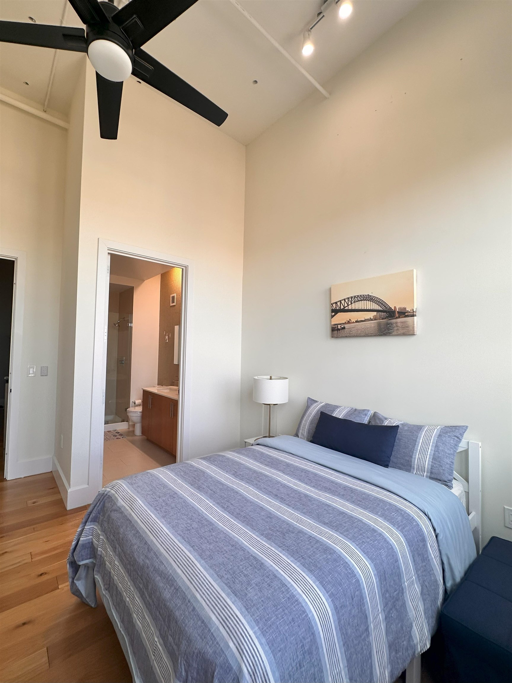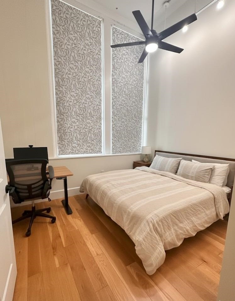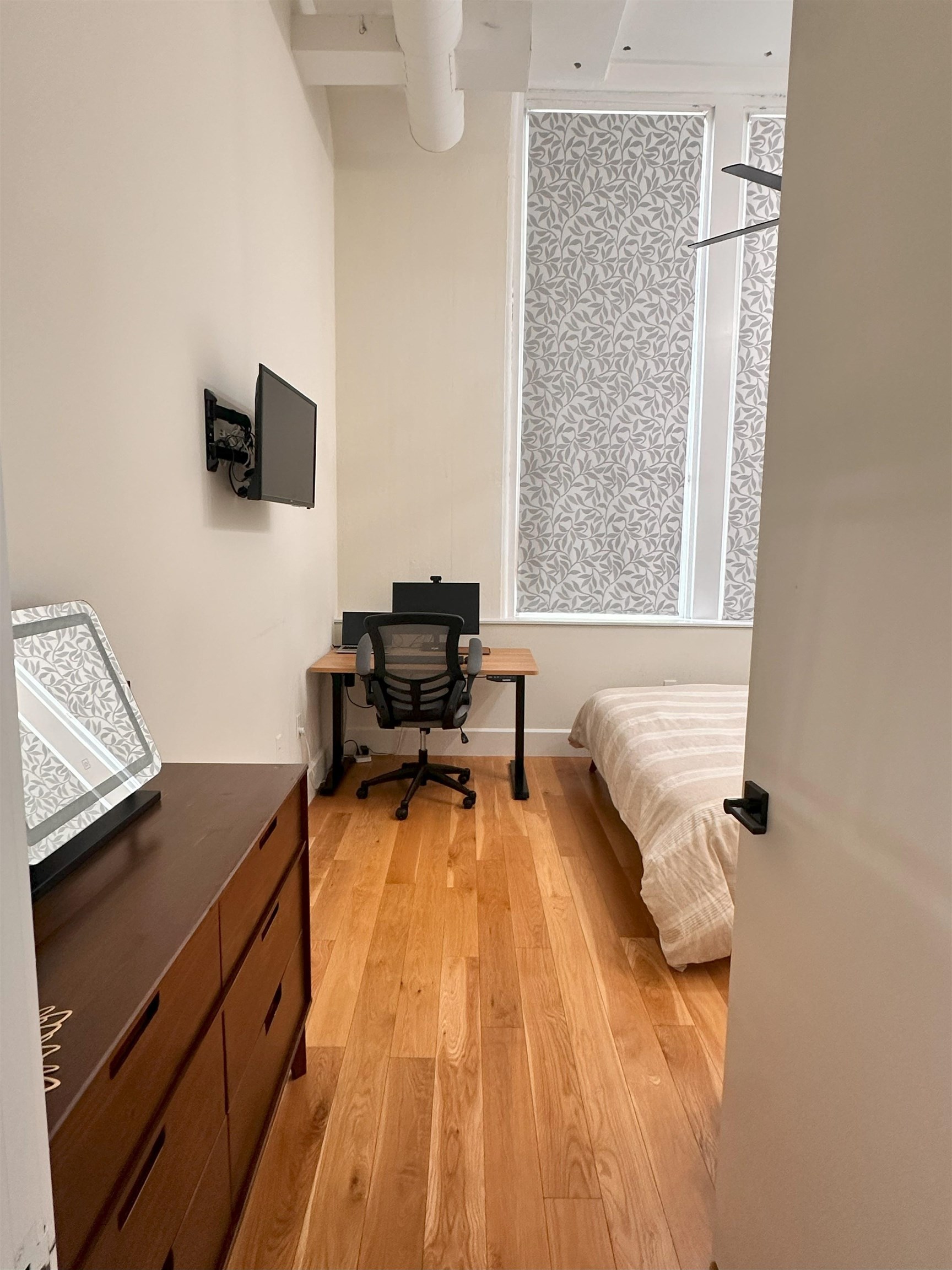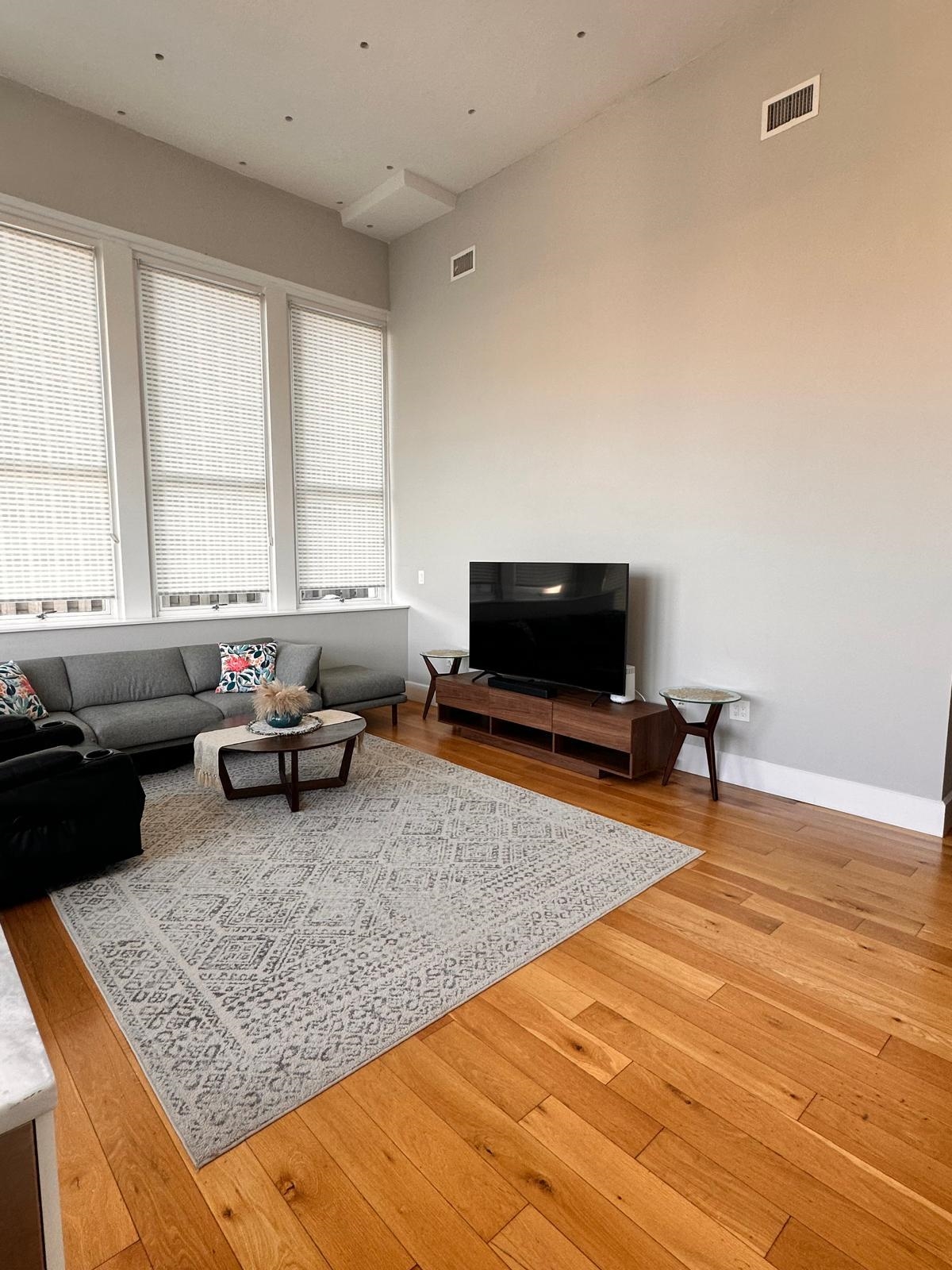 Canco Lofts, a full-service, amenity-rich building in the heart of Journal Square. 1300sq ft 2-bedroom, 2-bathroom condo with soaring 14' ceilings and 11' windows that flood the open-concept living and dining area with an abundance of natural light. Desirable corner unit with a rare 400-square-foot private terrace and a deeded storage unit on the same floor. The primary and guest bedrooms located on opposite sides of the living space. Sleek, modern GE cooking range with oven, range hood, dishwasher and washer-dryer. Brand-new HVAC system installed in 2024 with Nest thermostat. Gorgeous marble mosaic backsplash and a custom island with marble countertop and a deep sink with garbage disposal. Original hardwood floors. Full window blinds, remote controlled ceiling fans in both bedrooms, new faucets and bidet in bathrooms. The terrace is in the process of being refurbished as part of building upgrades and will boast brand new decking by the end of October. Residents of Canco Lofts enjoy an incredible suite of over 10,000 square feet of amenities, including a 24-hour concierge, a state-of-the-art gym with Peloton bikes, Yoga Room, a basketball court, a screening room with recliner seating, an outdoor lounge with BBQ, a dog spa, common recreation lounge with pool tables and catering kitchen, a kids' playroom and in-building rental parking at $250/month. The building offers a private shuttle to the PATH station, making your commute to NYC a breeze. Tax abatement until 2038.