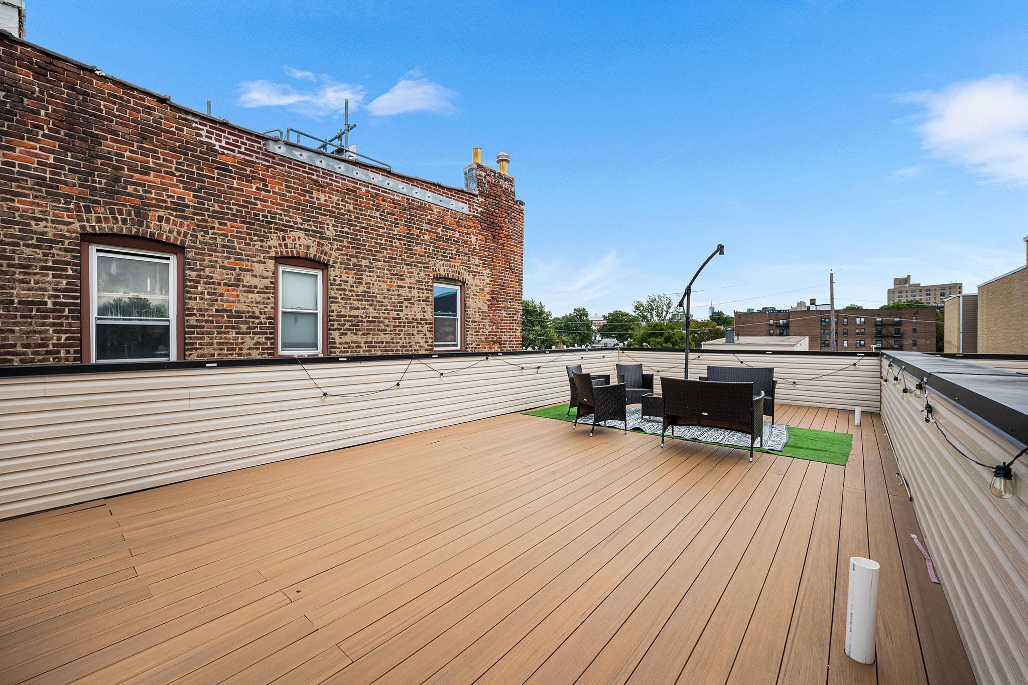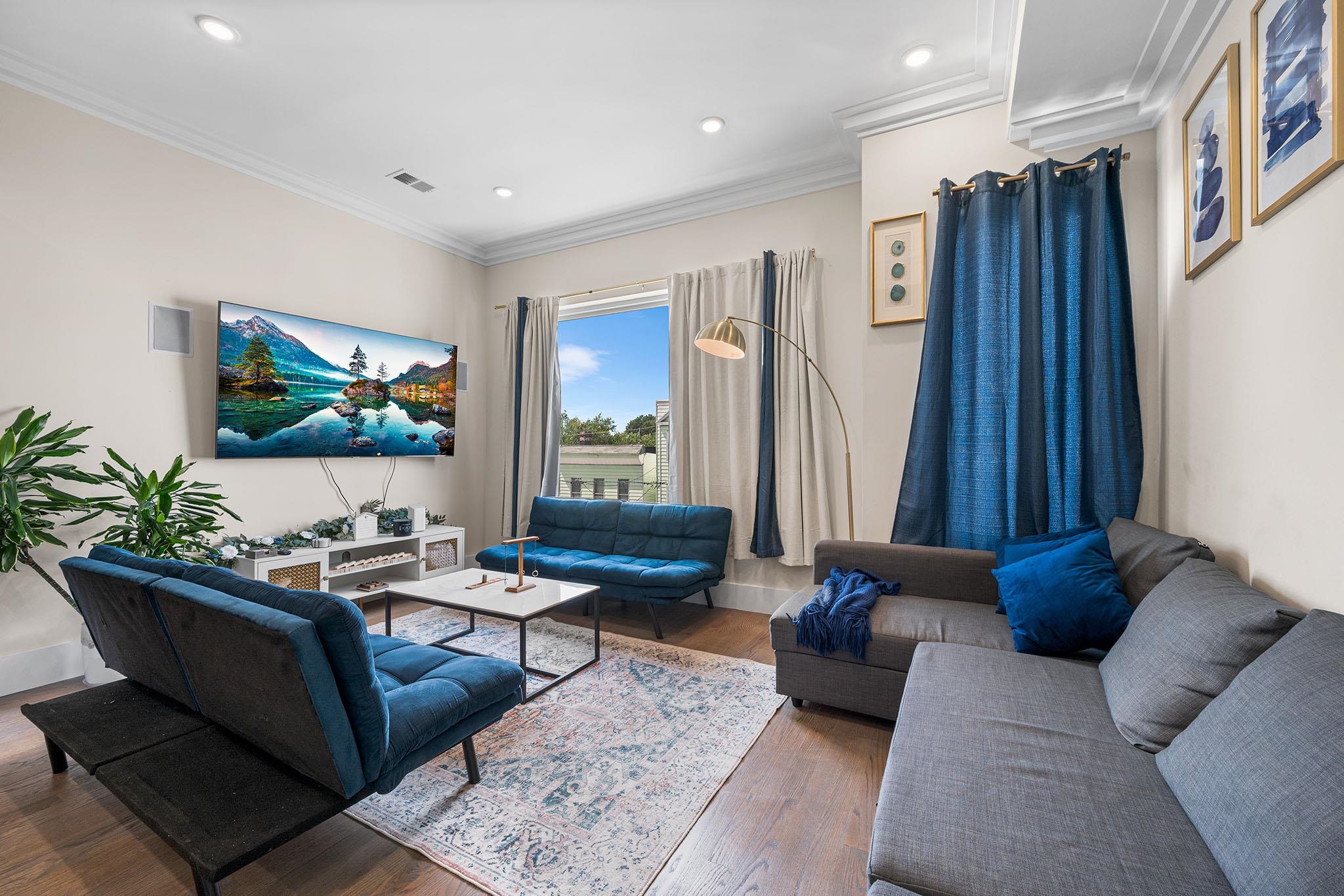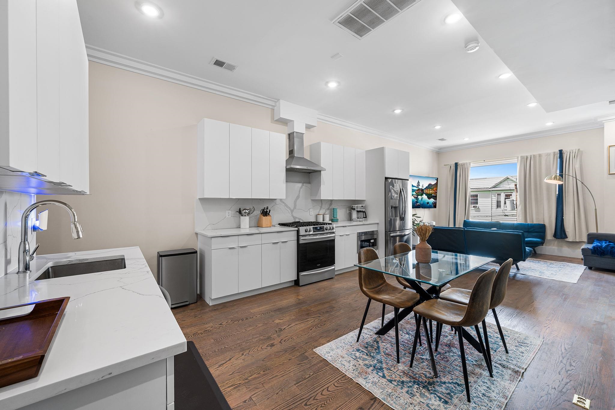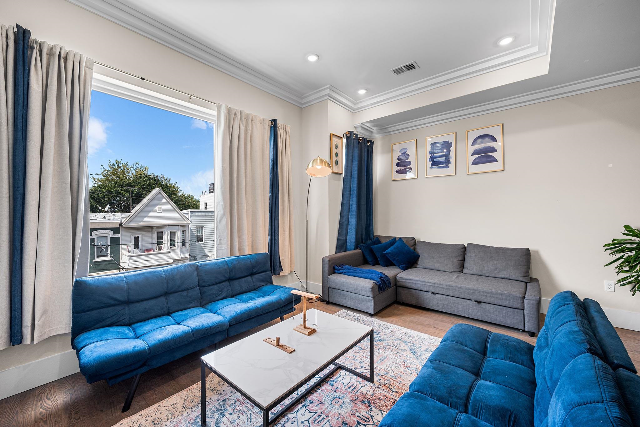 Experience modern luxury in these brand-new, designer-finished three-bedroom homes just steps from Lincoln Park. Whether you’re entertaining on your private rooftop with sweeping city views, enjoying the spacious backyard, or parking with ease in the tandem garage, this residence offers the ultimate urban lifestyle. Sunlight pours through oversized windows, highlighting the elegant crown molding and hardwood floors throughout. The sleek, modern kitchen is a true centerpiece, featuring waterfall quartz counters, custom cabinetry, and stainless steel appliances. A dramatic glass staircase leads upstairs to the fully finished rooftop—a show-stopping retreat perfect for relaxing or entertaining. The primary suite boasts a built-out walk-in closet, private balcony overlooking the backyard, and a spa-like en-suite bath with a glass shower, smart mirror, and natural light. Additional thoughtfully designed bathrooms and generous living space provide comfort and style at every turn. Tucked on a quiet residential street, you’ll be just blocks from the 275-acre Lincoln Park and the 18-hole Skyway Golf Course. With nearby shops, restaurants, and easy access to the Lightrail, PATH trains, and major highways, this home seamlessly blends luxury with convenience in the heart of Jersey City.