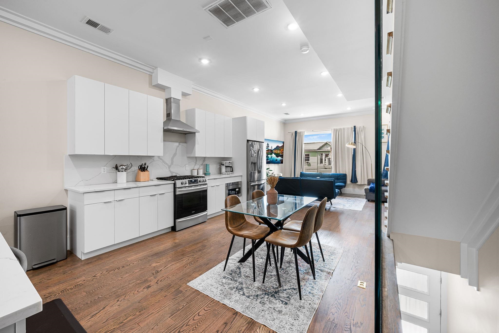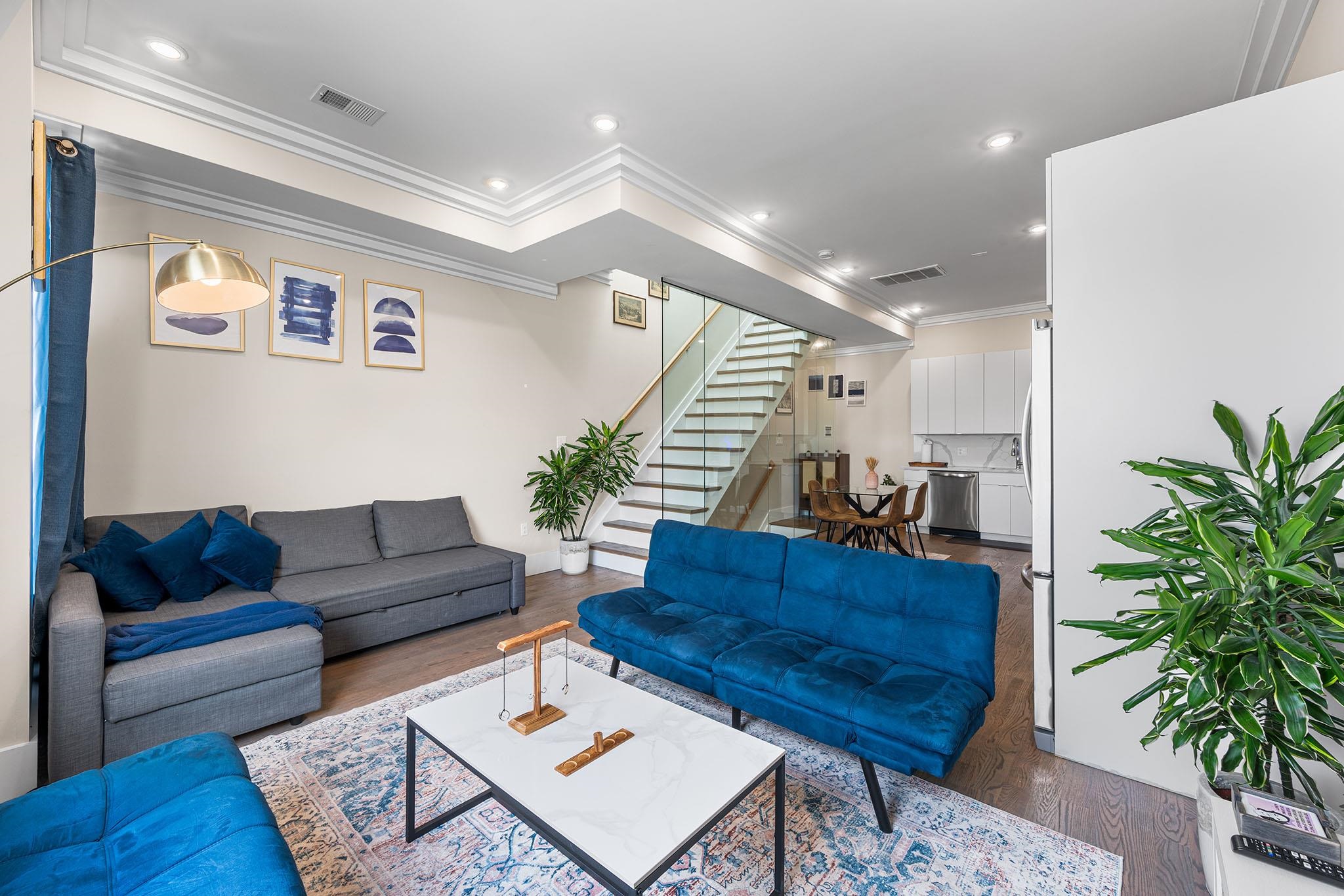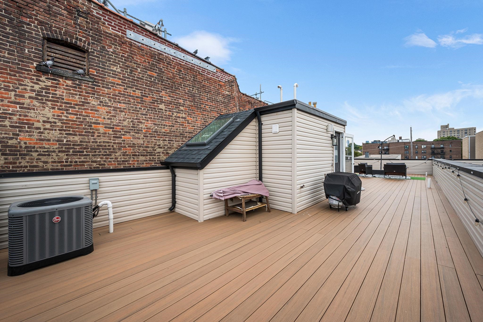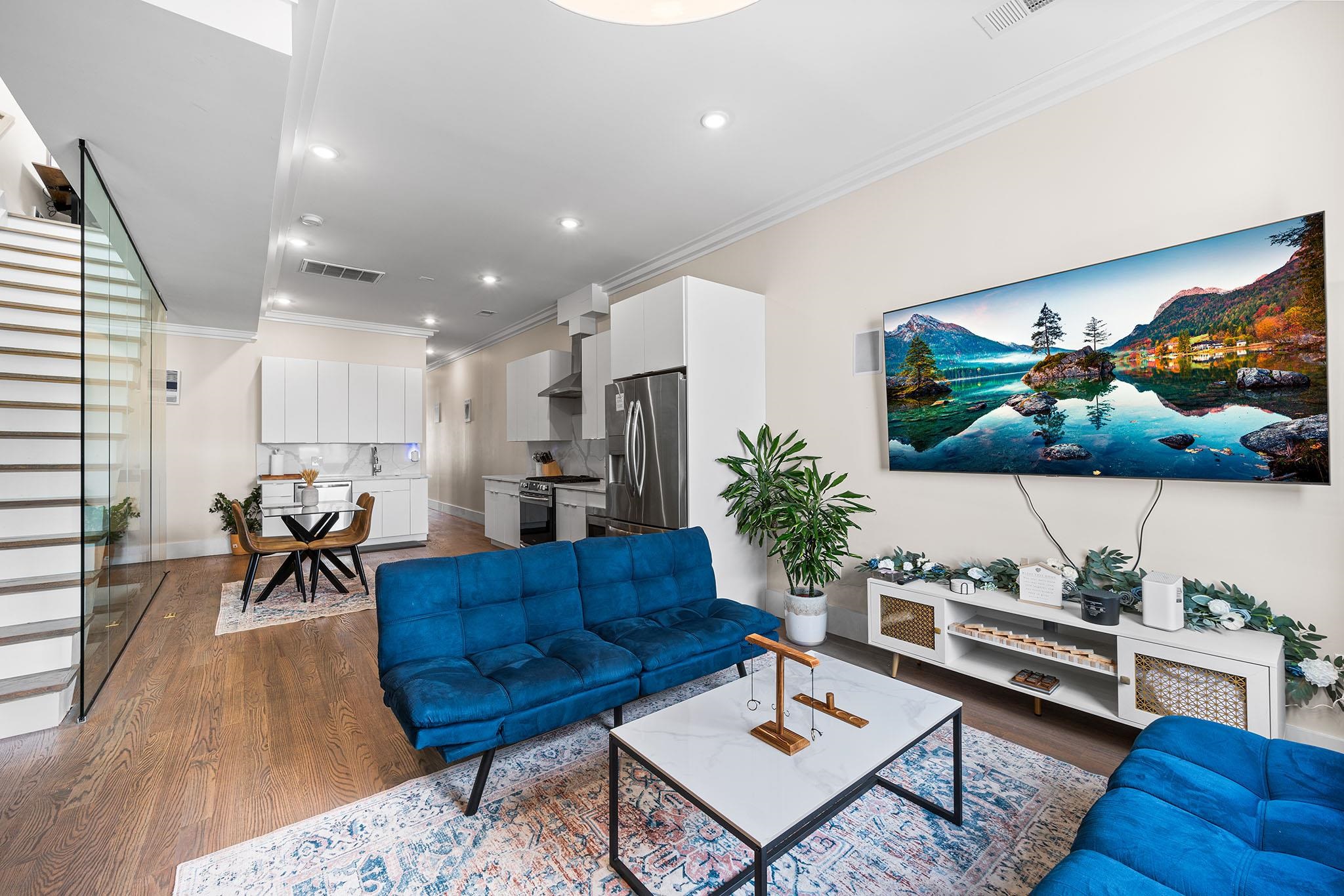 Experience modern luxury in these brand-new, designer-finished three-bedroom homes just steps from Lincoln Park. Whether you’re entertaining on your private rooftop with sweeping city views, enjoying the spacious backyard, or parking with ease in the tandem garage, this residence offers the ultimate urban lifestyle. Sunlight pours through oversized windows, highlighting the elegant crown molding and hardwood floors throughout. The sleek, modern kitchen is a true centerpiece, featuring waterfall quartz counters, custom cabinetry, and stainless steel appliances. A dramatic glass staircase leads upstairs to the fully finished rooftop—a show-stopping retreat perfect for relaxing or entertaining. The primary suite boasts a built-out walk-in closet, private balcony overlooking the backyard, and a spa-like en-suite bath with a glass shower, smart mirror, and natural light. Additional thoughtfully designed bathrooms and generous living space provide comfort and style at every turn. Tucked on a quiet residential street, you’ll be just blocks from the 275-acre Lincoln Park and the 18-hole Skyway Golf Course. With nearby shops, restaurants, and easy access to the Lightrail, PATH trains, and major highways, this home seamlessly blends luxury with convenience in the heart of Jersey City.