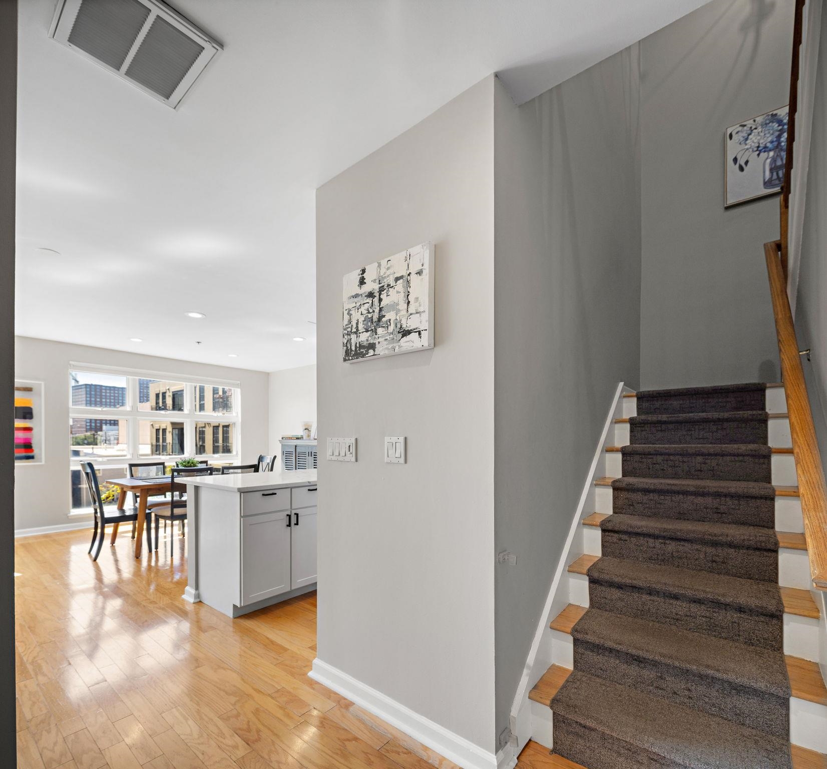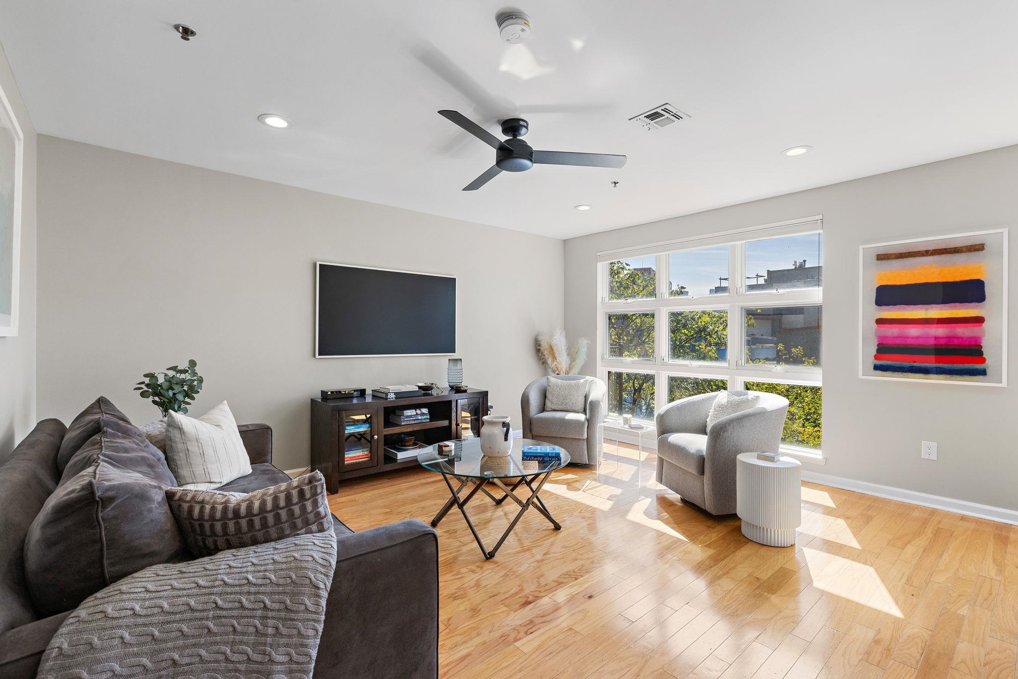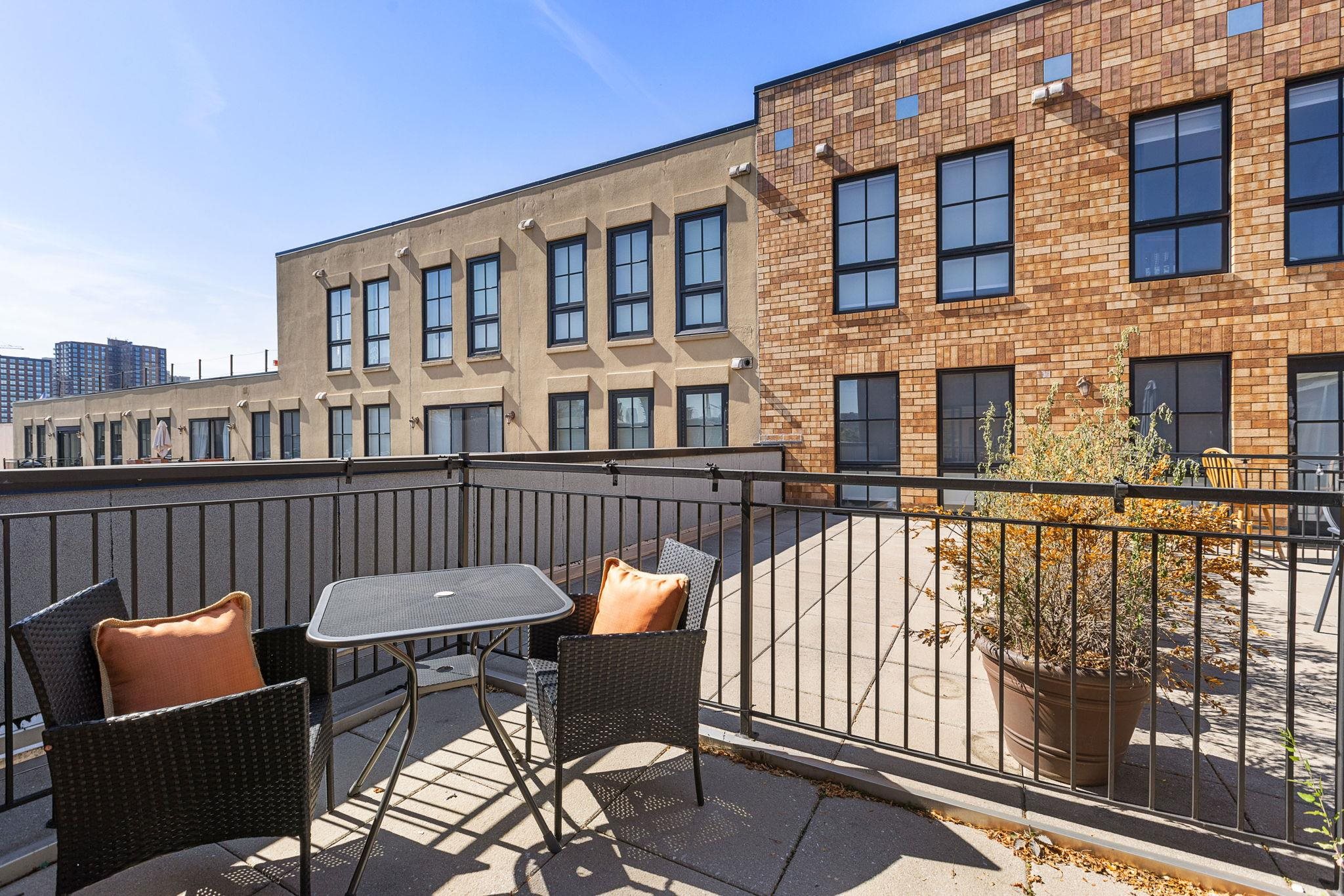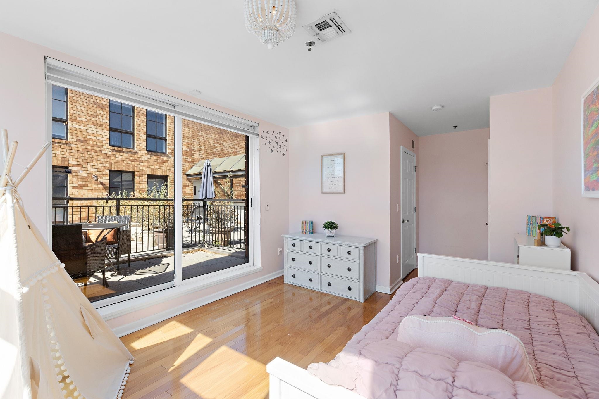 Experience elevated Hoboken living in this striking top-floor duplex residence at Harrison Court, a sought-after steel-and-concrete elevator building known for its modern amenities and prime location near Southwest Park. Residence 410 offers 2 bedrooms, 2 baths with 1366 square feet of living space and onsite garage parking. Step into an open, sunlit living space anchored by floor-to-ceiling windows that bring the outdoors in and fill the home with natural light. The chef-inspired kitchen features sleek quartz countertops, a large center island, stainless steel appliances, and custom cabinetry — creating the perfect hub for cooking, dining, and entertaining. Enjoy a seamless flow from your spacious living room and designated dining area & your kitchen without missing a beat. The main level also includes a renovated full bathroom, in-unit washer/dryer, and a spacious entry closet for extra storage. Upstairs, retreat to a tranquil primary suite with a beautifully updated ensuite bathroom and custom walk-in closet. The second bedroom offers versatility for guests or a home office — and opens to a private balcony where you can enjoy your morning coffee or evening relaxation. Throughout the home, hardwood floors add warmth and sophistication, while thoughtful design maximizes space and light at every turn. Residents of Harrison Court enjoy access to a fitness room, common rooftop terrace, and shared courtyard, plus secure video-monitored entry for peace of mind. This home also includes one deeded garage parking space for ultimate convenience. Set within the thriving neighborhood of Southwest Hoboken, you’re just steps from the 2nd Street Light Rail, the new Southwest Resiliency Park with pickle ball and basketball courts, and an ever-growing selection of neighborhood cafés, restaurants, and boutiques. Easy access to downtown Hoboken, PATH, and major highways make commuting a breeze-all while coming home to a peaceful, design forward space. 659 1st Street offers the perfect blend of style, comfort and convenience.