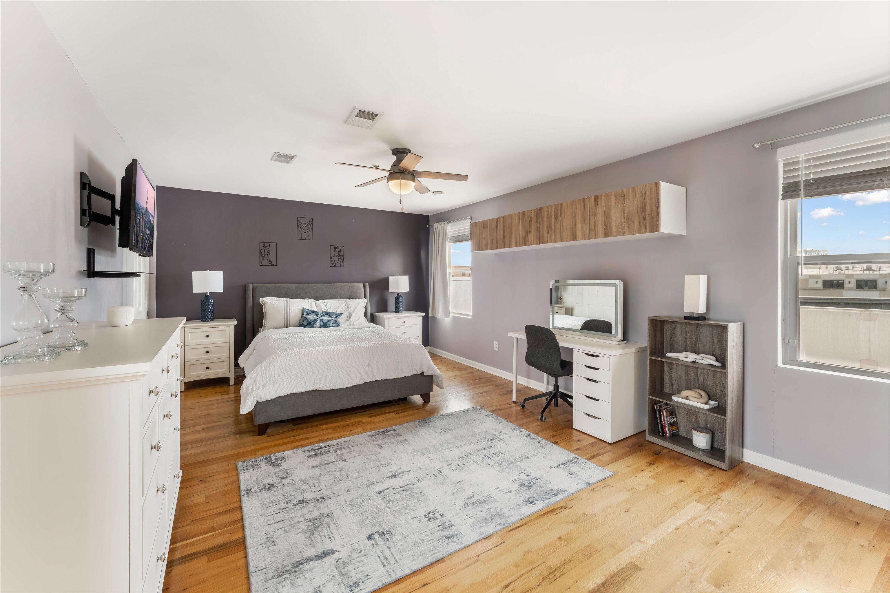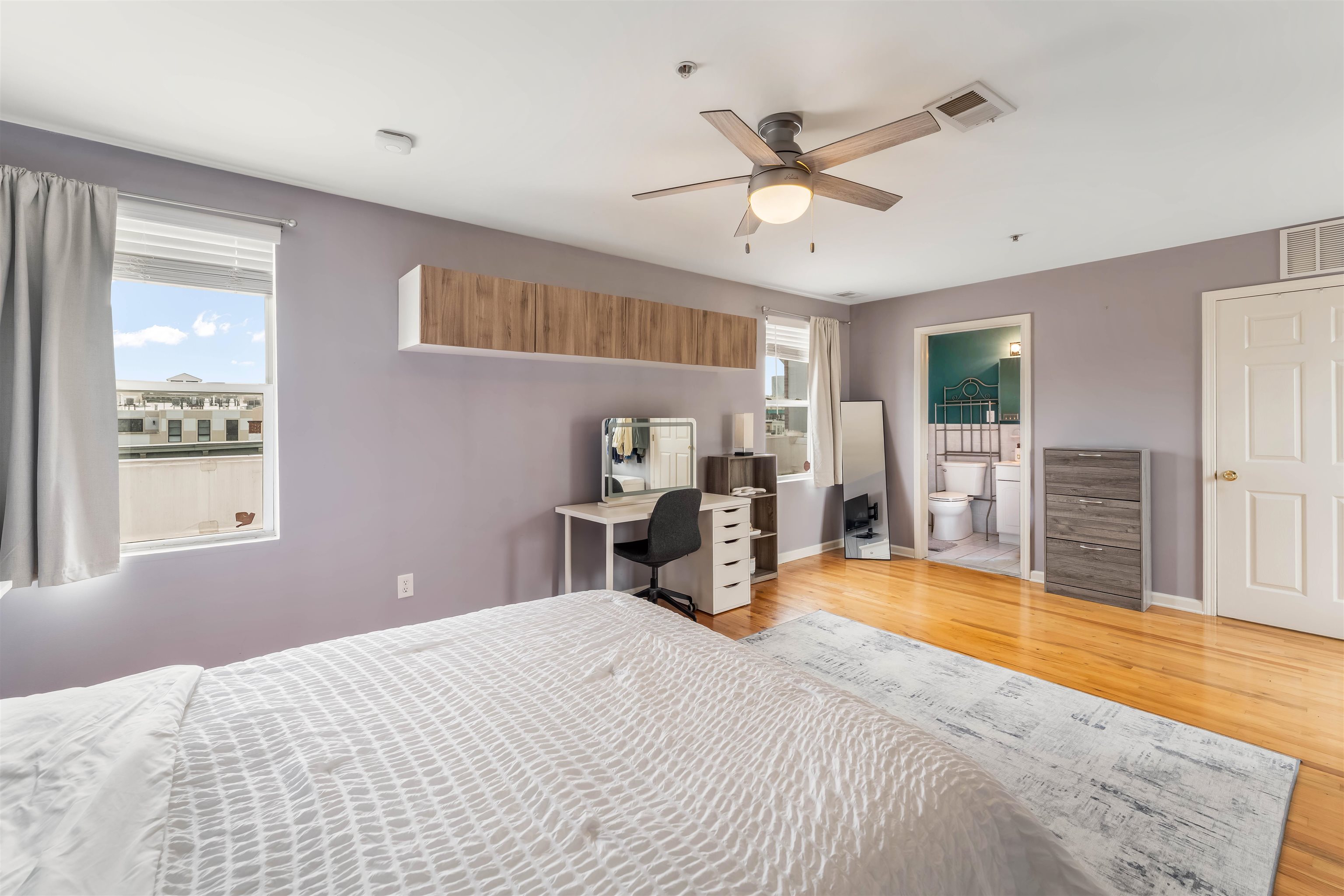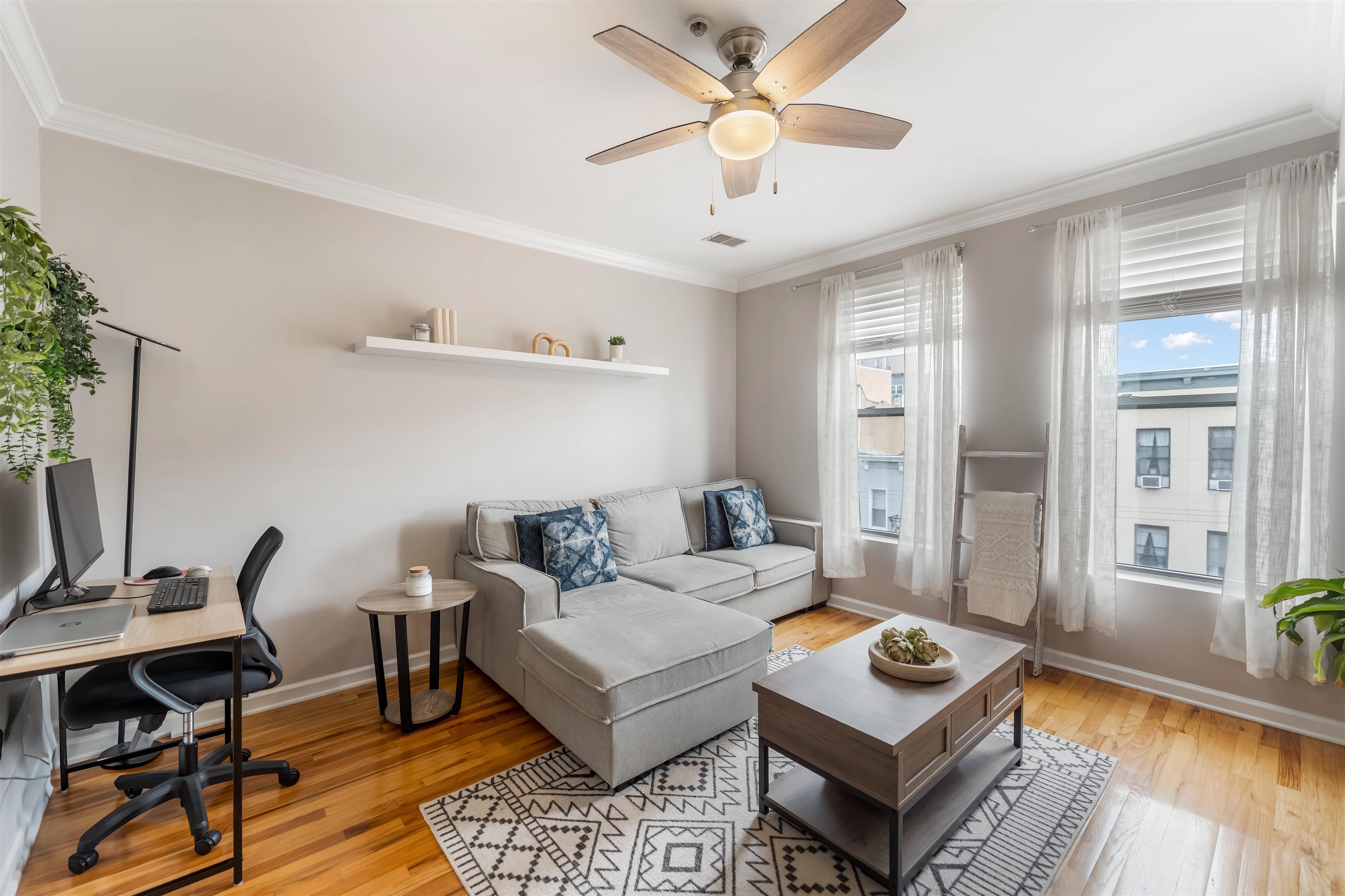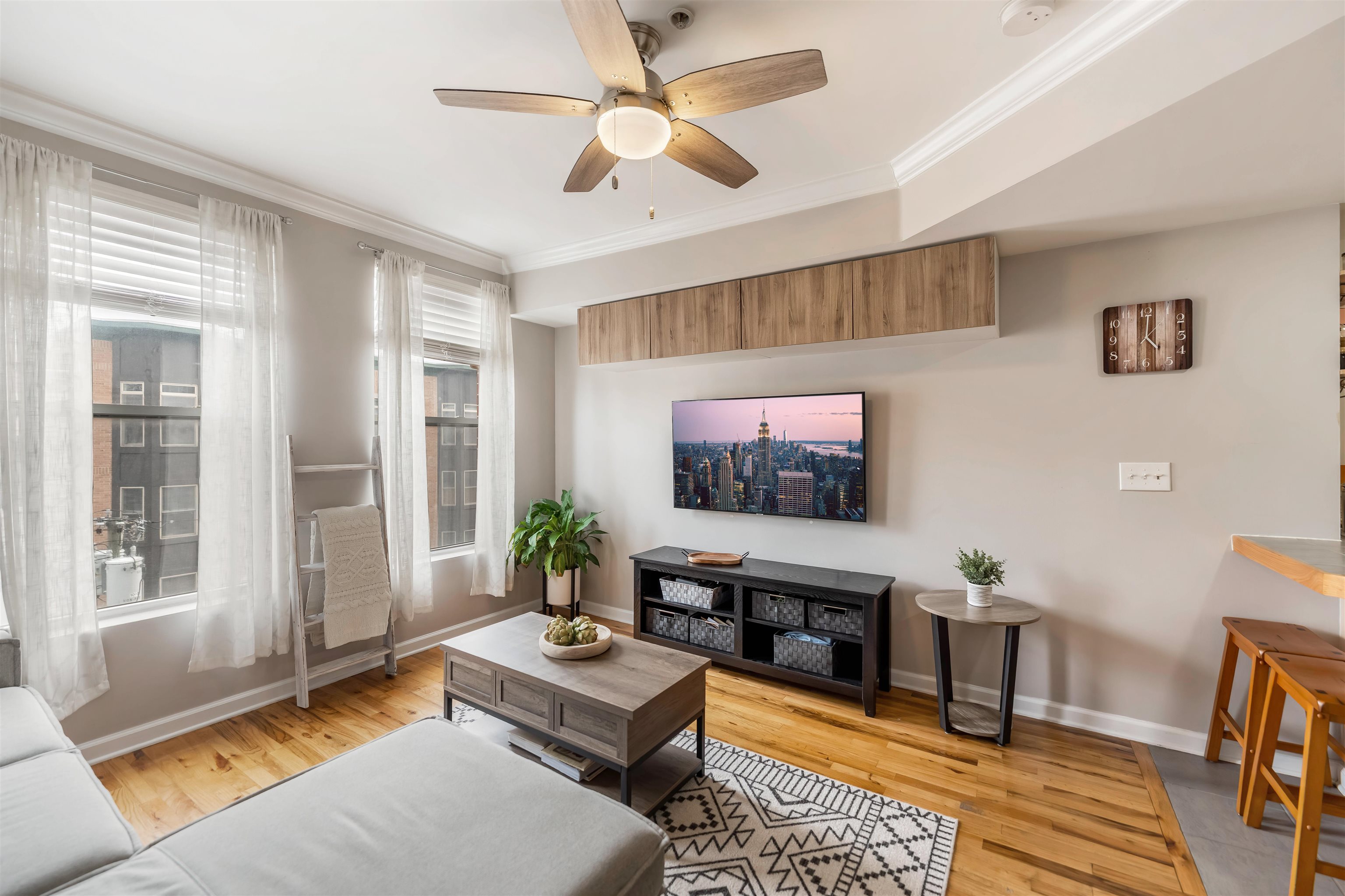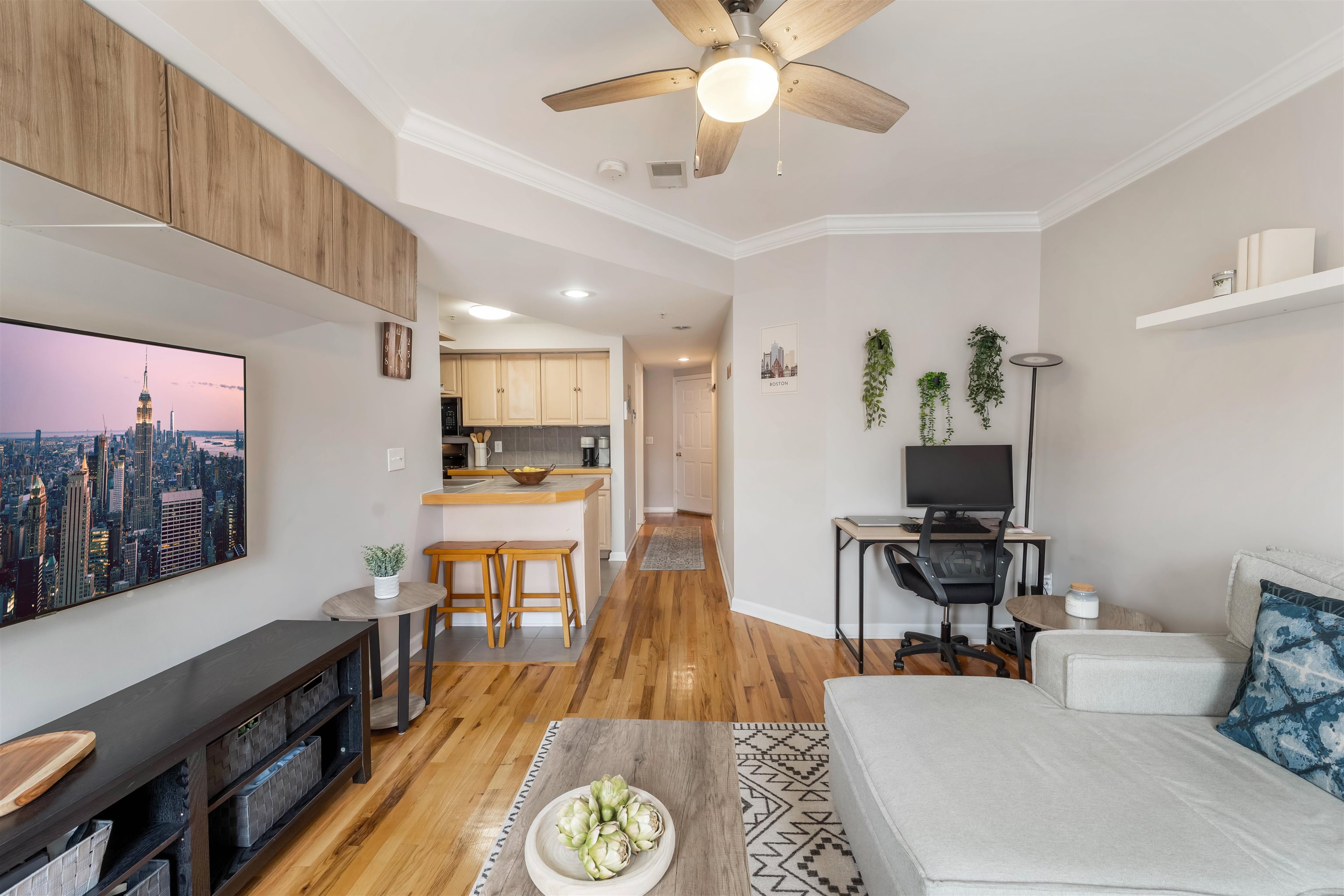 Welcome to this top floor duplex condominium boasting 1 bedroom and 1.5 bathrooms across 745 square feet of thoughtfully crafted living space. As you enter, you'll find a welcoming living area ideal for both entertaining and relaxation. The open kitchen is designed for culinary creativity, featuring a breakfast bar for two. A practical half bath completes this level. Ascend to the second level to discover an expansive bedroom with a walk-in closet and a full bathroom, offering a serene retreat. There's ample space to create a sitting area or a dedicated workspace. Enjoy stunning NYC views, the comfort of central air, and the convenience of an in-unit washer and dryer. Hardwood floors complement modern conveniences, including a Nest thermostat and a SimpliSafe security system. The building enhances your experience with an elevator and a shared backyard for outdoor enjoyment. Nestled in a lively neighborhood, you’re just steps away from NYC transportation, the Light Rail, and the Monroe Center, which offers dining, fitness facilities, and various businesses. Nearby, you'll find the 9th Street Light Rail, ACME, ShopRite, and an array of trendy shops and restaurants. Seize the chance to experience sophisticated urban living in one of Hoboken's most sought-after areas. Make this Hoboken gem your own!