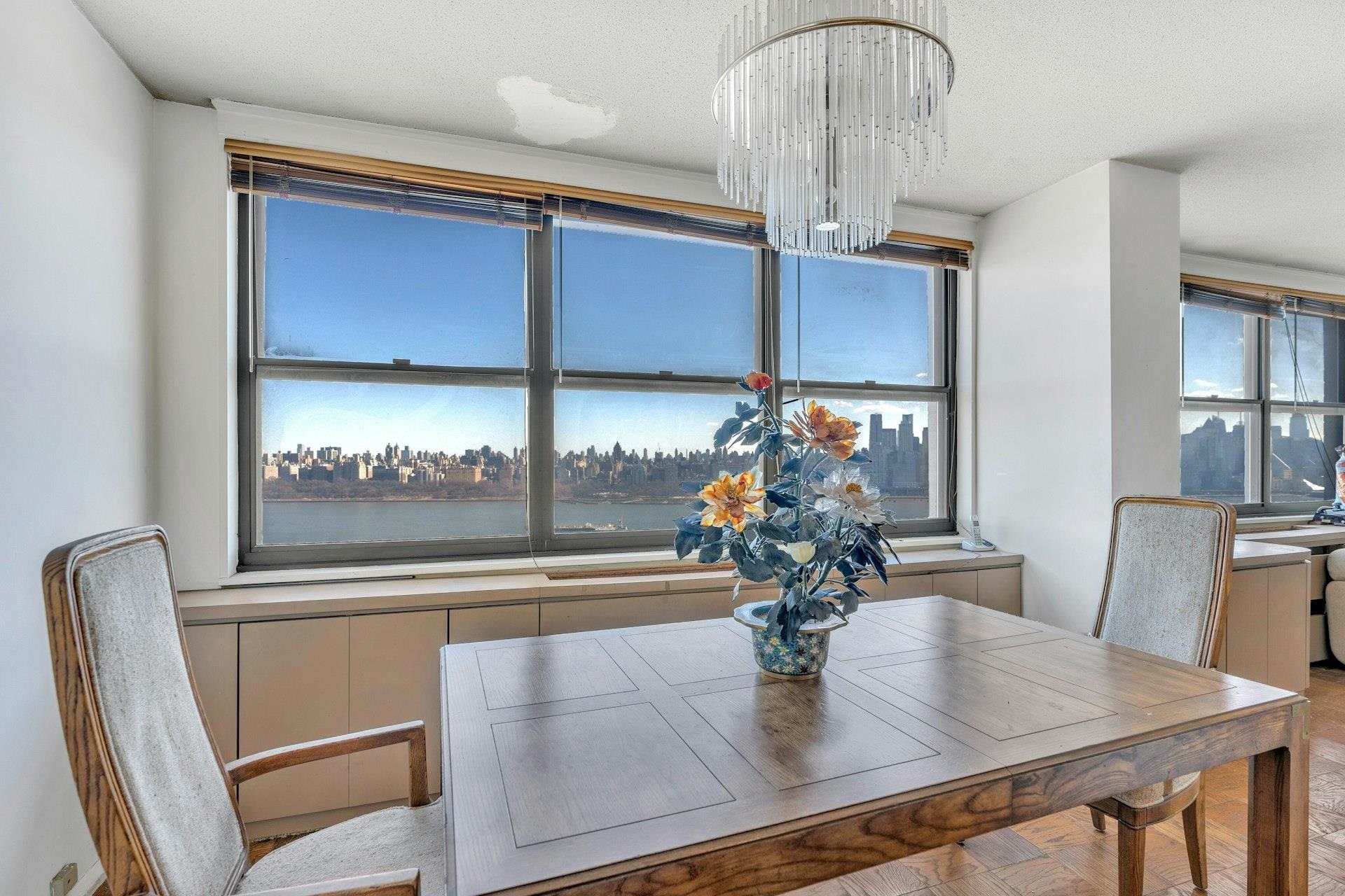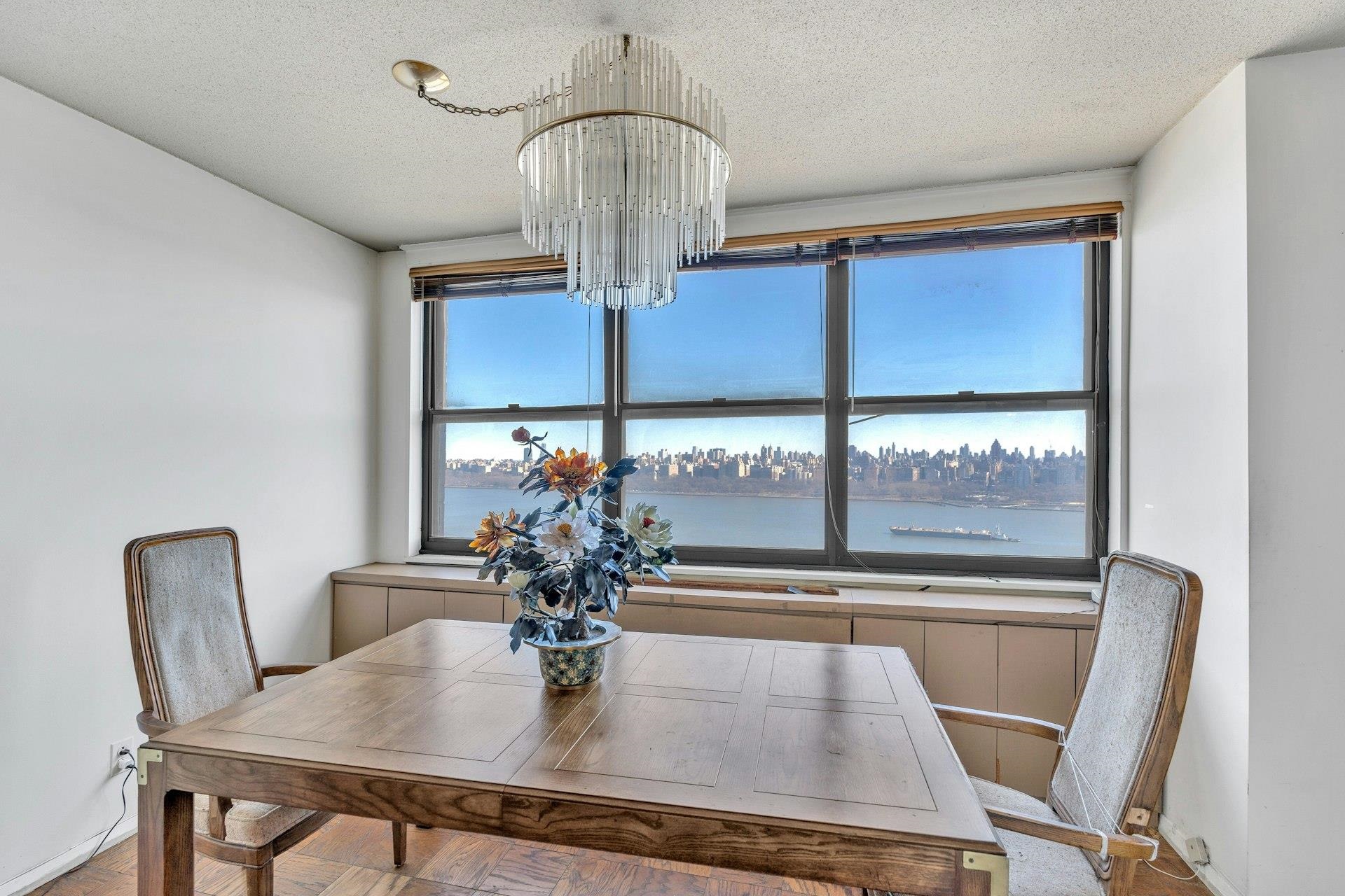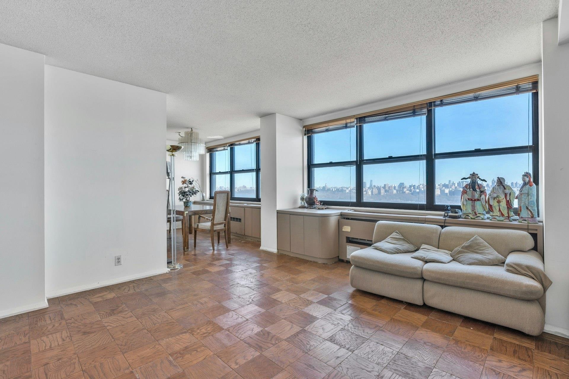 Spacious open floor plan overlooking Hudson River and amazing NYC skyline views with formal dining and living area. Perfect for any holiday entertaining . Modernkitchen with granite countertops and stainless steel appliances. New hardwood floors, custom gigantic closets, Renovated modern bathrooms. Maintenance includes 24 hour concierge and security, spa and health club and all utilities! PARKING IS $120/M/SP. Full service Building w/ Hotel amenities, On-site Million dollar Health Club-I/O Pools, Tennis, State of Art Gym Equipments, Sauna/ Steam Rm, Kiddy rooms & more. Shops on Premises- Cafe, bar/restaurant, mini market, liquor store, pharmacy, salons, library, dry cleaner and more.Transportation at Doorsteps, 20 min to Manhattan,. 10-15 mins to Edgewater Shopping, Whole foods and Traders Joe.