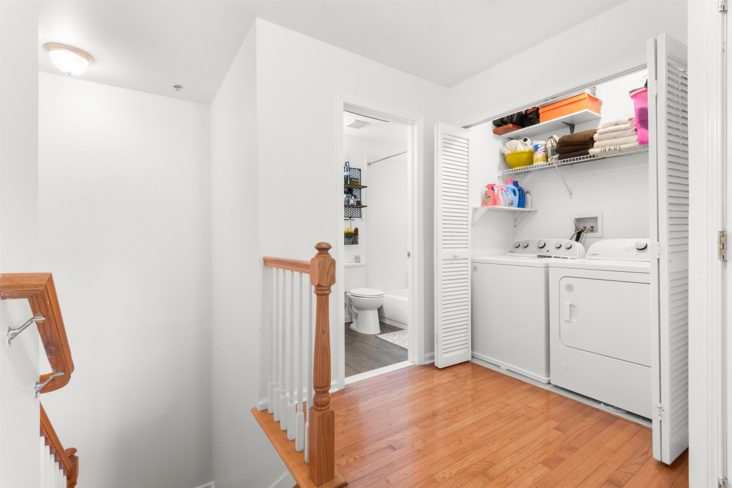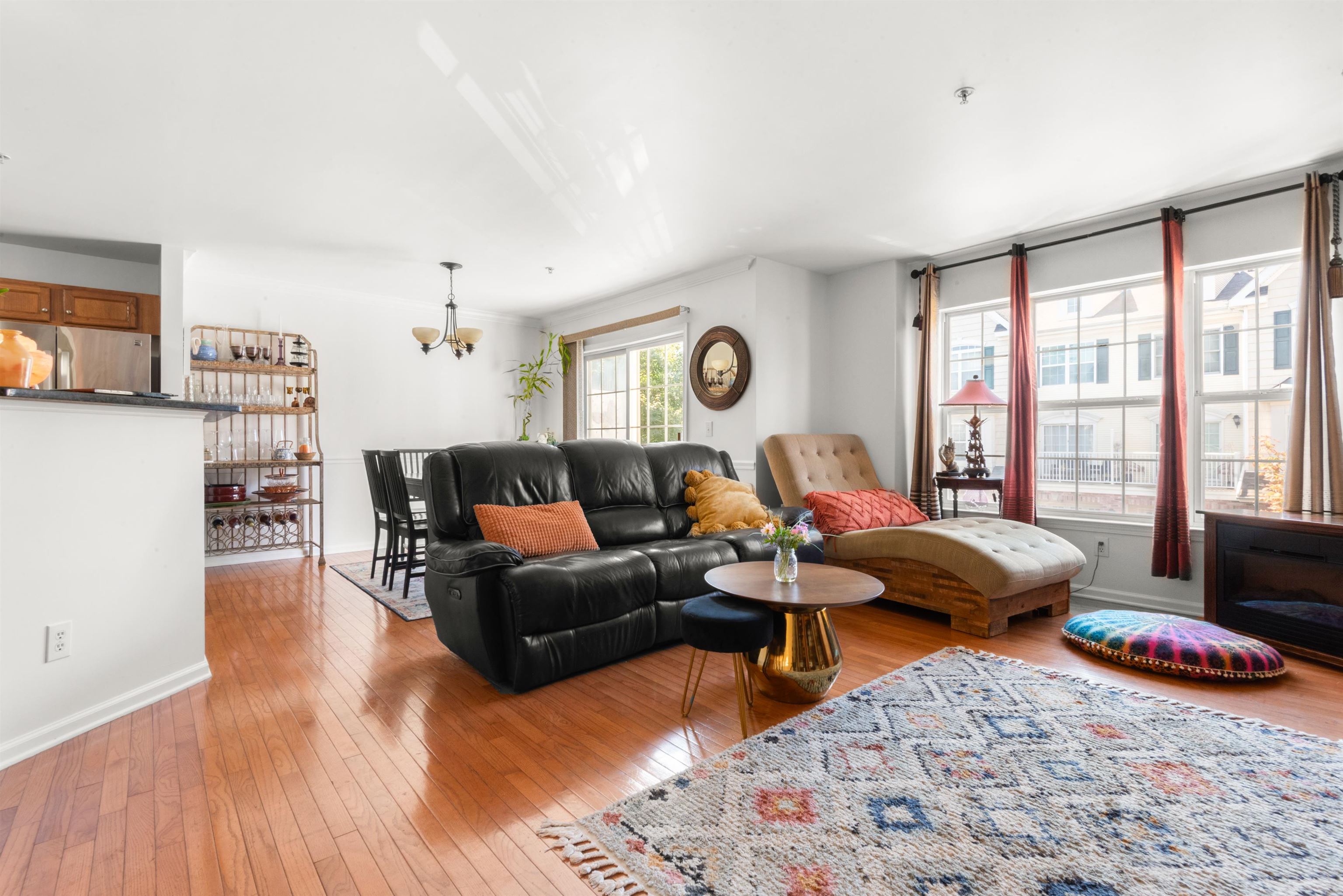Feast your eyes on this charming, extremely well maintained and expansive 3-level, 2 bedroom/2.5 bath townhouse thoughtfully laid out for ease of daily living and superb entertaining. Upon entering there is a large double coat closet leading to a large open living room and dedicated dining area featuring a wall of windows which bathe the home in light and make the hardwood floors gleam. The icing on the cake is your private balcony sitting area to enjoy morning coffee or a post-work glass of wine. The kitchen features solid wood cabinetry, quartz countertops, updated stainless steel appliances, plenty of counter space and two pantries outside of the nearby powder room. Downstairs you will find a newly carpeted, large, open, versatile space which was formerly used as an additional bedroom but currently has multi-purposes (home office, additional entertaining and exercise space and a guest bedroom for visitors). It offers easy access to the garage and on the sunny, windowed side there is a walkout where you can enjoy some fresh air or escape to read a book in the manicured green space and landscaped community gardens. The primary king-sized bedroom suite features a soaring cathedral ceiling, walk-in closet with attic access for even more storage, an enormous en-suite bath with jacuzzi tub, updated free standing shower and two separate vanities. The second bedroom is spacious and large enough for a queen bed set, a sizable desk for work or study and provides a deep closet. Right outside is a linen closet across the hall from a beautiful, brand new classic black and white bath. Adjacent is the separate laundry area with newer full-size side by side machines and lots of shelving. This perfect package includes a large attached garage parking spot with heavy-duty hanging storage shelves and an outdoor driveway spot, two additional parkings tags for guests to utilize inside the community, updated furnace/HVAC/hot water heater, two-zone heating/cooling, glistening hardwood floor on the second and third levels and under a one minute stroll to access the in-ground community pool or the gorgeous Bay boardwalk sunsets. Boatworks is conveniently located near the 8th Street Light Rail station and nearby NJ Transit buses providing easy access to NYC, Hoboken, and Jersey City. Less than a minute from the Bayonne Bridge. Come take a look and discover the community and convenience at Boatworks!