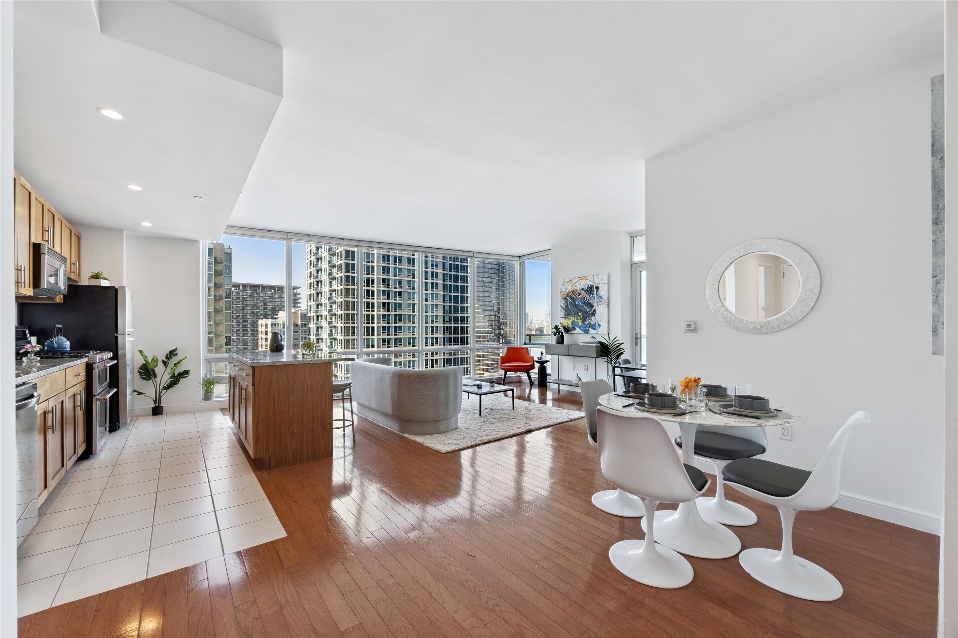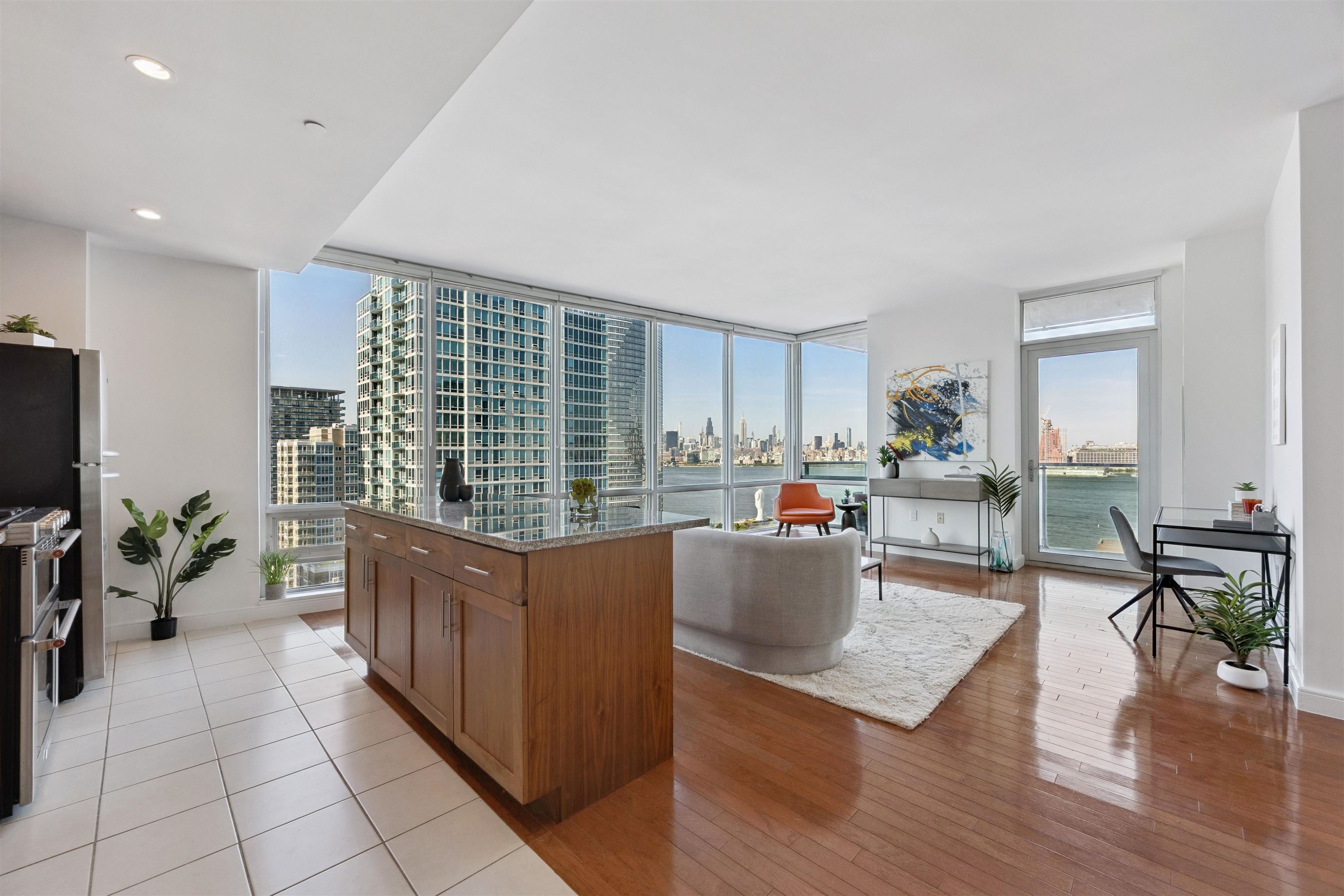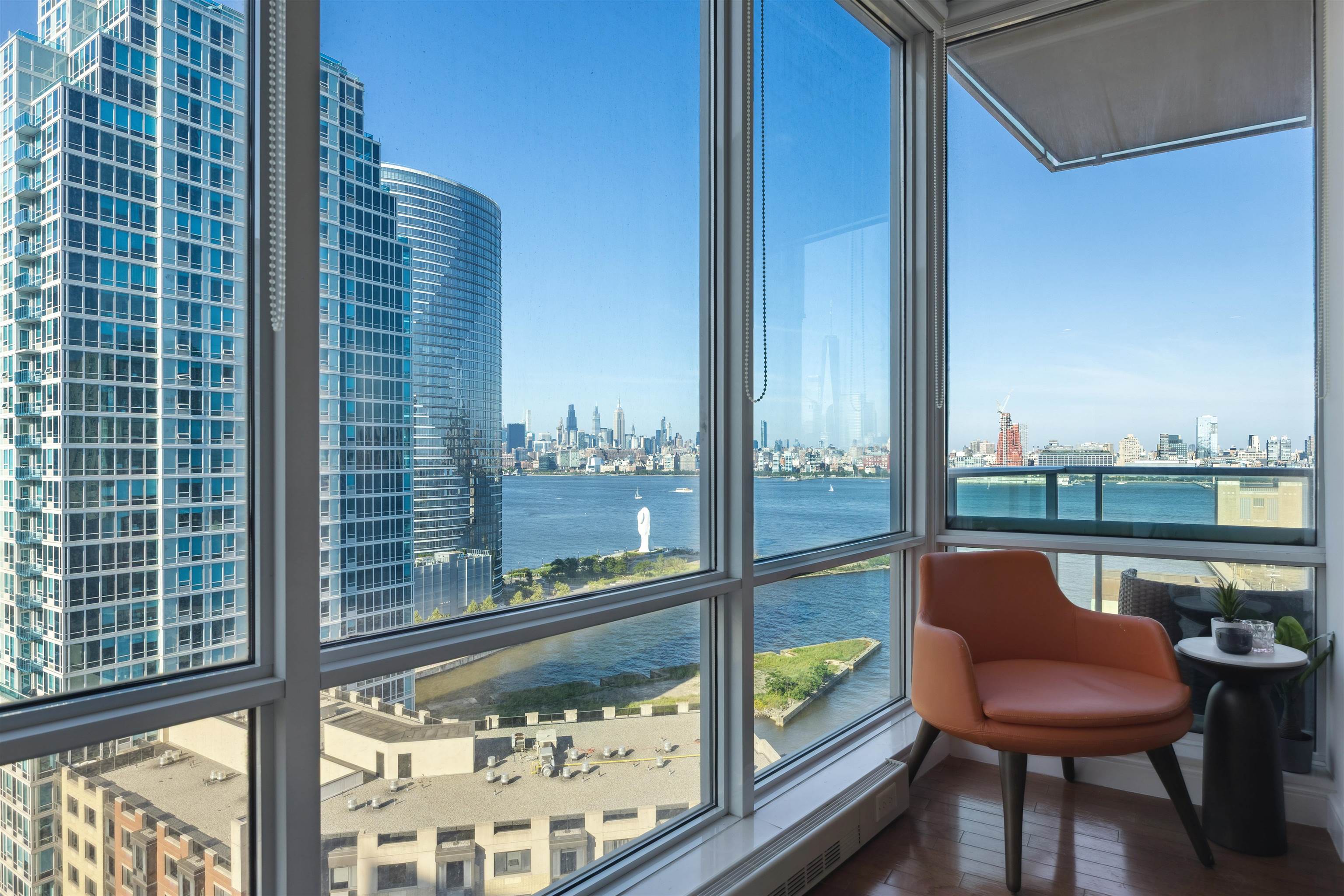 Rare Corner, East Facing, 1 Bed with a Private Balcony at The Shore! Experience breathtaking views of the Empire State Building, World Trade Center and the Hudson River through walls of floor-to-ceiling windows in this sun-drenched, corner-unit home. This unique layout has a nook that's perfect for a dining area or a work space. The gourmet kitchen has plenty of cabinets for storage, granite countertops, stainless steel appliances and an island with a breakfast bar. The home features a large bathroom with double vanities, Central Heat/AC, hardwood floors throughout, in-unit washer/dryer. Building amenities include: 24/7 concierge, fitness center, jacuzzi, sauna, steam room, resident lounge, conference room, playroom and a roof deck with amazing NYC/River views! Experience the convenience of Newport! Located between the Newport & Hoboken PATH, Ferry, NJ Transit Train, Light Rail and Bus Terminal. Selection of several supermarkets, Target, Duane Reade, Newport Mall, Newport Green Park all minutes away.
