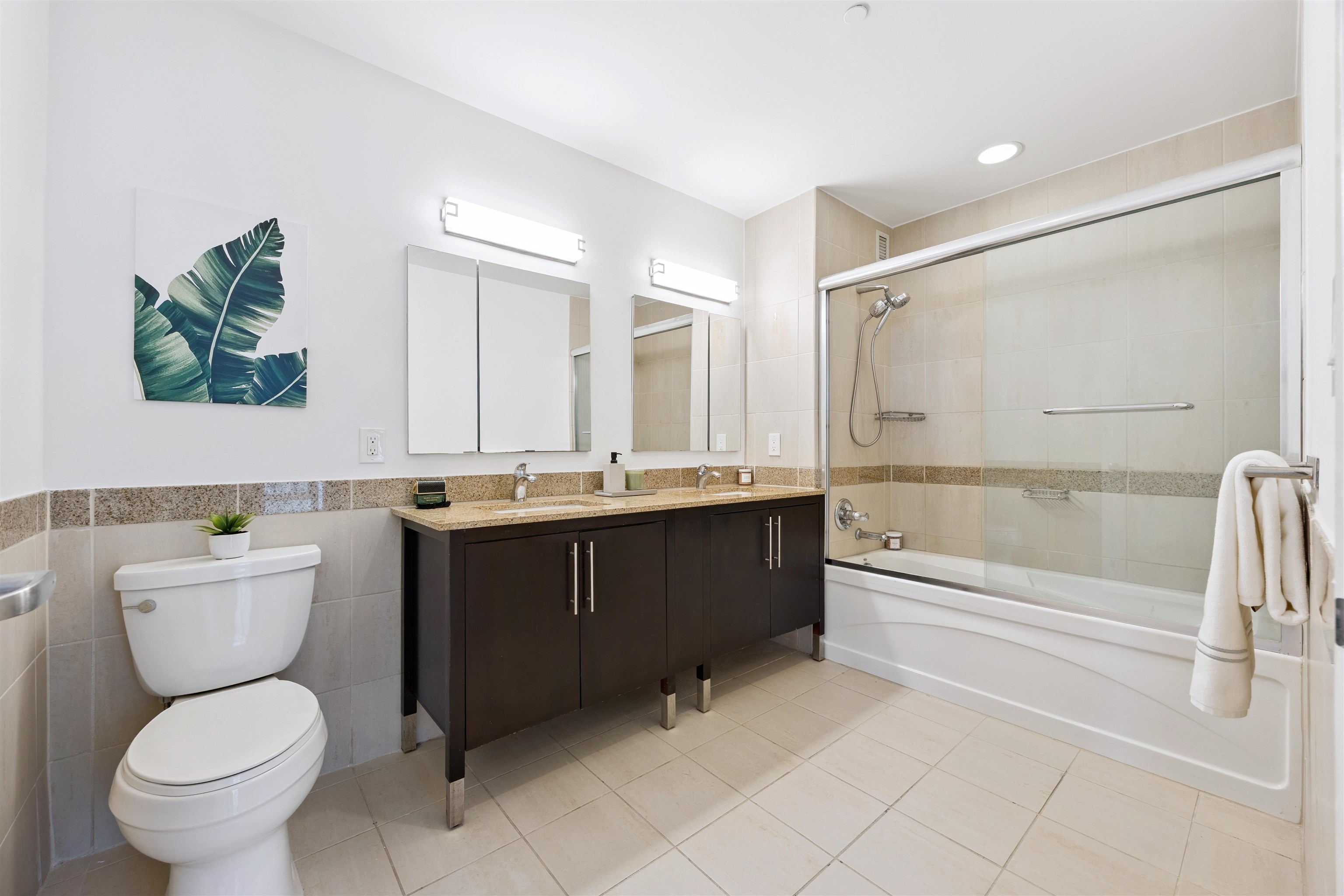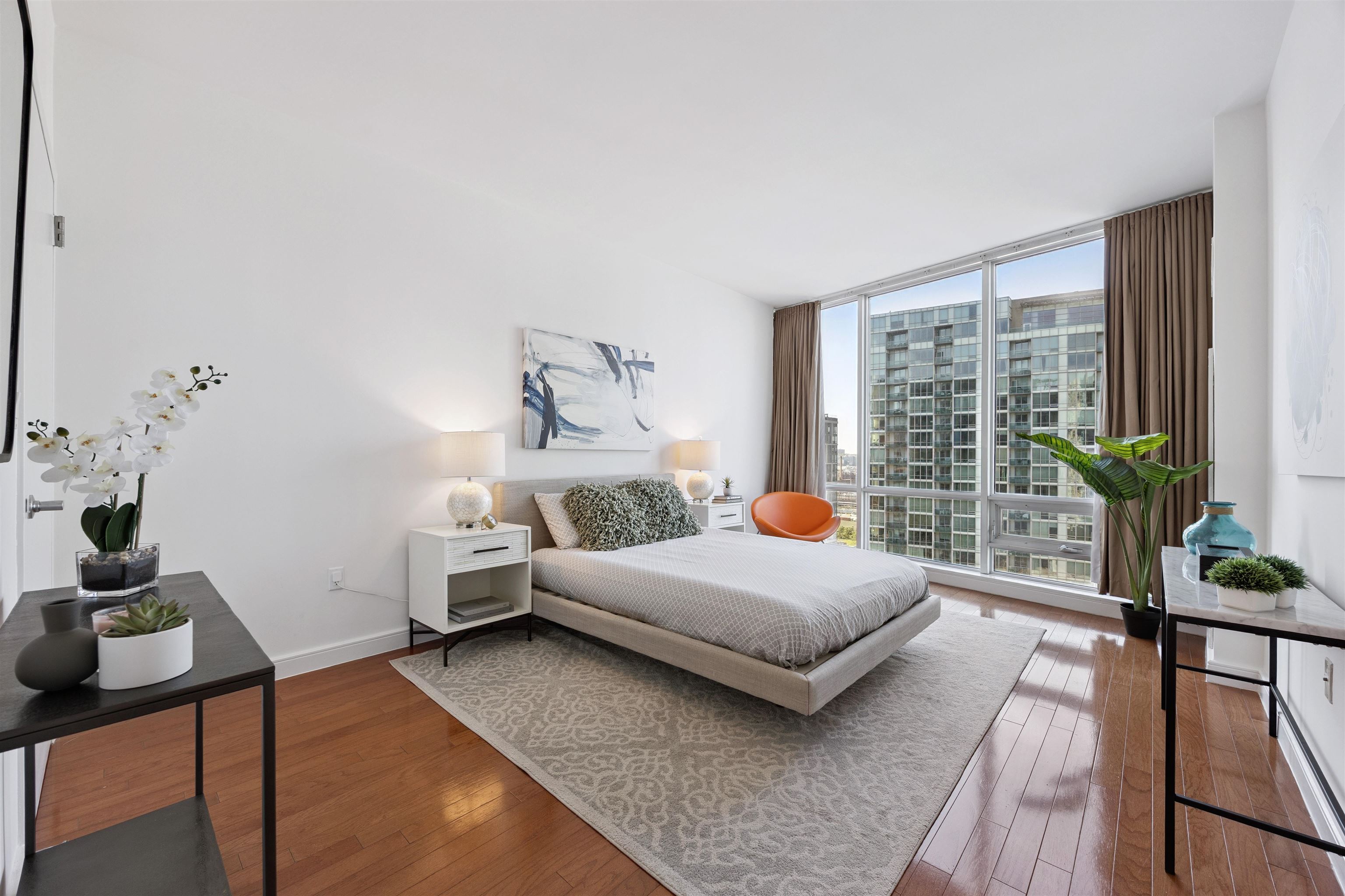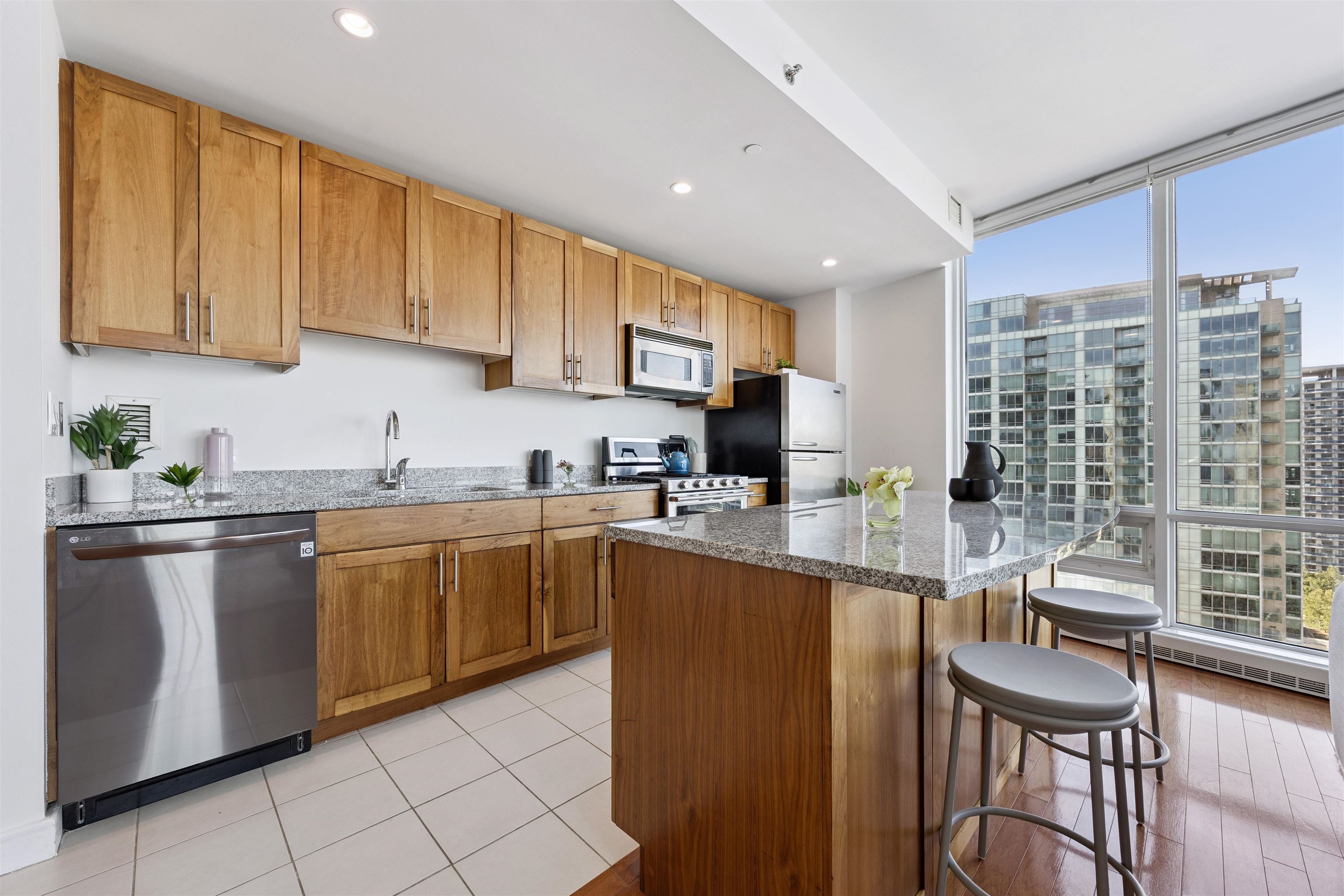 Rare Corner, East Facing, 1 Bed with a Private Balcony at The Shore! Experience breathtaking views of the Empire State Building, World Trade Center and the Hudson River through walls of floor-to-ceiling windows in this sun-drenched, corner-unit home. This unique layout has a nook that's perfect for a dining area or a work space. The gourmet kitchen has plenty of cabinets for storage, granite countertops, stainless steel appliances and an island with a breakfast bar. The home features a large bathroom with double vanities, Central Heat/AC, hardwood floors throughout, in-unit washer/dryer. Building amenities include: 24/7 concierge, fitness center, jacuzzi, sauna, steam room, resident lounge, conference room, playroom and a roof deck with amazing NYC/River views! Experience the convenience of Newport! Located between the Newport & Hoboken PATH, Ferry, NJ Transit Train, Light Rail and Bus Terminal. Selection of several supermarkets, Target, Duane Reade, Newport Mall, Newport Green Park all minutes away.