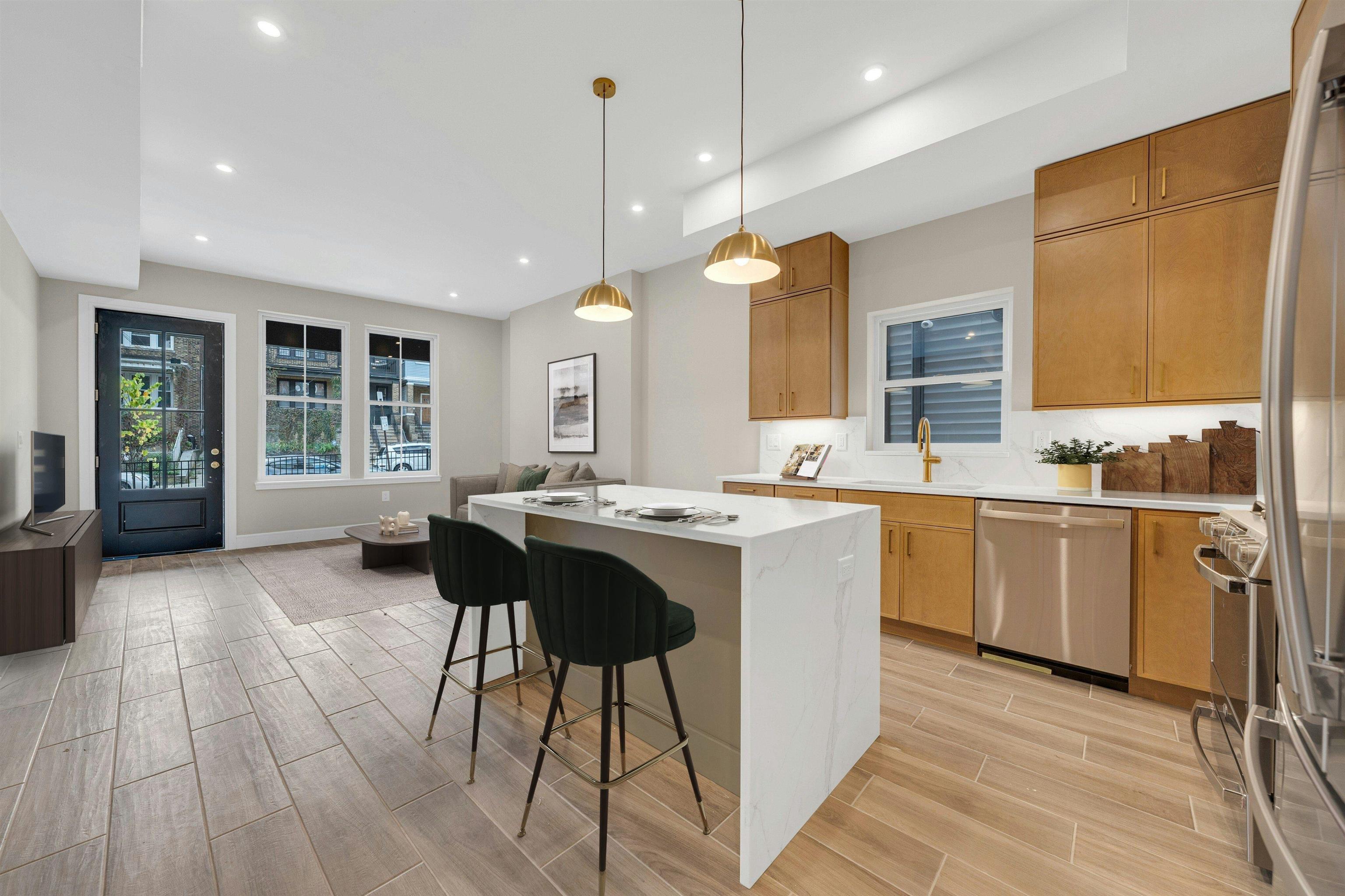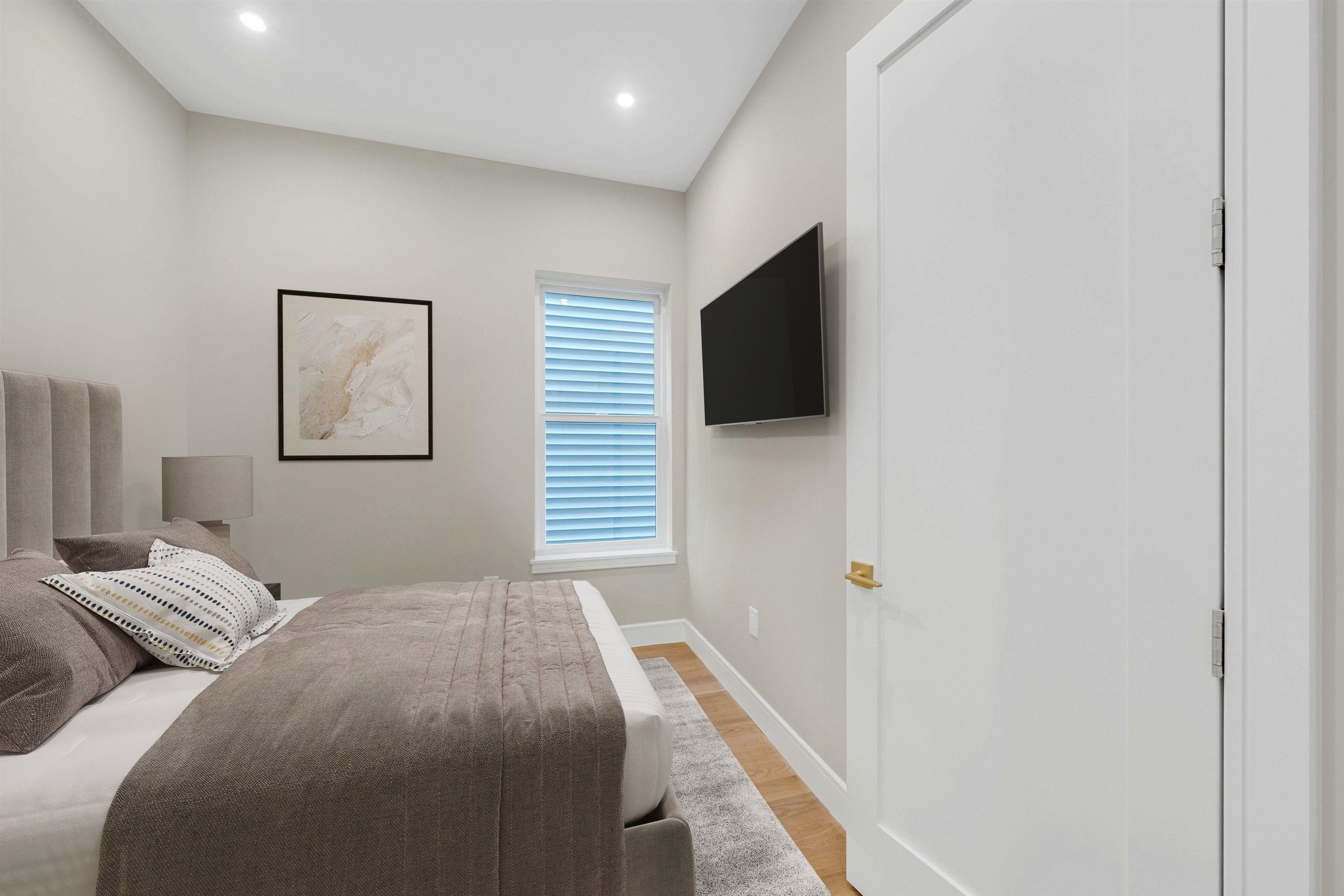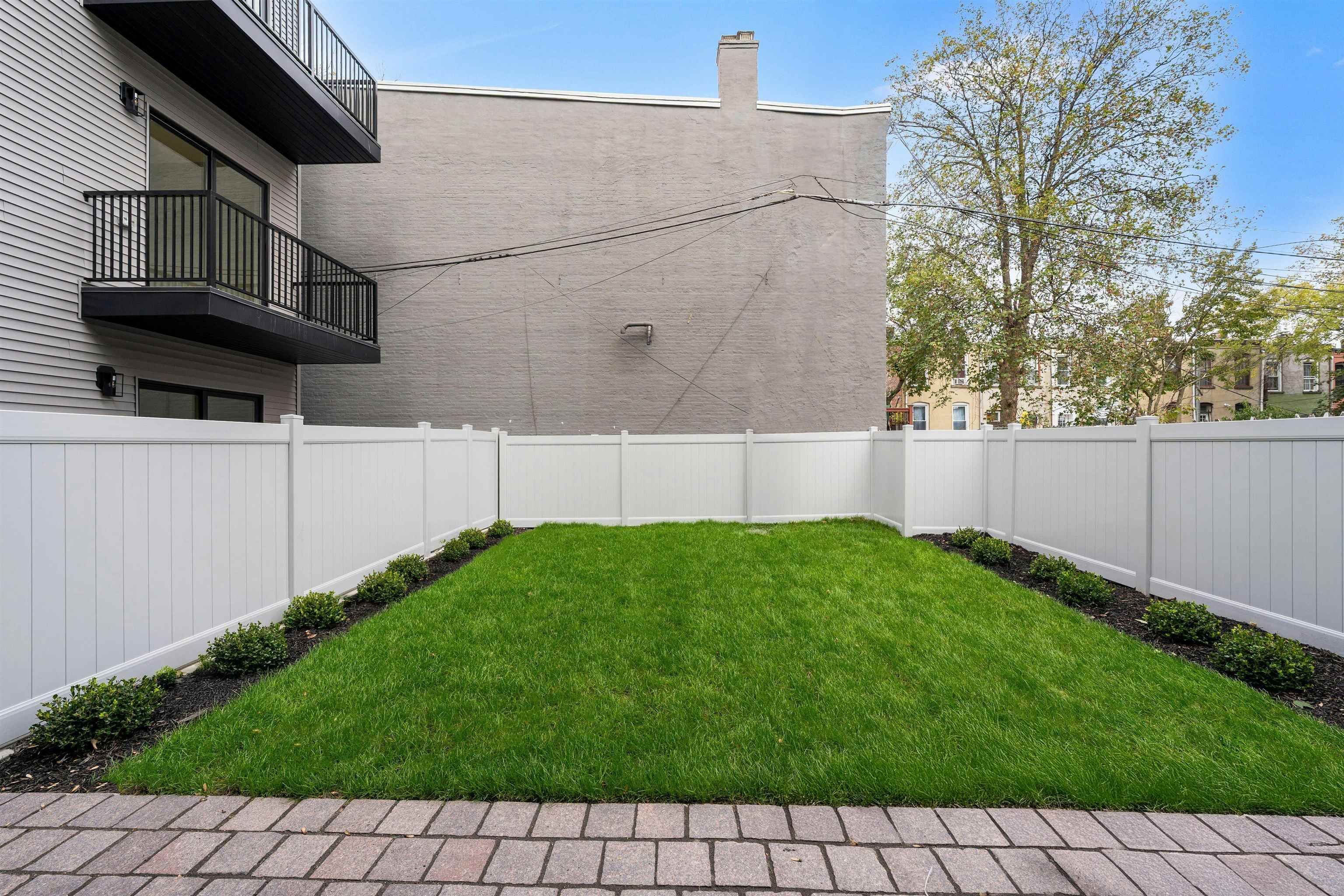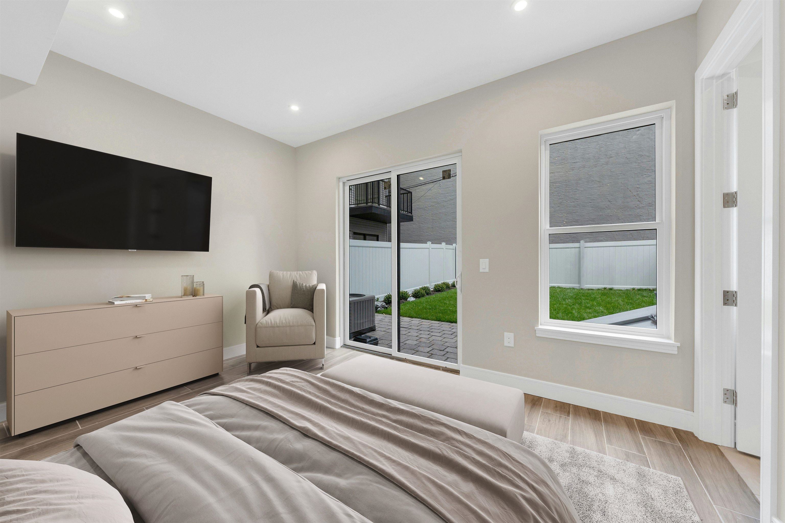 Step inside Unit 1 at 28 Clinton Avenue, a thoughtfully designed new-construction condominium that combines sophisticated finishes, timeless style, and modern comfort in Bergen-Lafayette. Spanning ~1,450 sq ft, this three-bedroom, two and-a-half-bath residence offers 10-foot ceilings, 8-foot doors, and white oak hardwood floors throughout. Natural light floods the home, creating an inviting and spacious feel. The chef’s kitchen showcases Fabuwood Luna cabinetry, a Pistachio island, quartz countertops and backsplash, and brass fixtures, perfectly balancing contemporary elegance with warm design elements. Each bathroom is finished with backlit designer mirrors and premium materials, while bedrooms are spacious and bright, and the primary suite includes a private balcony and en-suite bath. Step outside to enjoy your private landscaped backyard, featuring a fresh lawn, mulched garden beds, gray vinyl fencing, and paver patio—a rare and serene outdoor escape. Additional highlights include Rheem HVAC systems, 40 gallon powervent hot water tanks, and energy-efficient Andersen 100 Series windows. Located in Bergen-Lafayette, one of Jersey City’s fastest-growing neighborhoods, this home is surrounded by ongoing investment and development, making 28 Clinton Ave the perfect opportunity for both lifestyle and long-term value.