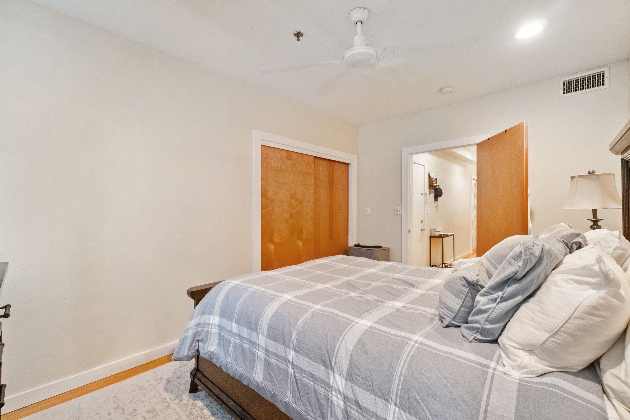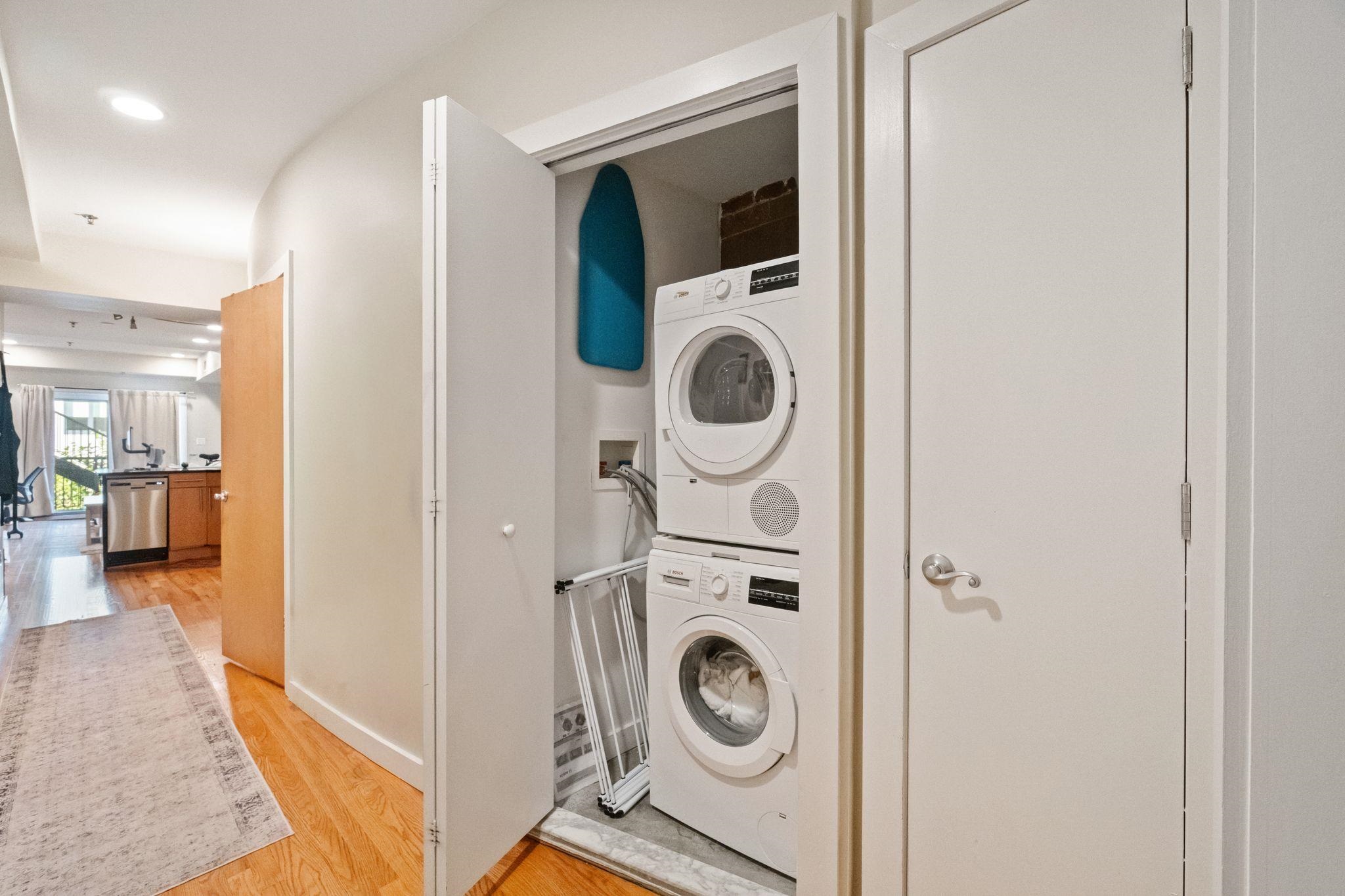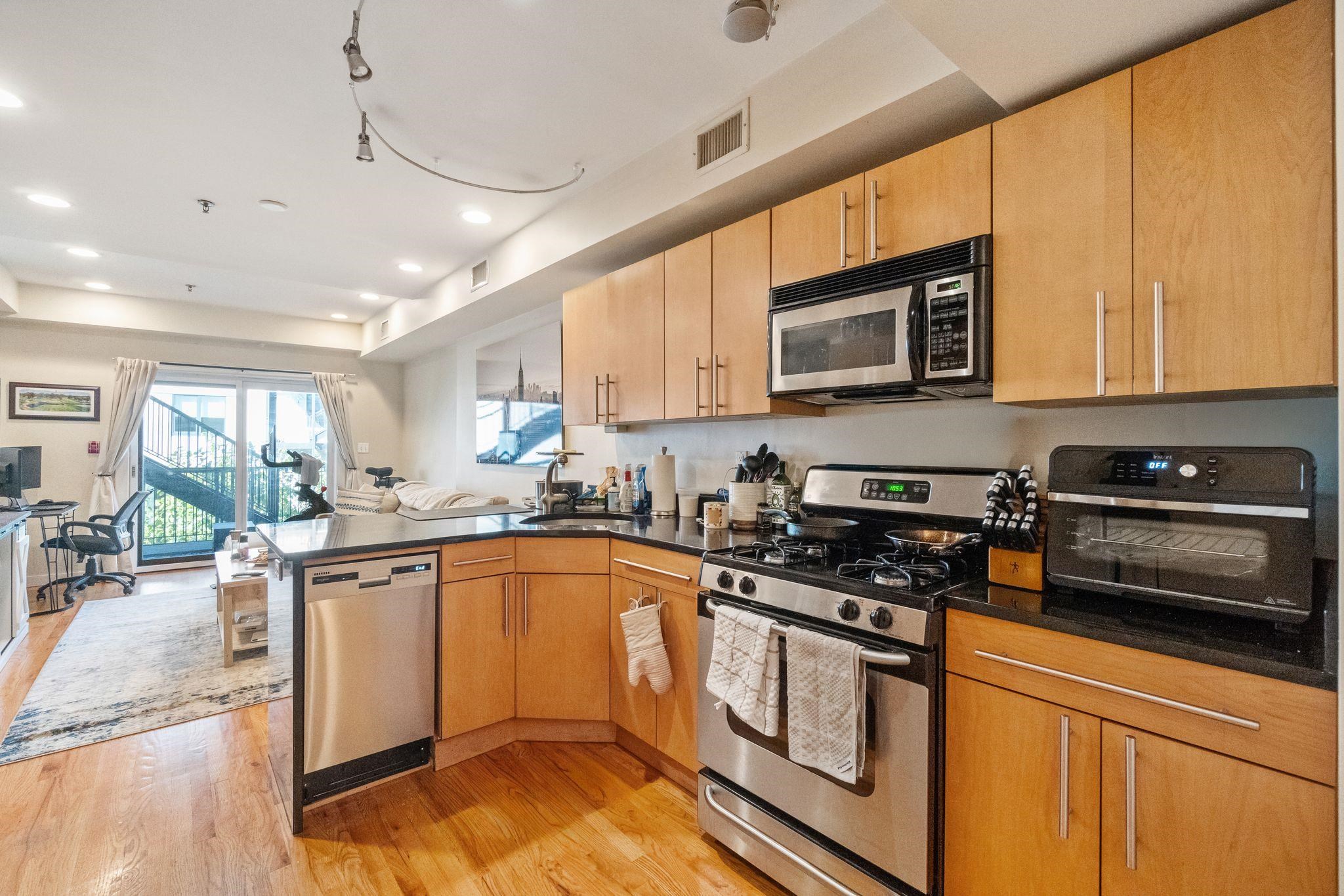 Well laid out 1 bed, 1 bath condo located in the heart of a vibrant Hoboken community just 2 1/2 blocks from the 2nd St. Light Rail. Boasting a beautifully designed kitchen featuring granite counters, a breakfast bar, and stainless steel appliances, cooking becomes a joyous experience. Track lighting adds a contemporary touch while highlighting the sleek finishes. Hardwood floors flow seamlessly throughout the space, creating an inviting atmosphere. Step outside onto the oversized balcony, perfect for al fresco dining or simply enjoying the fresh air. Recessed lighting enhances the ambiance, creating a cozy retreat. With low maintenance fees, homeownership couldn't be more convenient. Enjoy the convenience of a washer/dryer in-unit and central HVAC for year-round comfort. The spacious bedroom offers ample storage with large closets and ceiling fans for added comfort. Don't miss your chance to experience the epitome of urban living in this charming condo.