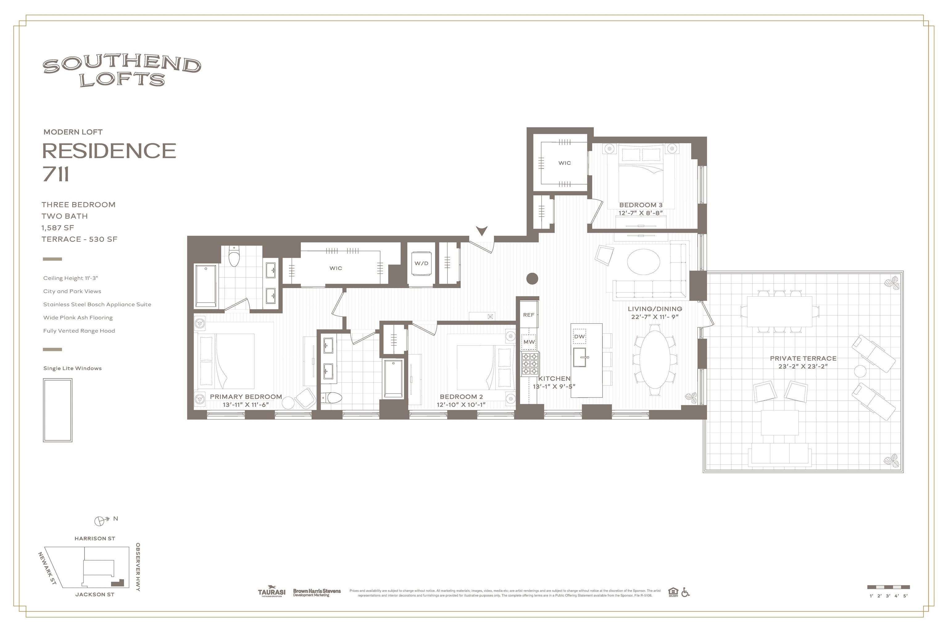 Corner 3 Bedroom with Massive 503’ Terrace! Residence 711 features an incredible 23’x 23’ terrace with spectacular Manhattan Skyline views, 11’3†ceilings in this 1,587 square foot 3 bedroom 2 Bath which can easily be converted to a 2 bedroom for those who love to entertain. Oversized windows and a custom kitchen featuring abundant storage, Calacatta Valentin countertops and backsplash and a suite of Bosch stainless steel appliances as well as a vented range hood, microwave drawer and dishwasher. The large primary suite features a massive walk-in closet, 4 fixture primary bath with Calacatta Lucca wall and floor tiles, white quartz countertop, Kohler sink and distinctive pill-shaped vanity mirror with integrated lighting. Wide Plank ash wood floors, high performance VRF heating and air conditioning, LG washer and state of the art heat pump dryer round out the exceptional finish package of this brand-new home. Exclusive Sales and Marketing Agent: Brown Harris Stevens Development Marketing. The complete offering terms are in a Public Offering Statement available from the Sponsor. File R-5108. Equal Housing Opportunity