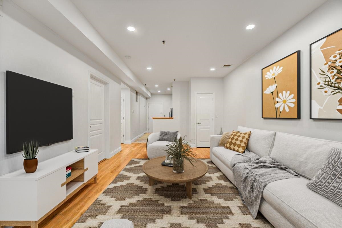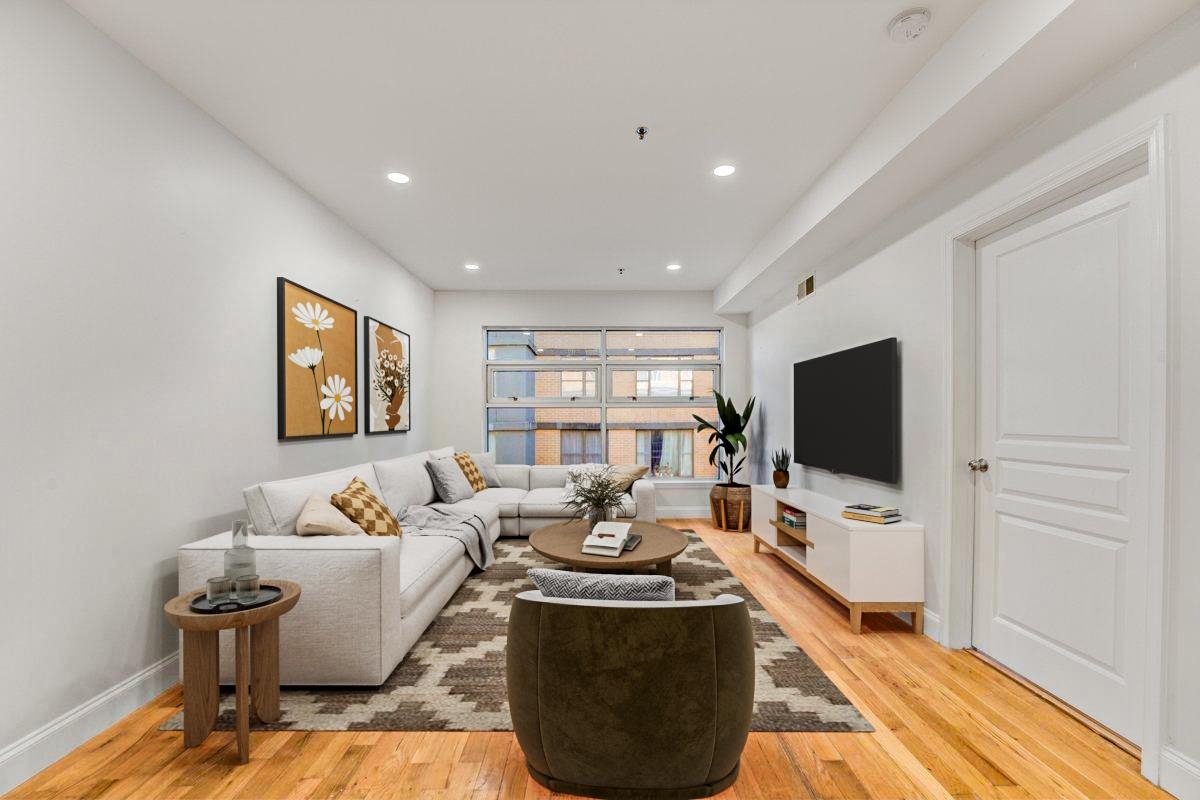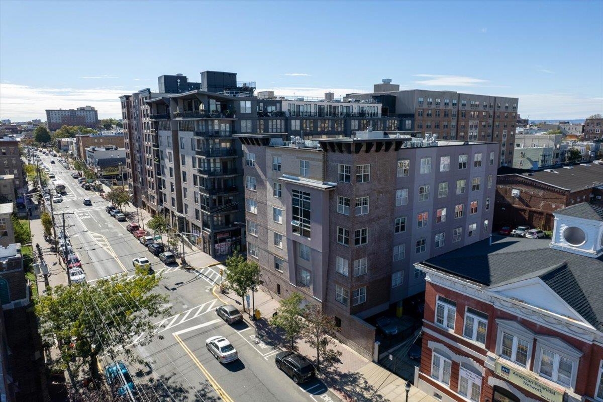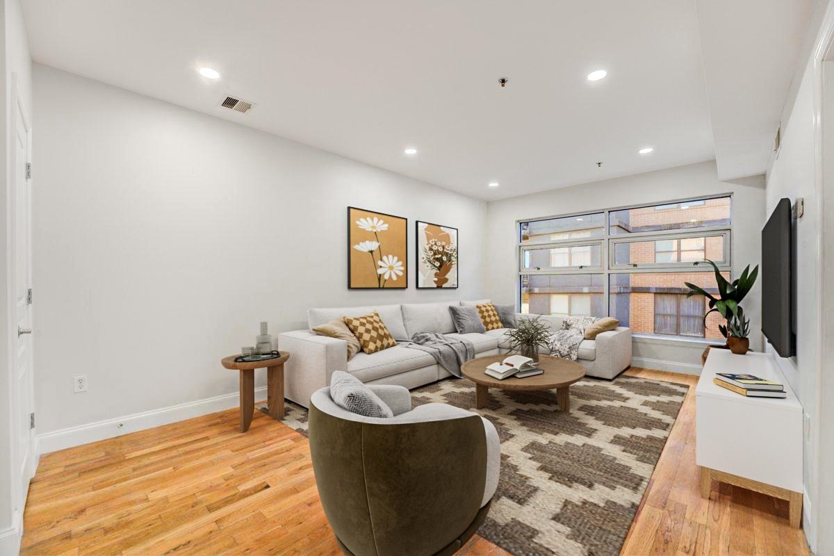 Welcome to this beautifully updated condo, perfectly situated in a prime location near shopping, dining, and downtown with an easy commute to NYC. Located on the 5th floor, this stunning unit offers breathtaking views and modern comfort in a well-maintained elevator building, making move-in and everyday living effortless. Step inside to discover an inviting open layout featuring floor-to-ceiling windows that fill the space with natural light and highlight the high ceilings throughout. The home boasts hardwood floors, recessed lighting, and fresh paint, creating a bright and contemporary atmosphere. The kitchen features tile flooring, ample cabinetry, and a seamless flow into the living and dining area ideal for entertaining or relaxing. The spacious bedroom offers comfort and style, while the full bath includes a soaking tub, perfect for unwinding after a long day. Additional highlights include in-unit laundry with washer and dryer, central AC, and forced hot air heating. This move-in-ready home combines modern updates, convenience, and exceptional location a perfect opportunity for homeowners or investors alike.