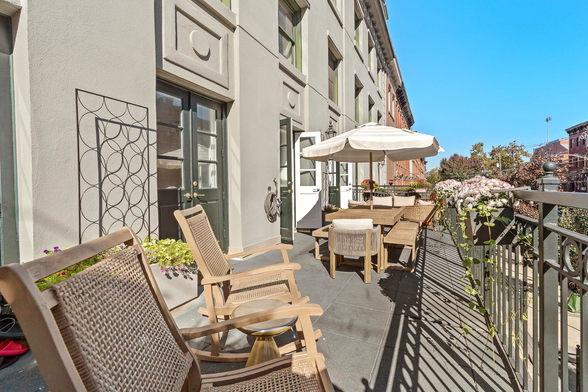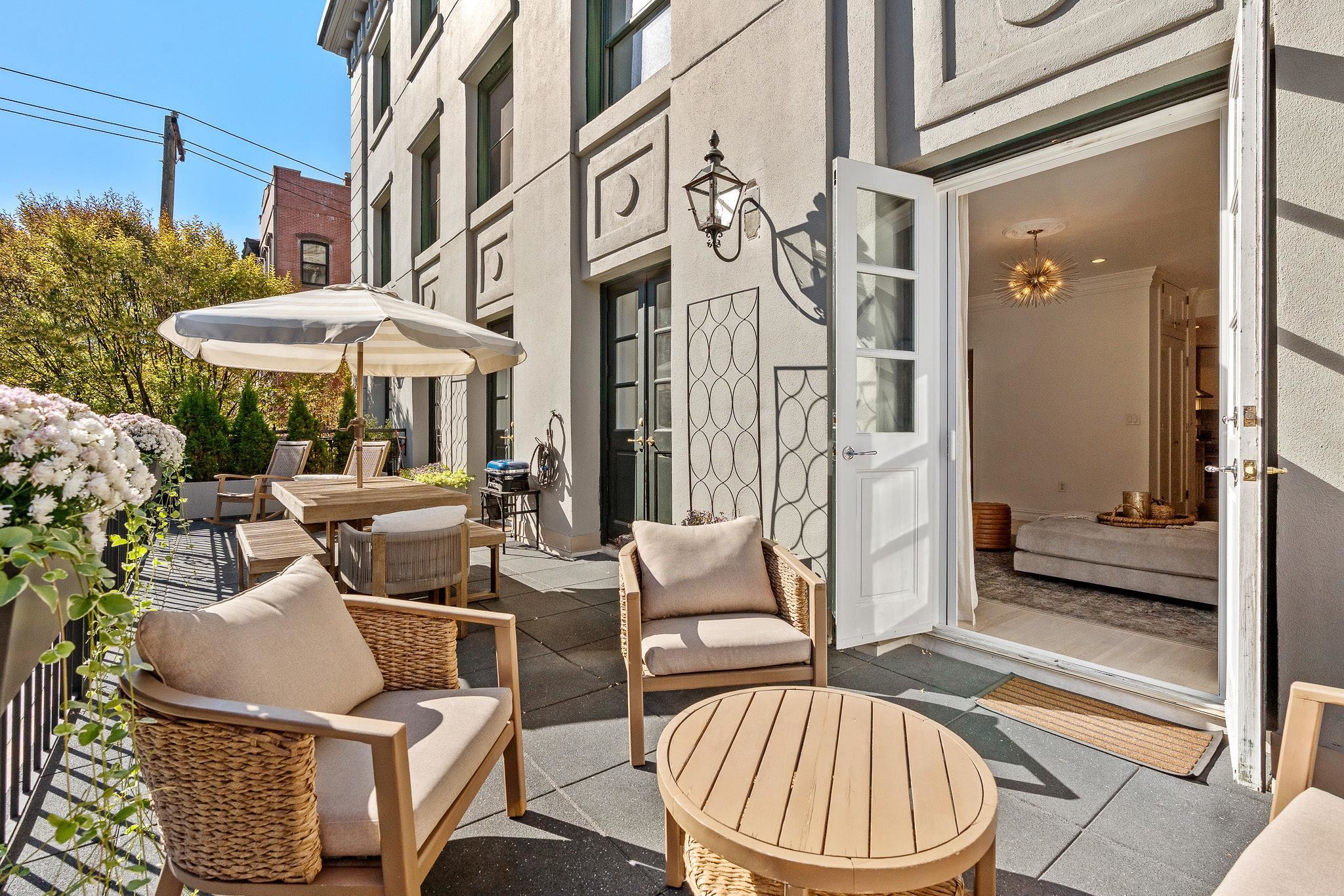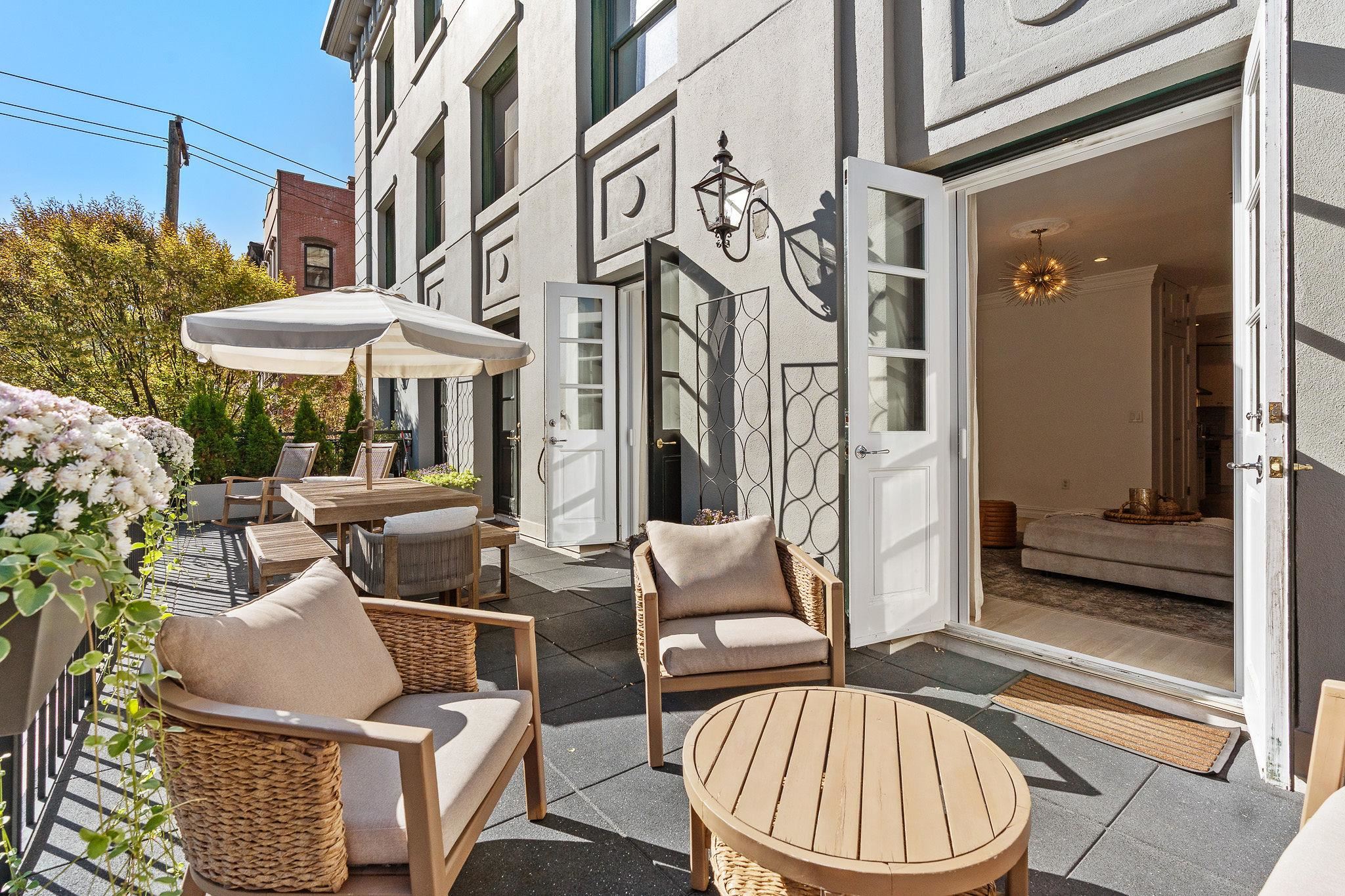 Historic Elegance Meets Modern Sophistication Discover a rare opportunity to own one of Hoboken’s most distinctive residences at 600 Hudson Street. Perched within a landmarked historic building, Residence 2B offers a timeless blend of architectural character and contemporary luxury — all centered around an extraordinary 500-square-foot private terrace overlooking tree-lined Hudson Street. Inside, the home reveals a bright, open floor plan with soaring high ceilings, four pairs of French doors, and an abundance of natural light that blurs the line between indoor and outdoor living. The chef’s kitchen is both functional and refined, featuring a copper farmhouse sink, premium JennAir stainless steel appliances, and custom finishes that speak to craftsmanship and style. The primary bedroom suite showcases tailored built-ins, generous storage, and a serene ambiance ideal for rest and retreat. A versatile den provides the perfect home office, reading nook, nursery or guest space. Every detail — from the millwork to the light fixtures — reflects the thoughtful design that makes this home truly one of a kind. Additional highlights include an in-unit washer and dryer, ample closet space, and the convenience of an elevator in a historically significant building. Set in one of Hoboken’s most coveted locations, 600 Hudson Street is moments from the PATH train, ferry, boutiques, cafés, and the Hudson River waterfront — offering a rare lifestyle of character, comfort, and convenience.