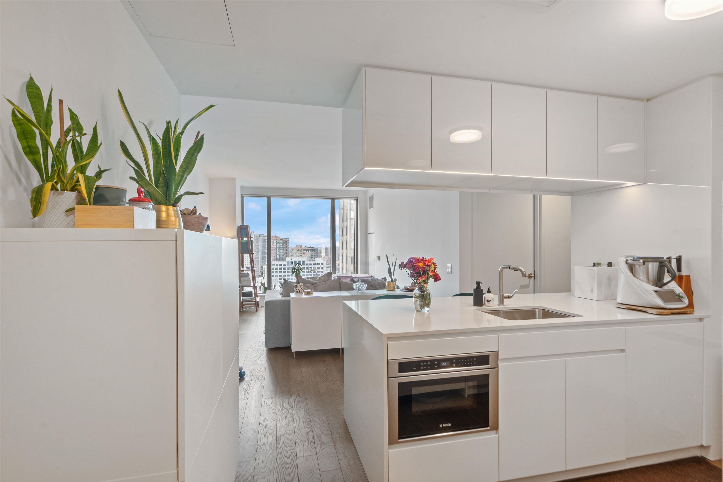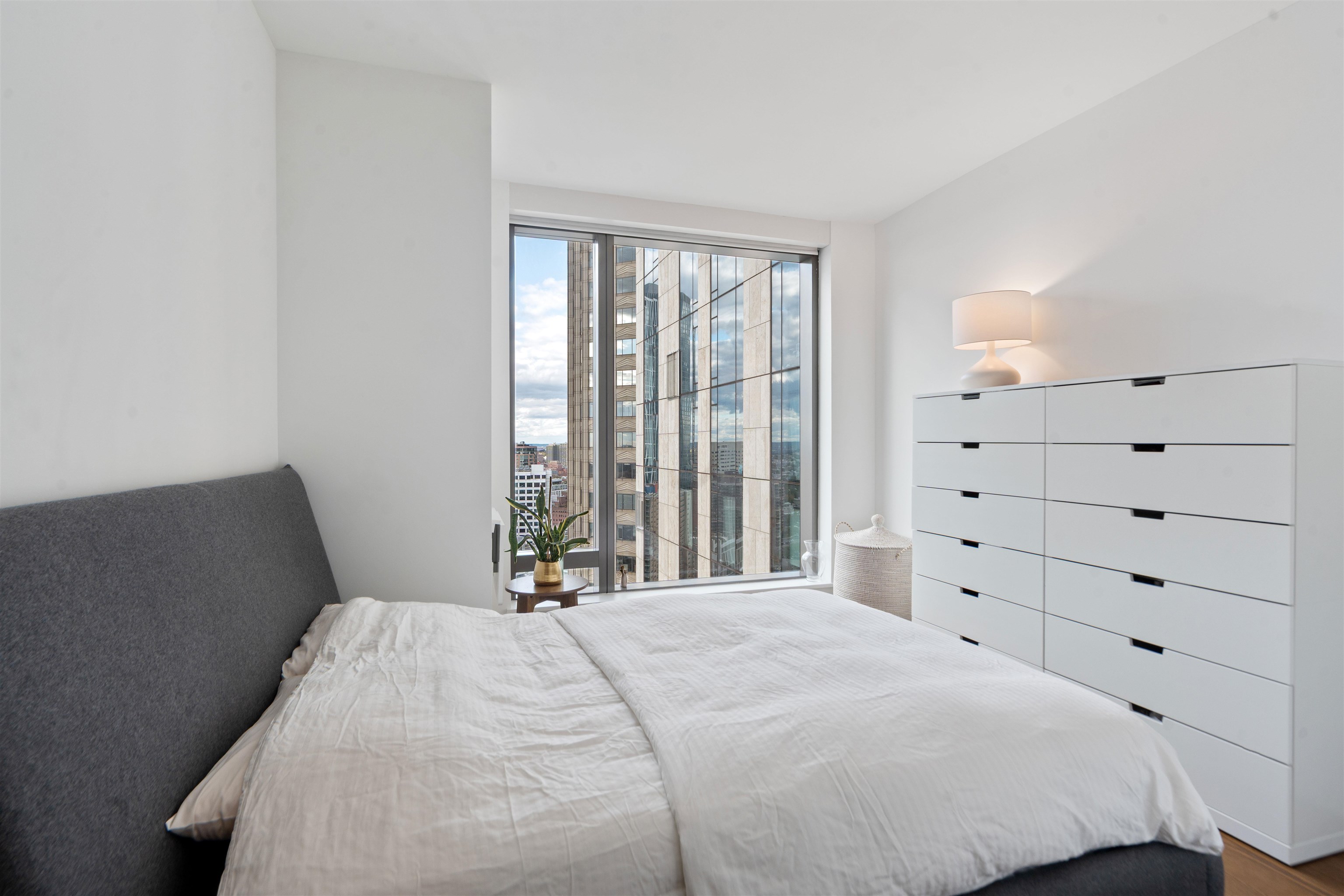 Luxury 26th-floor home at 99 Hudson. Floor-to-ceiling windows with stunning city and river views, wide-plank oak floors, Bosch kitchen appliances, gas range with vented XO hood, white lacquer Italian cabinetry, and spa bath with quartz vanity and Kohler fixtures. In-unit laundry and high-efficiency systems. Resort-style living with 65,000 sq ft of amenities including outdoor heated pool, hot tub, sauna, steam room, fitness center, golf simulator, club & movie/game rooms, business center, grills, dog run, plus 24/7 concierge in a triple-height lobby. Steps to PATH & ferry for fast NYC access.