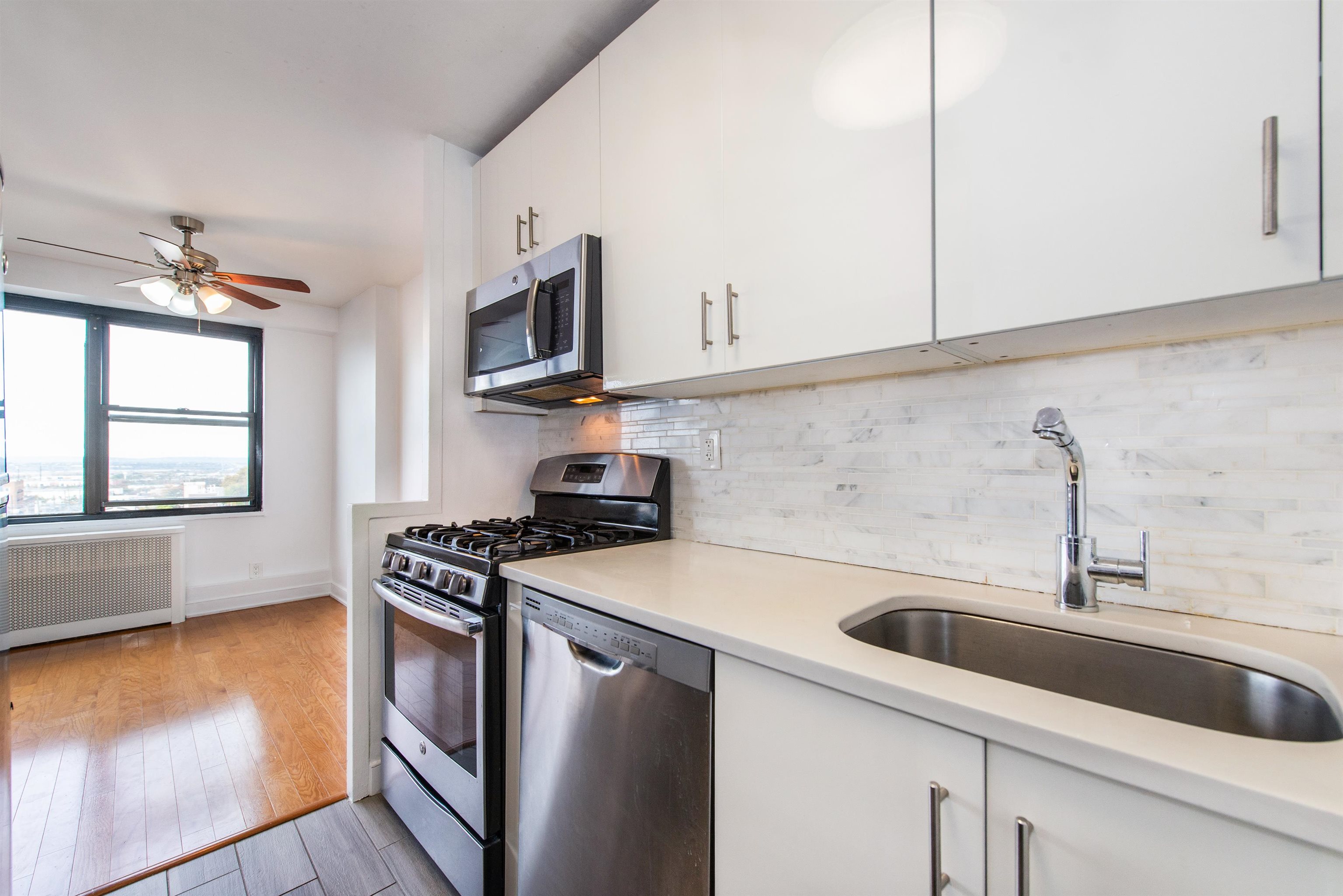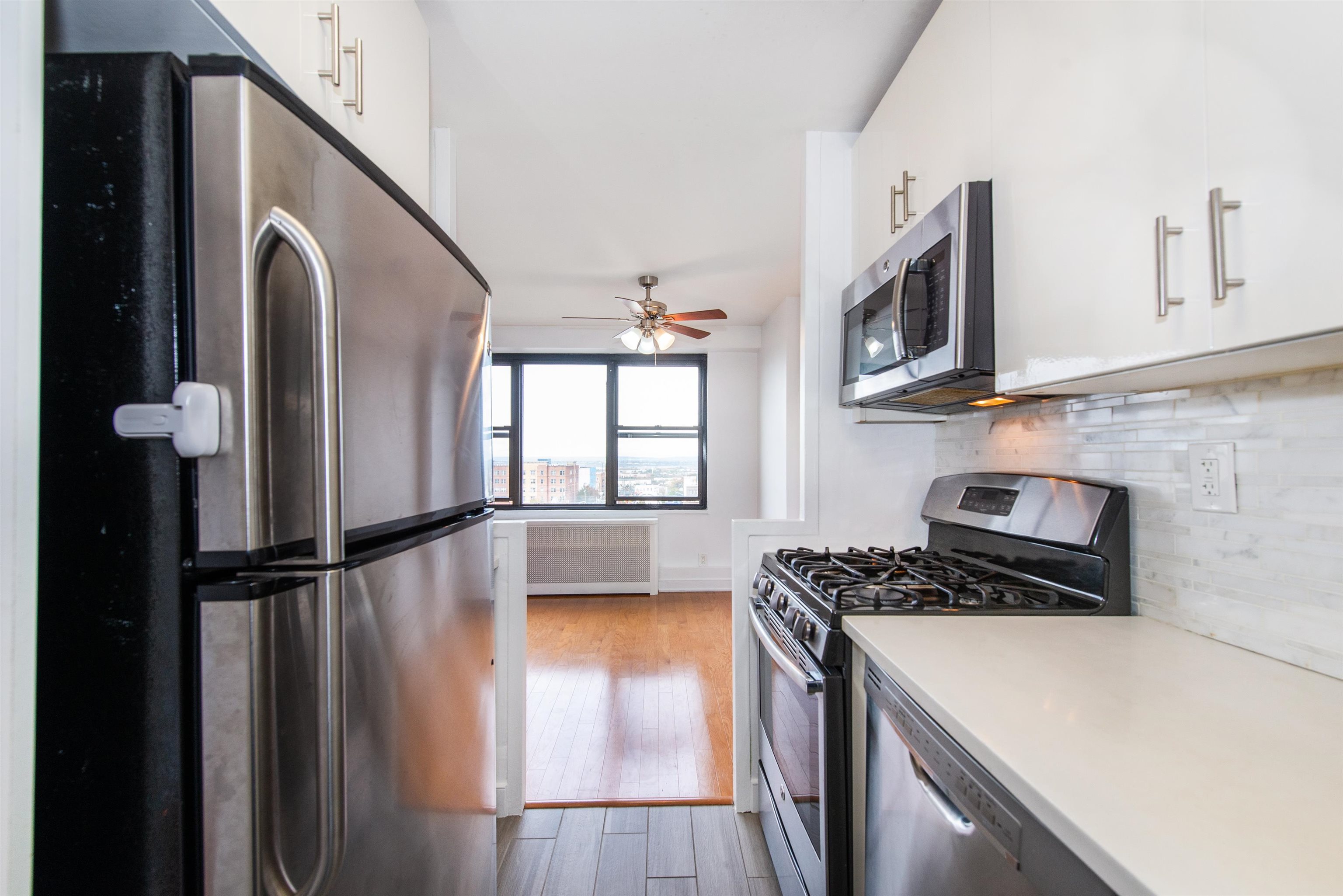 Welcome to luxury living and all newer condo at The Lenox. Enjoy the convenience of a full-service hi-rise condo building just minutes away from New York City. Home features: an open concept living room and dining room, one bedroom, tons of closet space and a full bath. Additional attributes: Hardwood floors and wonderful natural sunlight with large windows and beautiful breath-taking skyline views of the NJ mountains. Low property taxes and low maintenance fees which include heat, hot water, water and gas. Building features: elevator, full-service 24-hour doorman, additional parking available for lease, EV charging station, building security, professional mailing services, fitness center, community room, pet friendly and a laundry room. Conveniently located bordering Jersey City Heights and Weehawken. Be in the heart of all the shops, groceries stores, dog parks, playgrounds and schools. A 17-minute drive to New York Penn Station and a 30-minute bus ride to New York City. Close to all NJ Transit. Perfectly maintained and ready to move right in!