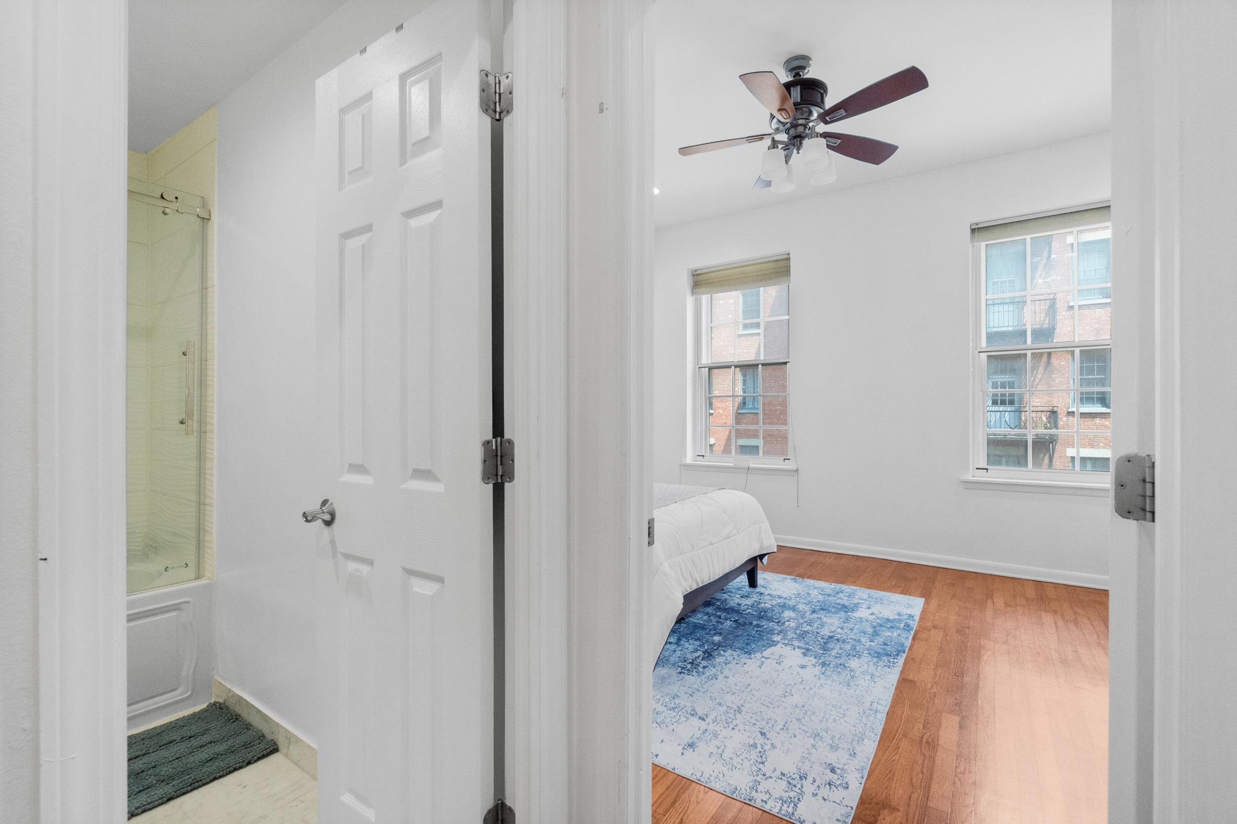 Welcome to Dixon Mills, a historic and vibrant community in the heart of Downtown Jersey City. This stunning 1-bedroom, 1-bath condo offers a perfect blend of industrial-chic charm and modern luxury. Inside you'll discover a bright and airy open-concept living space with impressive 12-foot ceilings and beautiful hardwood floors throughout. Recessed lighting adds a touch of modern elegance, highlighting the seamless flow from the living area to the kitchen. The kitchen is a true centerpiece, featuring sleek granite countertops, a convenient breakfast bar, and a suite of stainless steel appliances, including a dishwasher and built-in microwave. The spacious bedroom provides a tranquil retreat, complete with a ceiling fan for added comfort. The modern bathroom is a sanctuary with its chic lighted mirror and stylish barn door vanity. Central HVAC ensures year-round climate control. A valuable, included parking space provides the ultimate convenience in this bustling urban setting. Beyond the apartment's doorstep, Dixon Mills is a community like no other. Residents enjoy access to an incredible 8,000 sq ft lifestyle center featuring a state-of-the-art gym, a full-size indoor basketball court, a relaxing sauna, a community room for gatherings, and a play area. Commuting is a breeze from this prime location. Dixon Mills is situated just 5 blocks from the Grove Street PATH station, offering a quick and direct commute to both Midtown and Wall Street in Manhattan. The Hudson-Bergen Light Rail is also easily accessible, and a shuttle bus provides daily front-door service to local transit hubs, making this an ideal home for commuters. With its exceptional features, rich history, and unbeatable location, this condo at Dixon Mills is the perfect place to experience the best of Jersey City living.