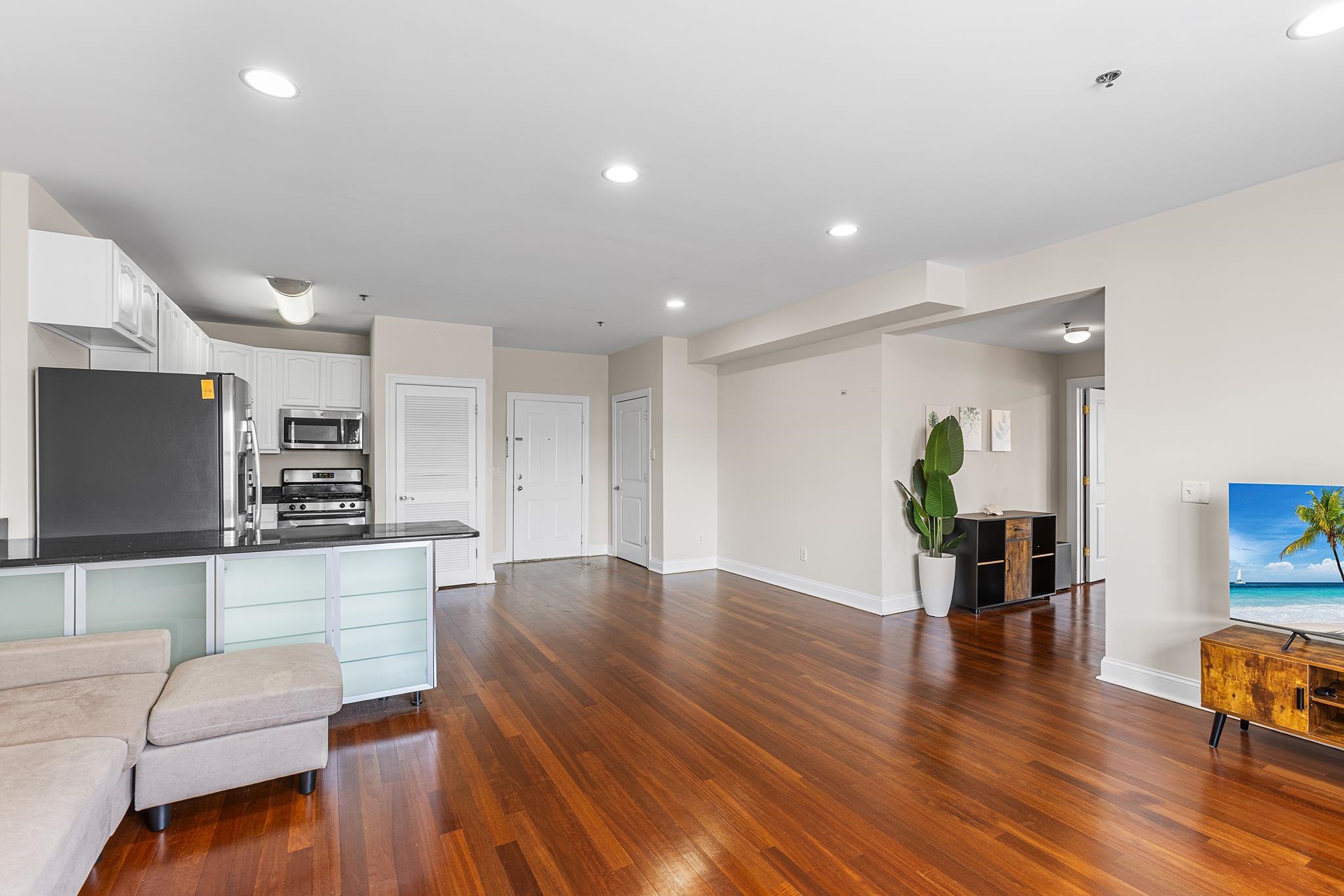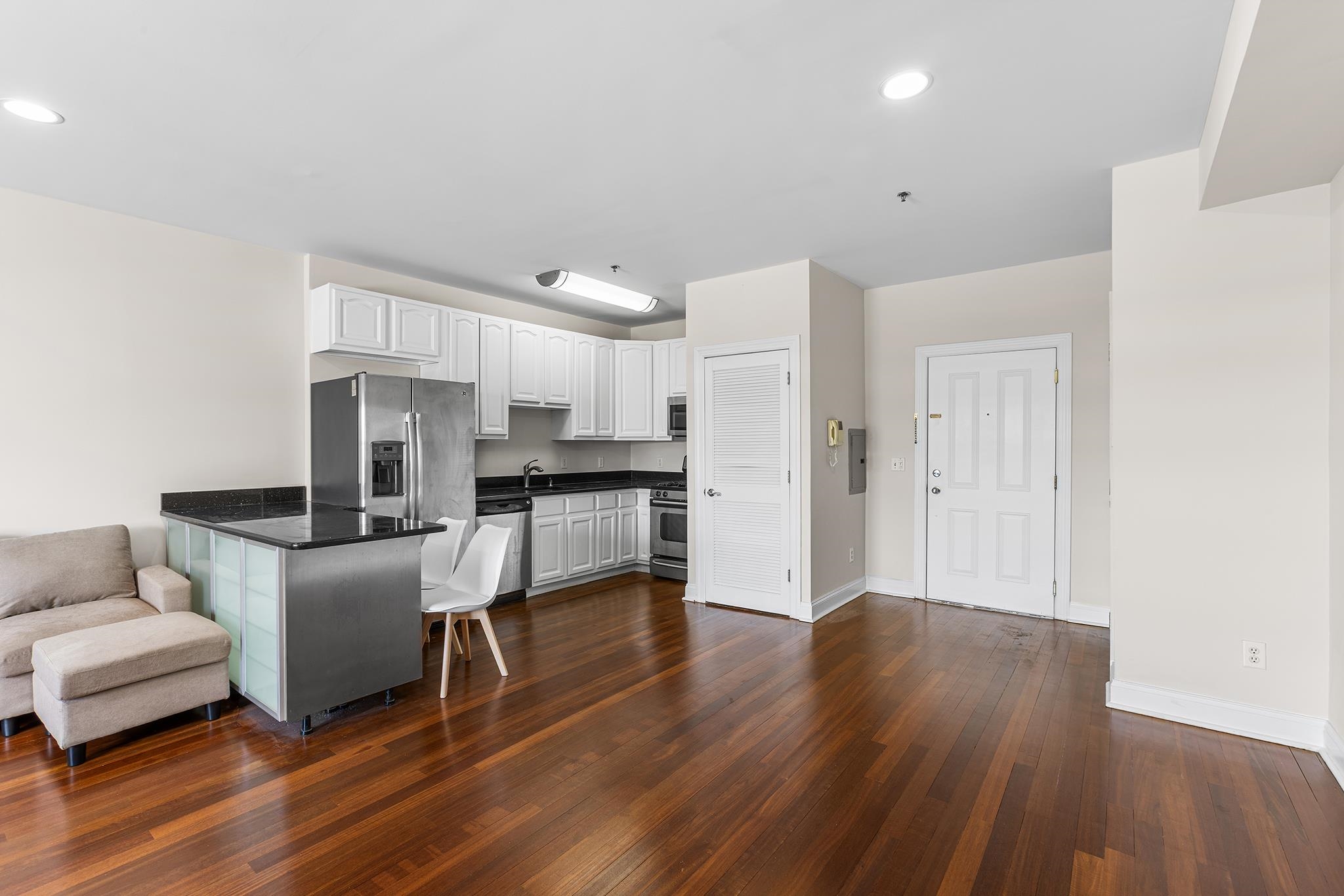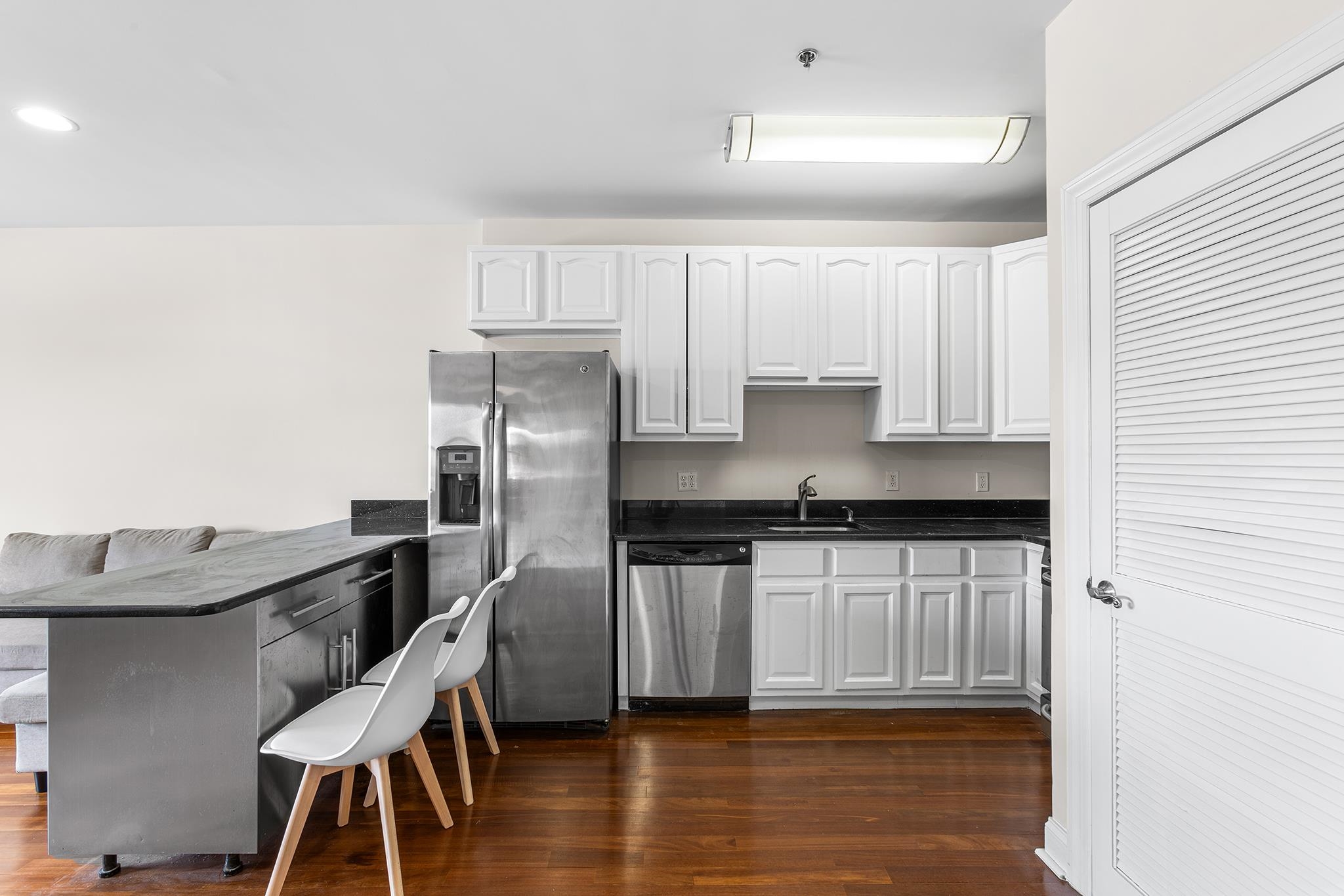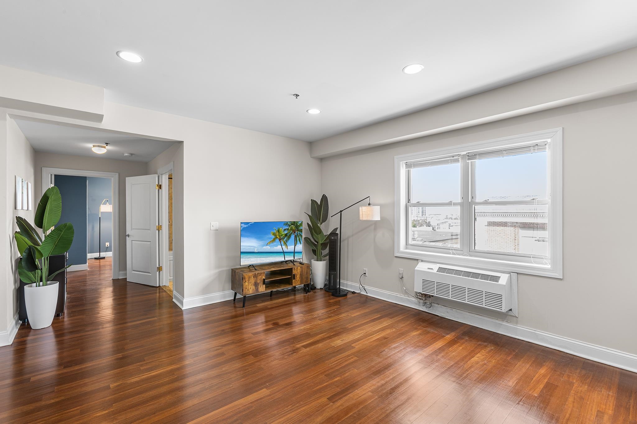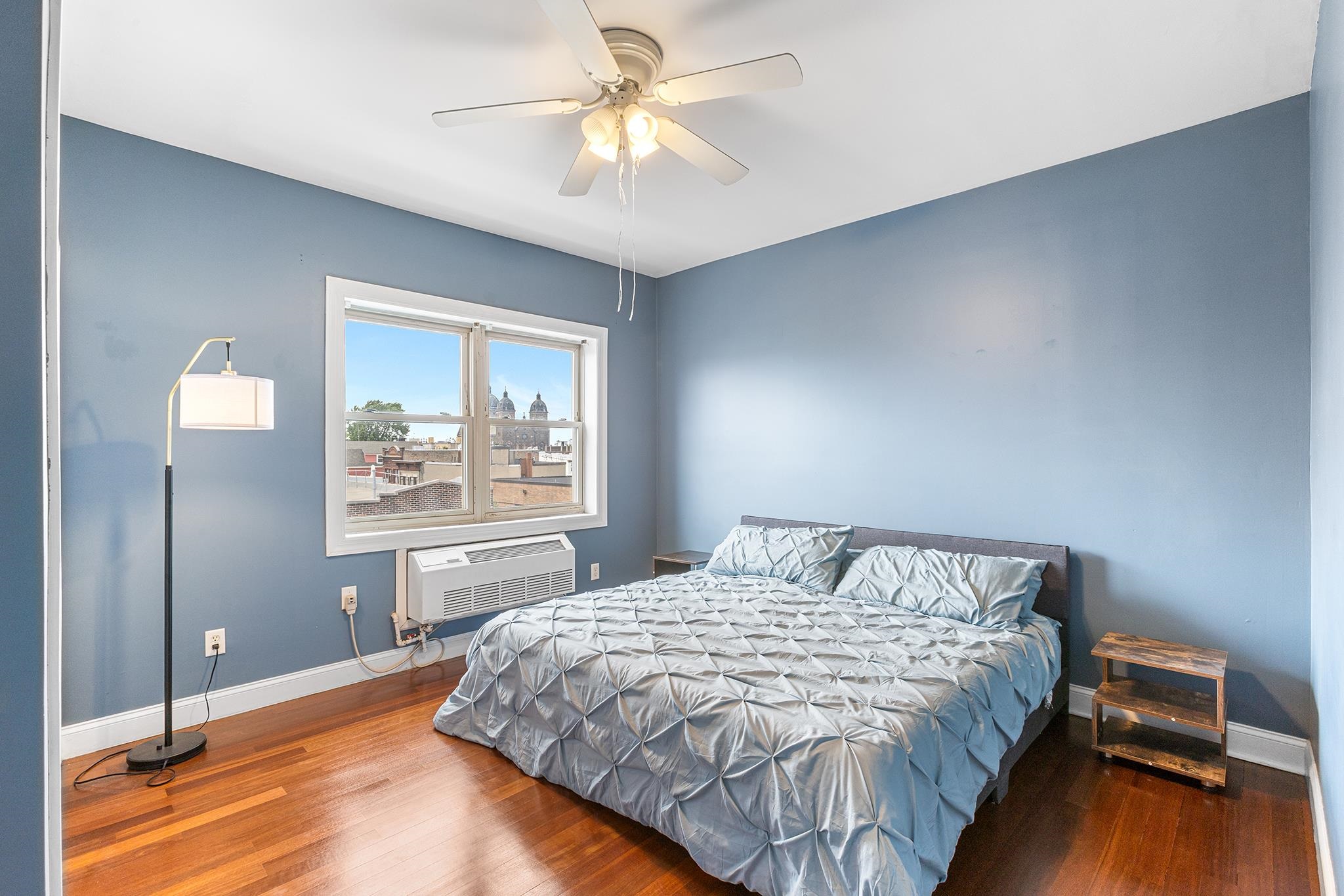 Location, Quality & Convenience — All in One! Parking is tandem inside the garage. Welcome to this beautifully maintained, bright corner 1-bedroom condo with deeded parking and private storage, located in a well-built elevator building from 2006. Perfectly move-in ready, this home features 9 ft ceilings, refinished hardwood floors, and an open layout ideal for both relaxing and entertaining. The spacious kitchen is equipped with granite countertops and stainless steel appliances, while the bathroom offers travertine tile and a granite vanity for a touch of luxury. Oversized windows flood the space with natural light, and you'll appreciate the generous closet space, in-unit washer/dryer, and central vacuum system. Enjoy unbeatable commuter access with the bus to Manhattan right outside your door, and Hoboken just minutes away via the nearby viaduct. Surrounded by parks, playgrounds, and neighborhood charm, this condo is the perfect blend of comfort, location, and modern convenience.