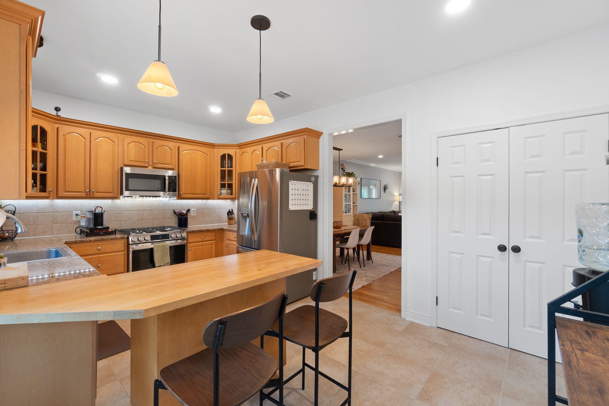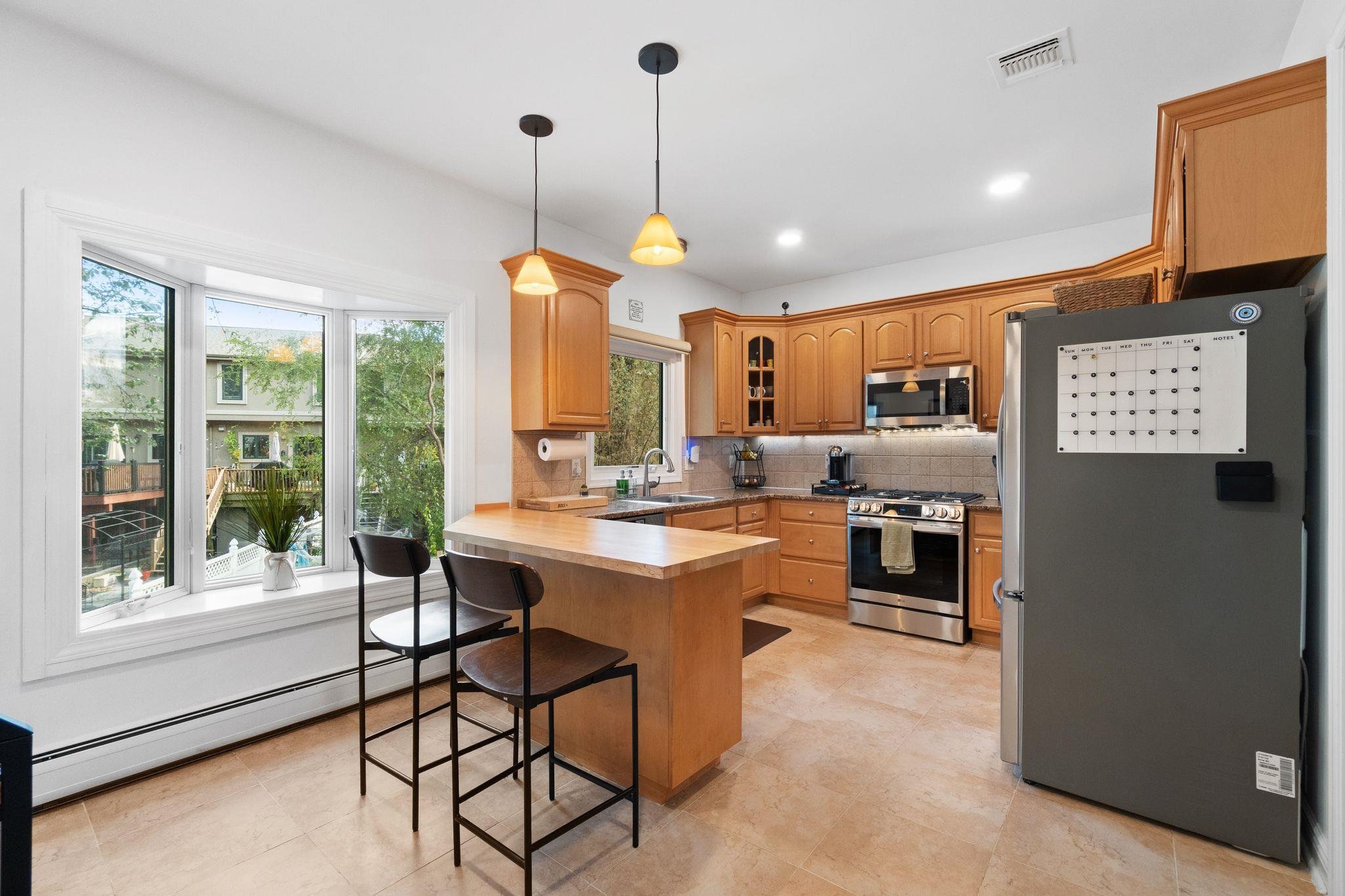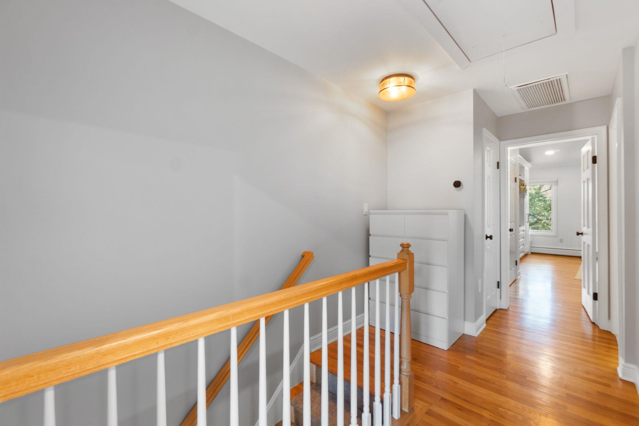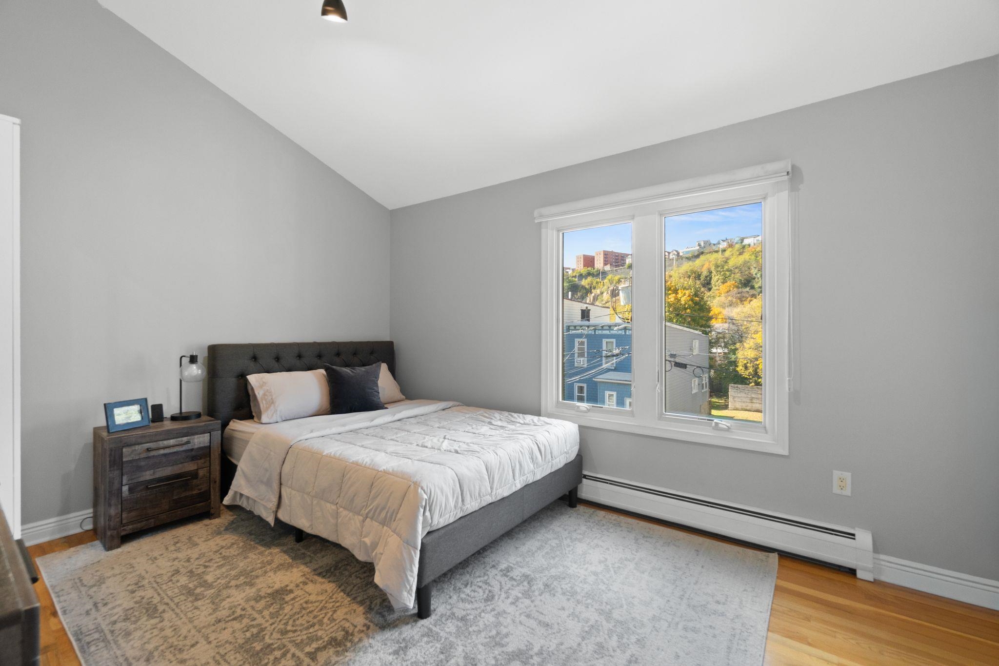 Experience the perfect balance of urban convenience and suburban comfort in this elegant three-bedroom, three-and-a-half-bath smart townhome offering nearly 2,000 square feet of refined living space just minutes from Manhattan and Hoboken. Across three levels, the home showcases custom woodworking, elegant trim, designer finishes, and integrated smart-home features. The entry floor includes a welcoming foyer, updated GE washer and dryer (2024), a full bath, and a spacious bonus room that opens to a private backyard with a Trex composite deck that is perfect for outdoor dining and entertaining. Wainscoting continues up the stairs to the main level, which offers open living and dining areas flowing seamlessly into a chef’s kitchen with granite countertops, ample cabinetry, and high-end stainless-steel appliances. Upstairs, the primary suite features vaulted ceilings, custom built-ins, and an updated ensuite bath, along with two additional bedrooms and another full bath. Smart-home technology includes dimmer switches, a Nest thermostat on each floor, a smart doorbell, and a backyard floodlight camera, plus Ethernet wiring in key locations throughout the home. Additional upgrades include Andersen Series 400 windows (2025), a new central air-conditioning system (2023), LED recessed lighting, newer kitchen appliances and GE washer and dryer (2024). Set on a quiet residential street across from a playground, this home offers peaceful living with private parking, a single-car garage, and driveway. All just minutes to Midtown Manhattan via NJ Transit and within easy walking distance of Hoboken’s waterfront, parks, and dining.