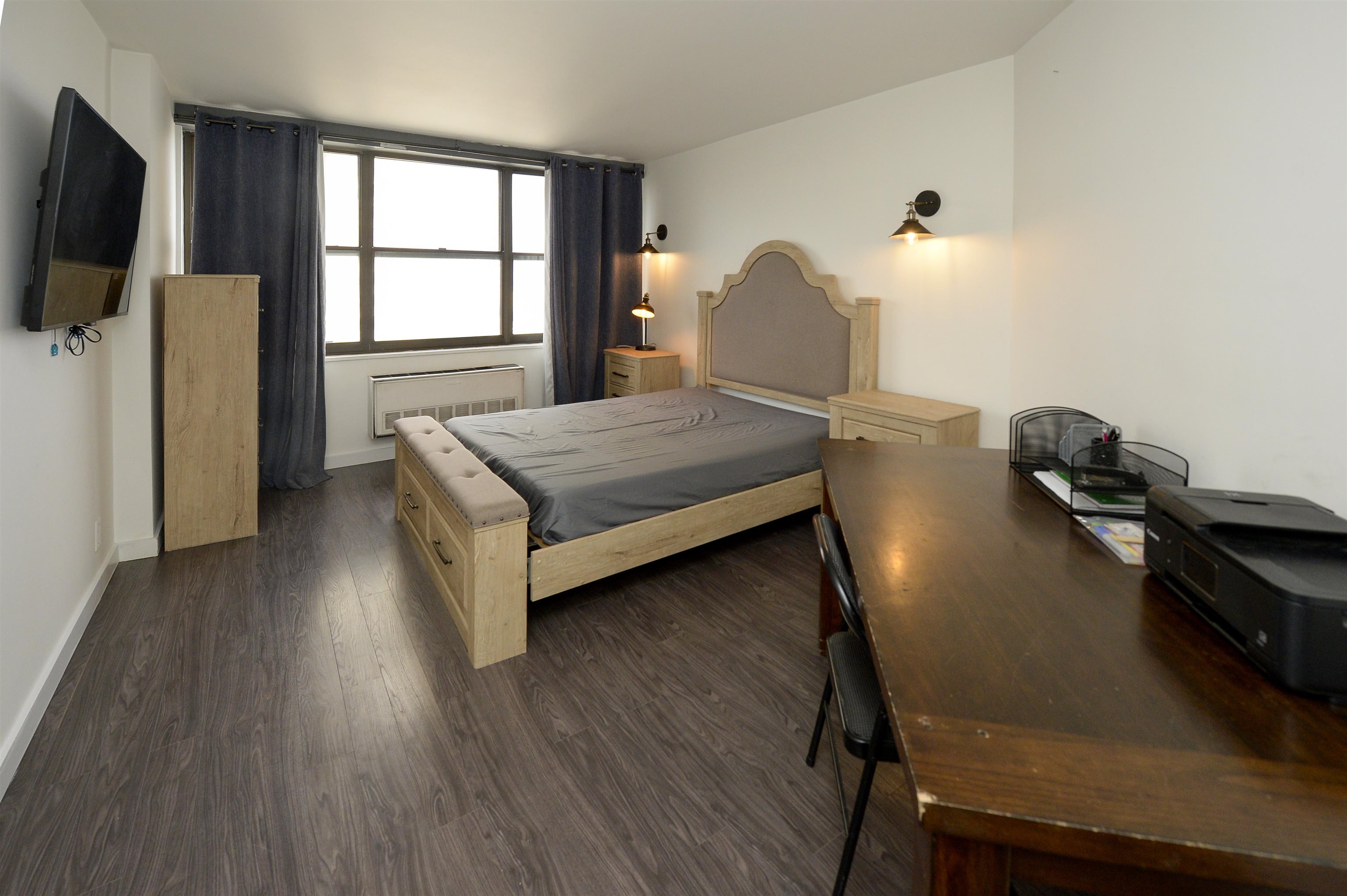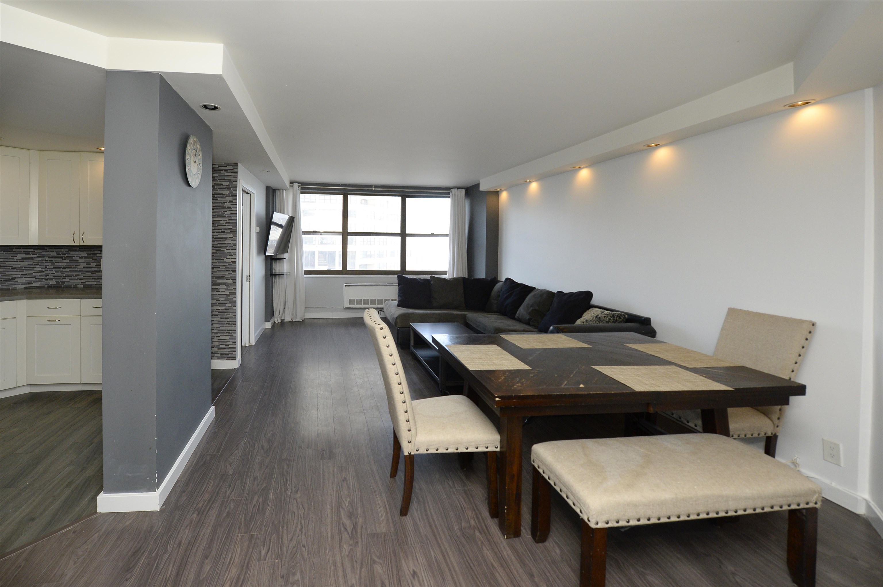 This beautifully renovated 2-bedroom, 2-bath 979 sft condo features direct NYC midtown/uptown & GWB views, modern finishes, spacious ensuite primary bedroom, hardwood & tile flooring throughout, as well as an open floor plan that allows the incredible sunrise to fill your entire living space w/ warmth & light. Located in the sought-after Galaxy Towers complex where luxury amenities & peaceful, easy living are just part of life. This includes ALL utilities, 24-hour concierge, security services, pools, hot tubs, exclusive spa & gym featuring high-end equipment, saunas, tennis & pickleball courts, landscaped outdoor sanctuary, conference, children' rooms,& much more! Perfectly situated in the heart of all the city has to offer, making any form of commuting a breeze, conveniently located near James J Braddock North Hudson County Park and North Hudson Dog Park. The Galaxy welcomes up to 2 pets.