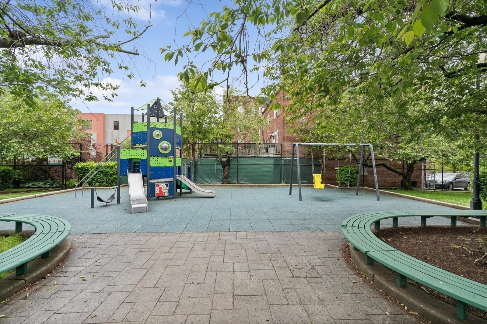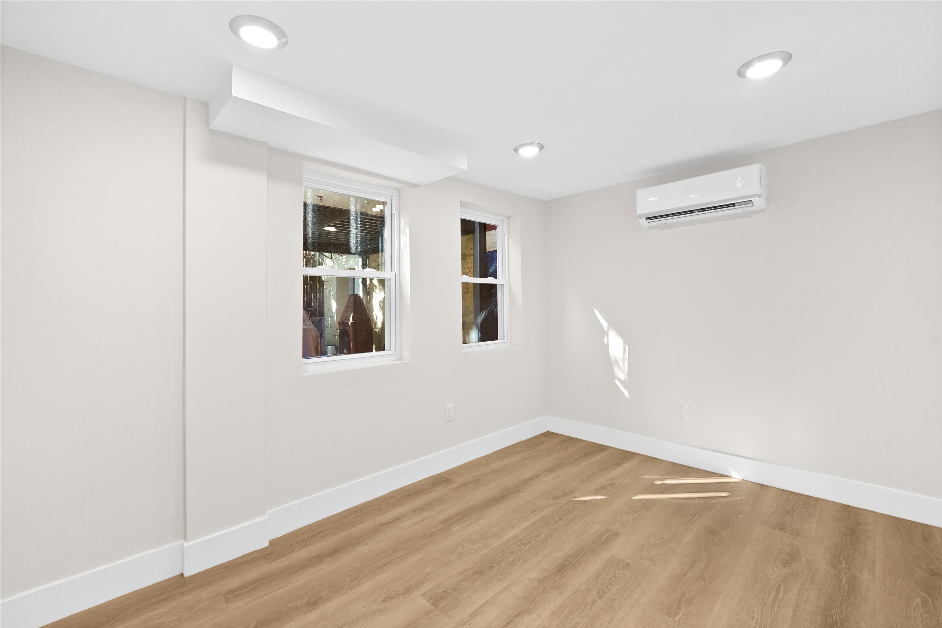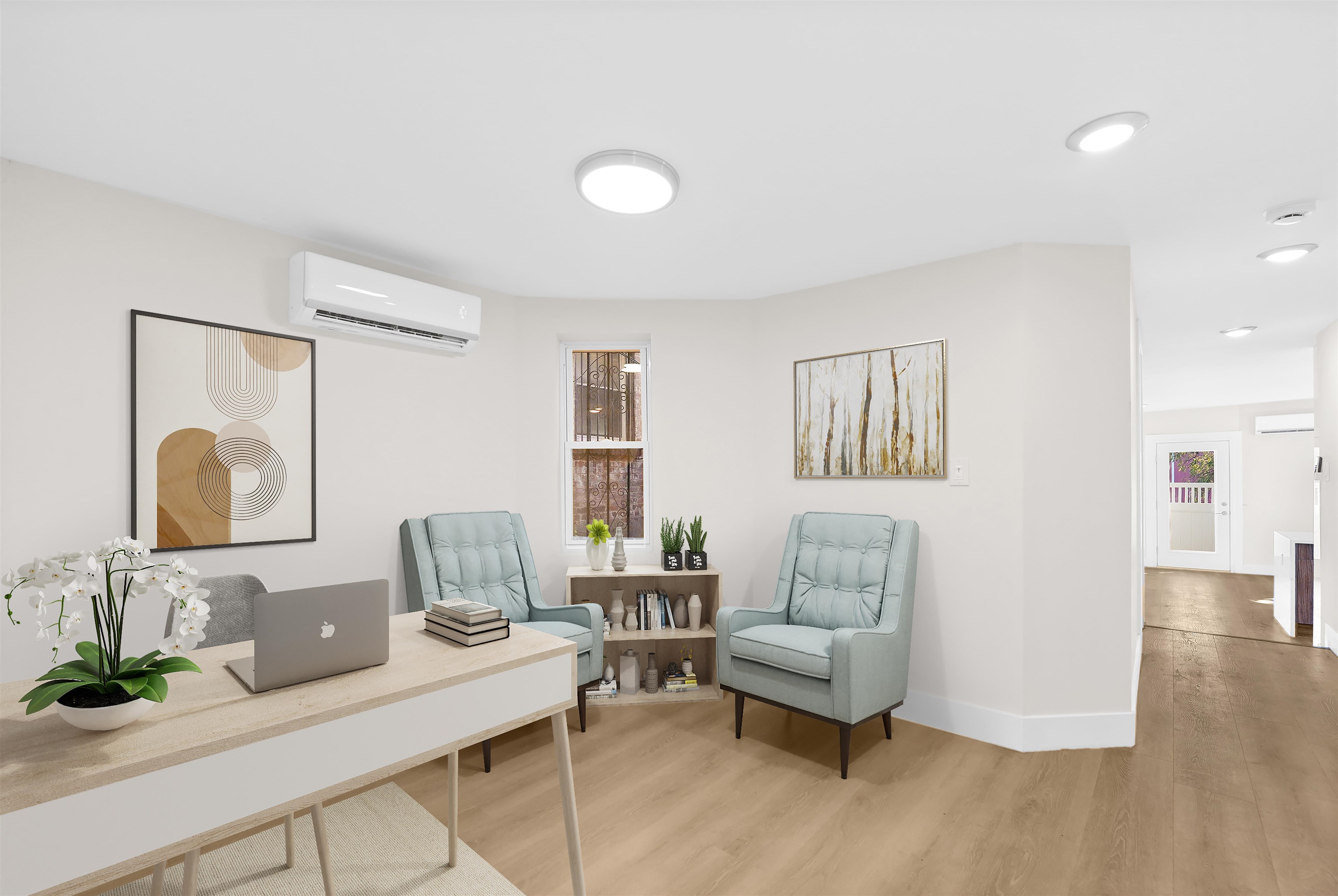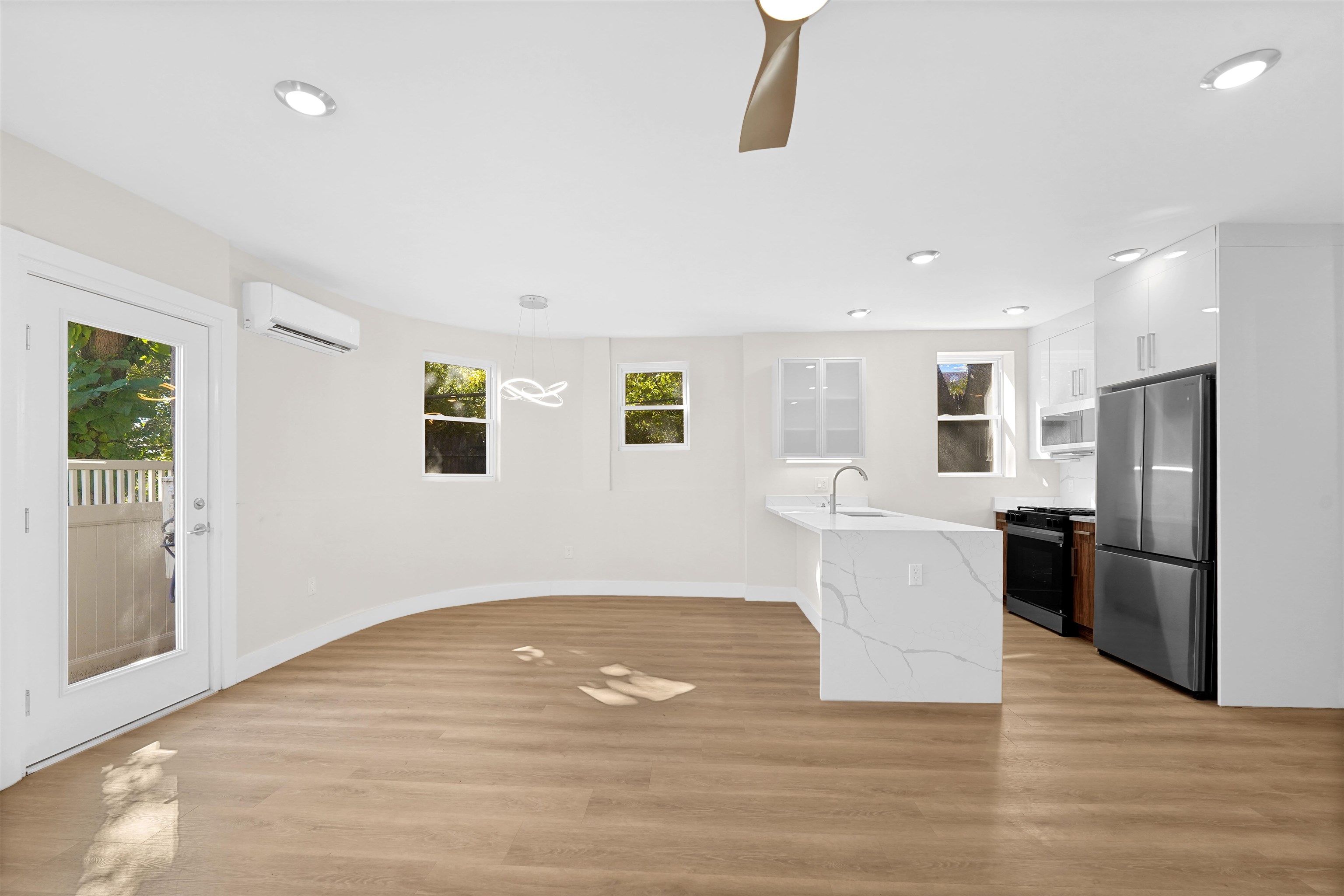 Discover sophisticated urban living in this stunning garden level condominium. This meticulously designed 2-bedroom, 1-bathroom residence offers an unparalleled blend of modern luxury and comfort. Step into a chef's dream kitchen, featuring top-of-the-line Samsung appliances, a breathtaking waterfall center island, and exquisite two-tone cabinetry adorned with under the counter lighting. Throughout the home, you'll find a consistent theme of refined style, crisp white accents and designer lighting. The open living, dining and kitchen area is washed with natural light from multiple East, Northeast and South facing windows, creating a bright and inviting ambiance. The primary bedroom is a true retreat. The second bedroom and den offer flexible use for the modern buyer. The bathroom features a modern lit and anti-fog mirror, adding both style and functionality. Enjoy ultimate comfort with energy efficient ductless heating and cooling system. Venture outside to your private courtyard with partial NYC views, a rare retreat for relaxing, dining, and morning coffee. This is more than a home; it's a lifestyle. Don't miss the opportunity to experience the epitome of modern elegance at 102 Palisade Ave.