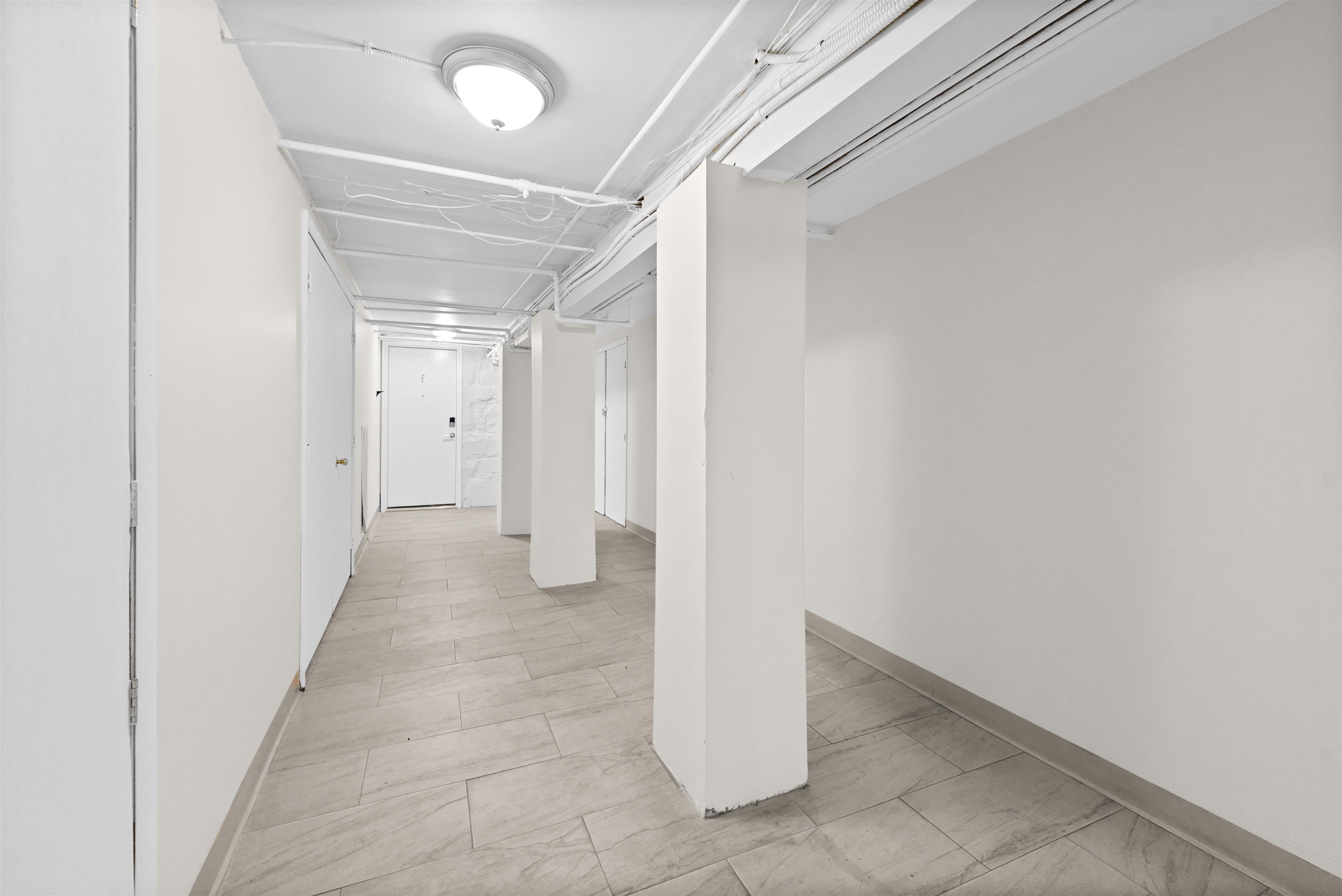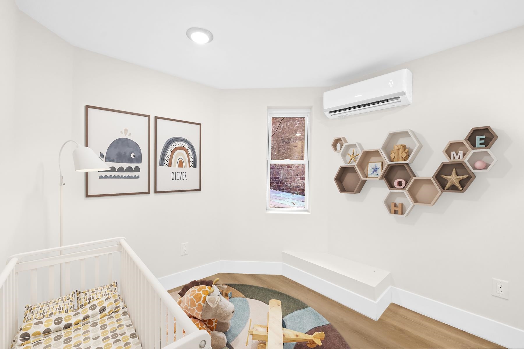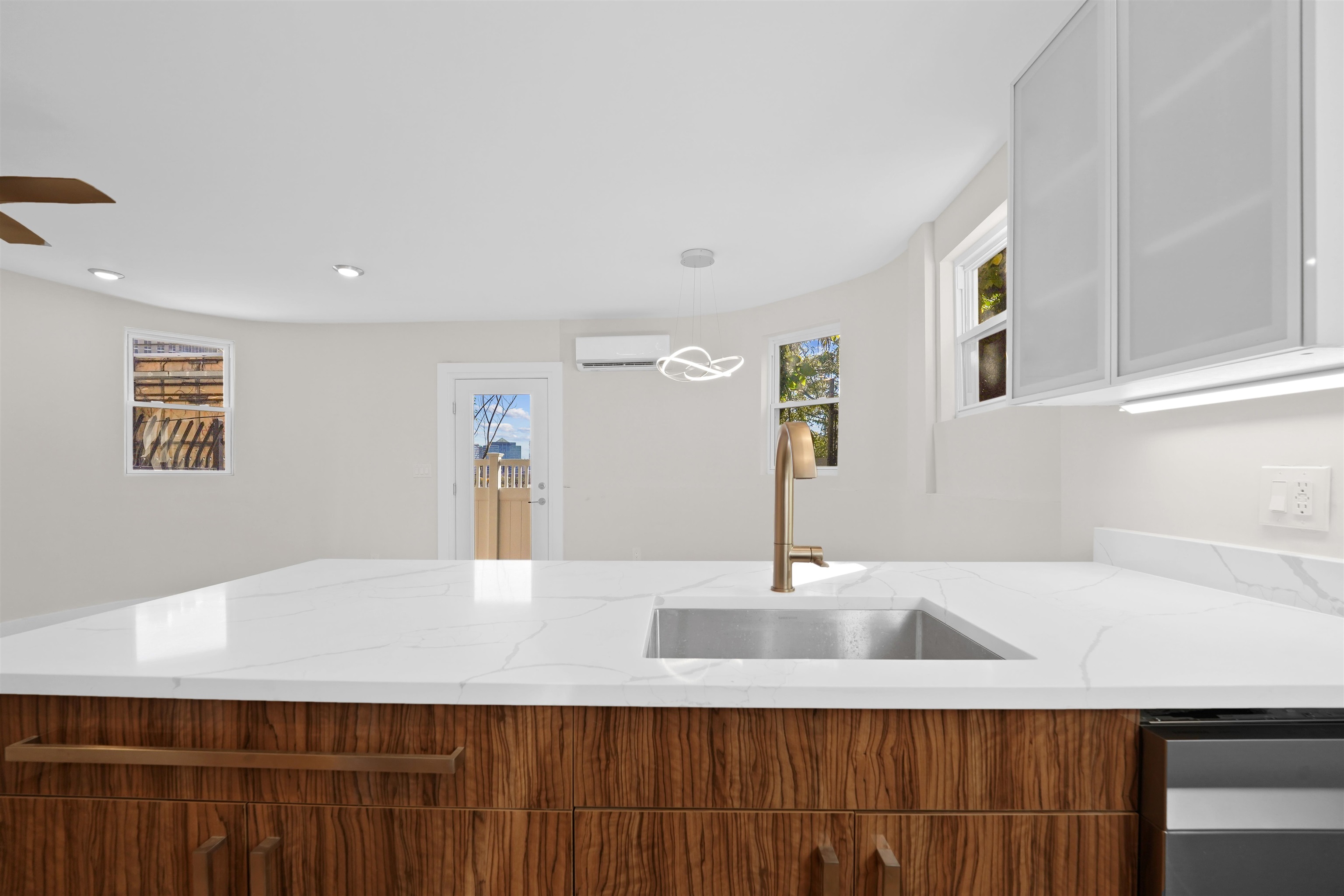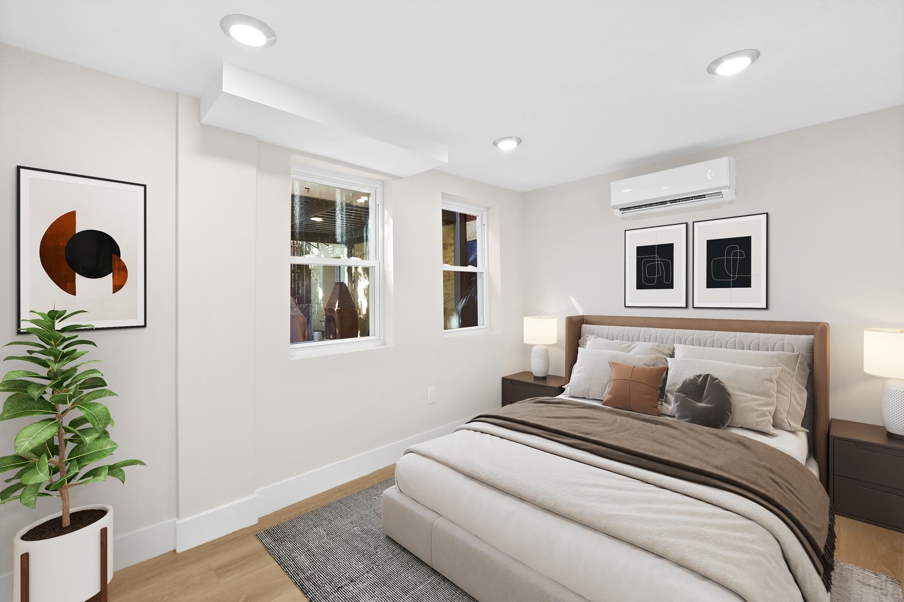 Discover sophisticated urban living in this stunning garden level condominium. This meticulously designed 2-bedroom, 1-bathroom residence offers an unparalleled blend of modern luxury and comfort. Step into a chef's dream kitchen, featuring top-of-the-line Samsung appliances, a breathtaking waterfall center island, and exquisite two-tone cabinetry adorned with under the counter lighting. Throughout the home, you'll find a consistent theme of refined style, crisp white accents and designer lighting. The open living, dining and kitchen area is washed with natural light from multiple East, Northeast and South facing windows, creating a bright and inviting ambiance. The primary bedroom is a true retreat. The second bedroom and den offer flexible use for the modern buyer. The bathroom features a modern lit and anti-fog mirror, adding both style and functionality. Enjoy ultimate comfort with energy efficient ductless heating and cooling system. Venture outside to your private courtyard with partial NYC views, a rare retreat for relaxing, dining, and morning coffee. This is more than a home; it's a lifestyle. Don't miss the opportunity to experience the epitome of modern elegance at 102 Palisade Ave.