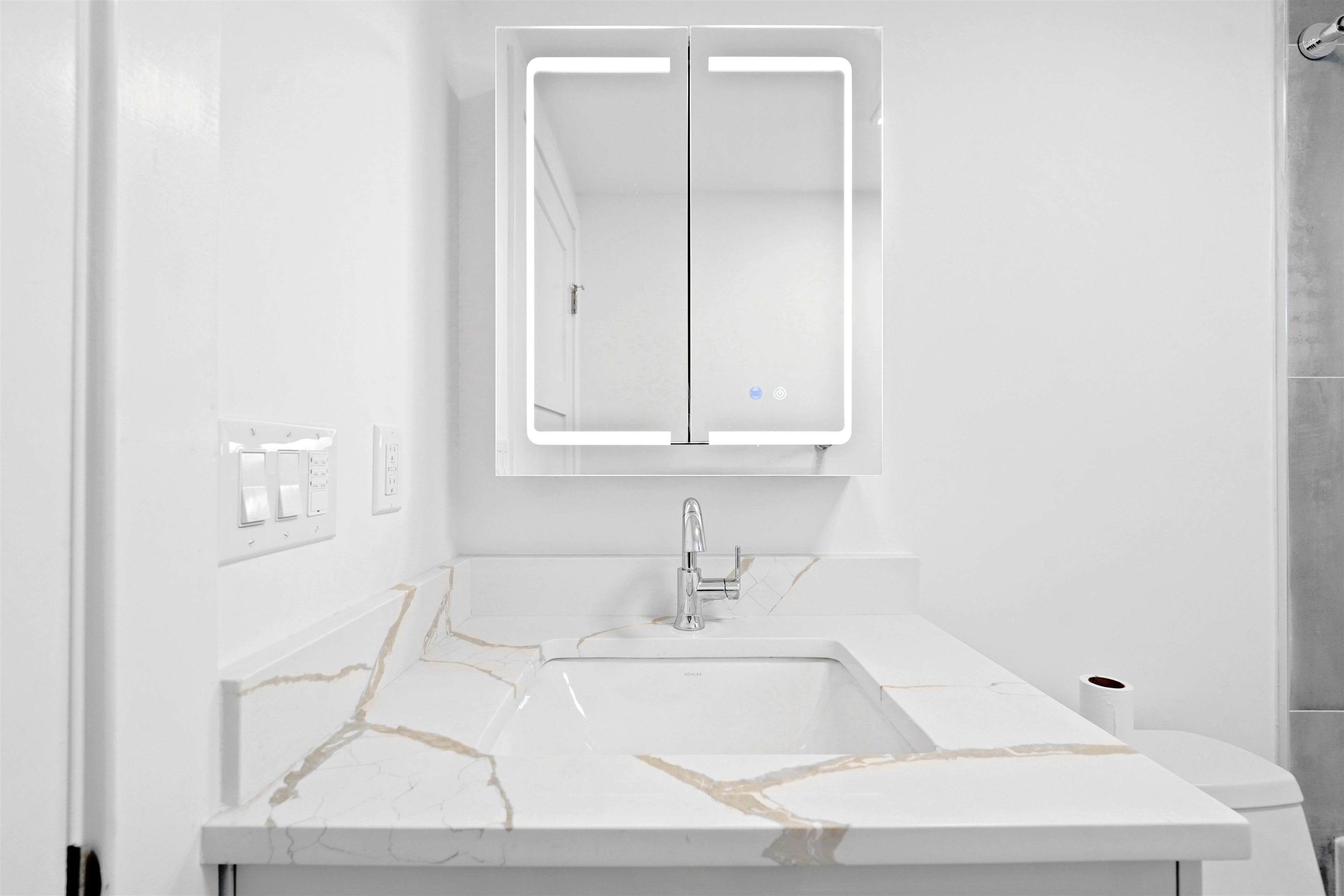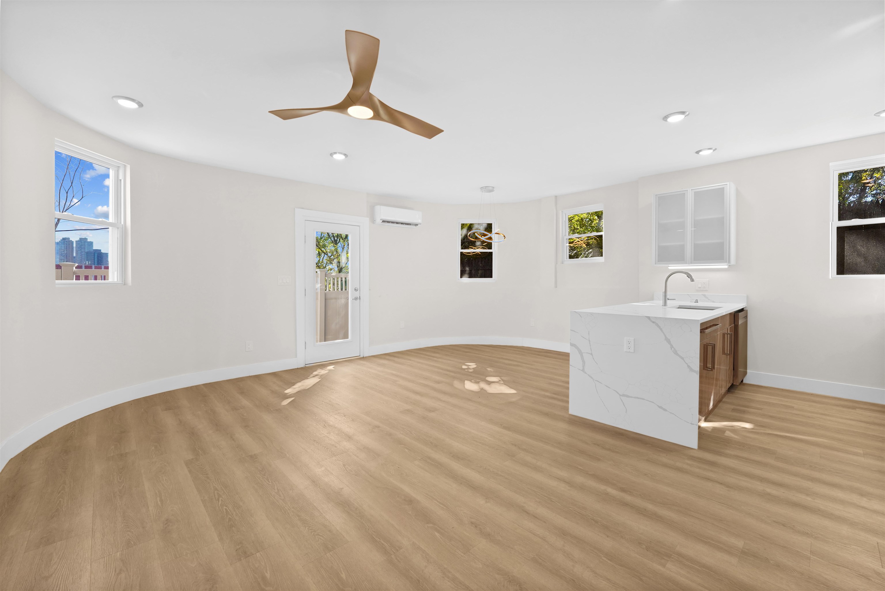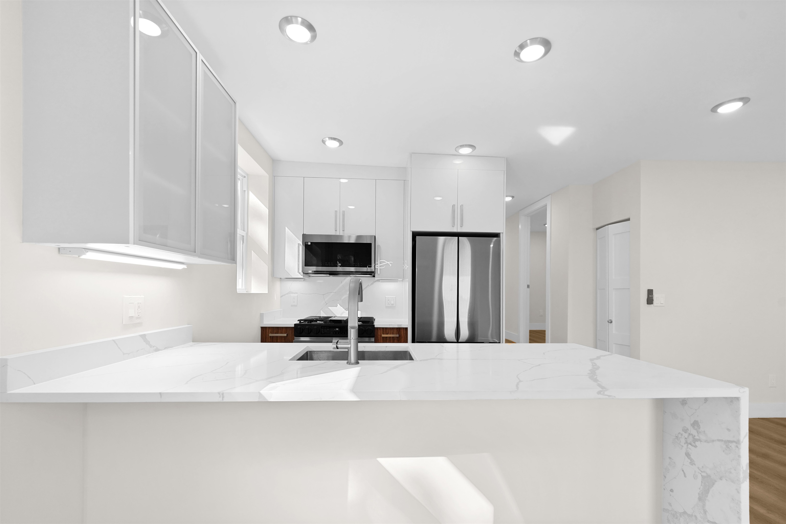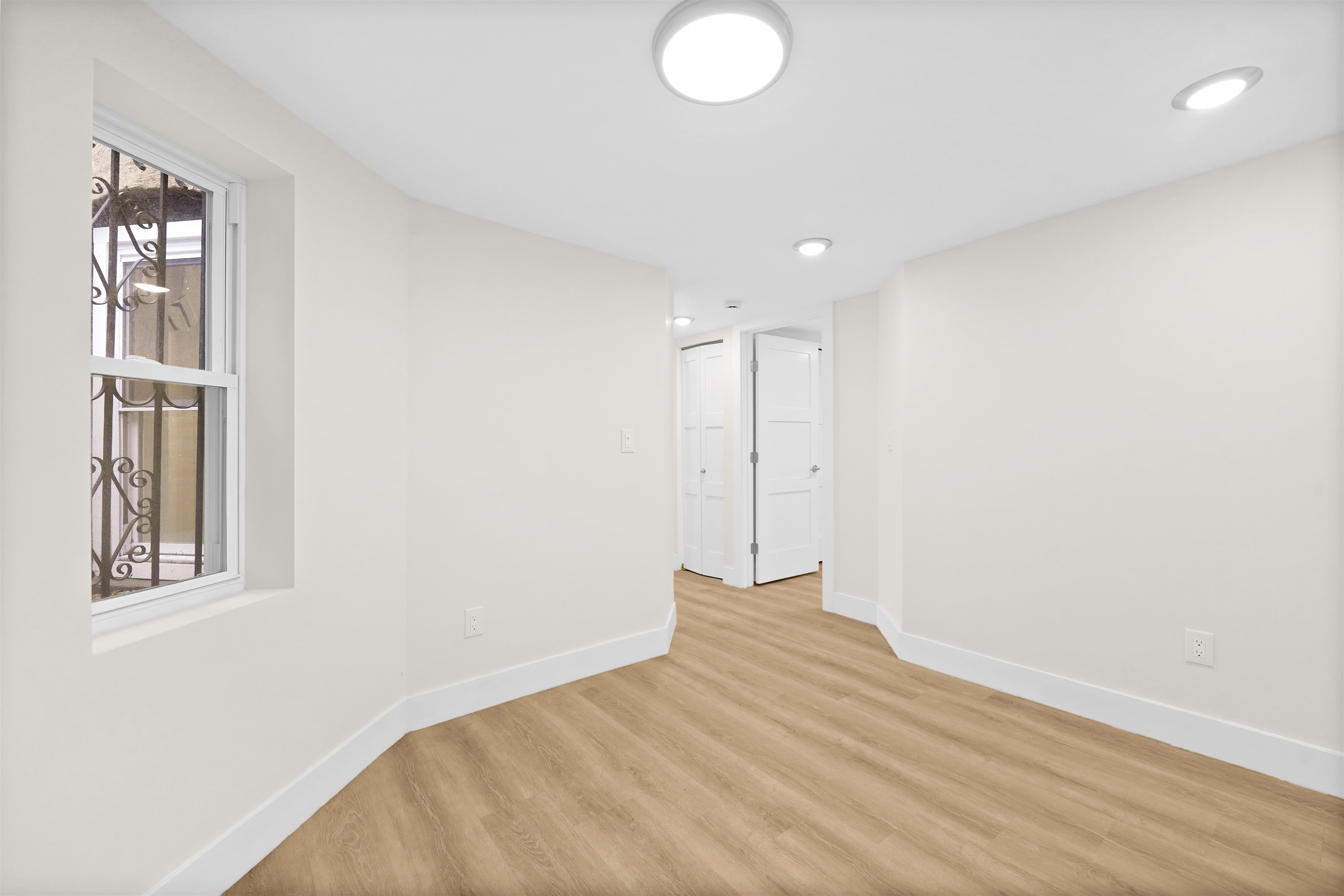 Discover sophisticated urban living in this stunning garden level condominium. This meticulously designed 2-bedroom, 1-bathroom residence offers an unparalleled blend of modern luxury and comfort. Step into a chef's dream kitchen, featuring top-of-the-line Samsung appliances, a breathtaking waterfall center island, and exquisite two-tone cabinetry adorned with under the counter lighting. Throughout the home, you'll find a consistent theme of refined style, crisp white accents and designer lighting. The open living, dining and kitchen area is washed with natural light from multiple East, Northeast and South facing windows, creating a bright and inviting ambiance. The primary bedroom is a true retreat. The second bedroom and den offer flexible use for the modern buyer. The bathroom features a modern lit and anti-fog mirror, adding both style and functionality. Enjoy ultimate comfort with energy efficient ductless heating and cooling system. Venture outside to your private courtyard with partial NYC views, a rare retreat for relaxing, dining, and morning coffee. This is more than a home; it's a lifestyle. Don't miss the opportunity to experience the epitome of modern elegance at 102 Palisade Ave.