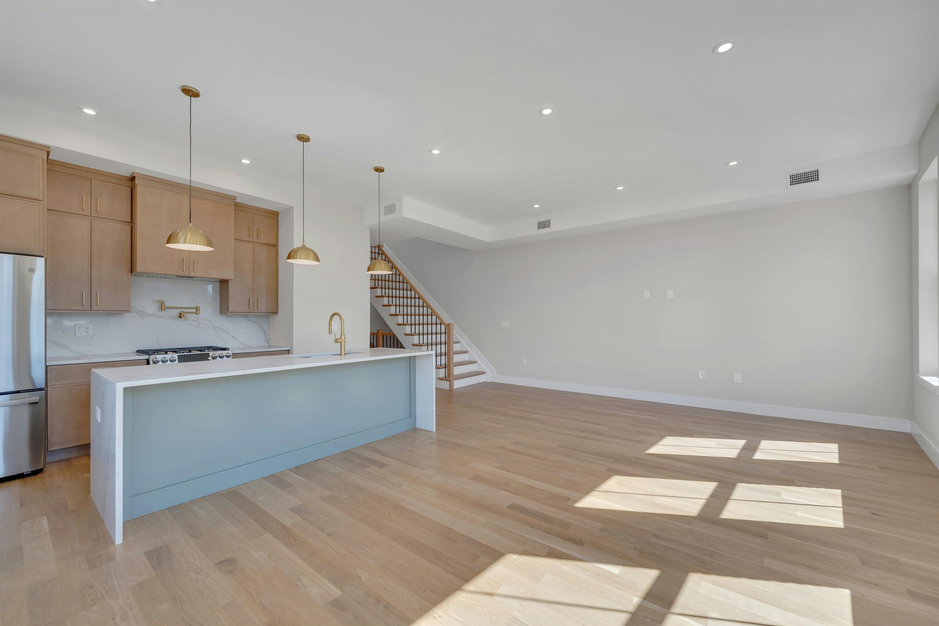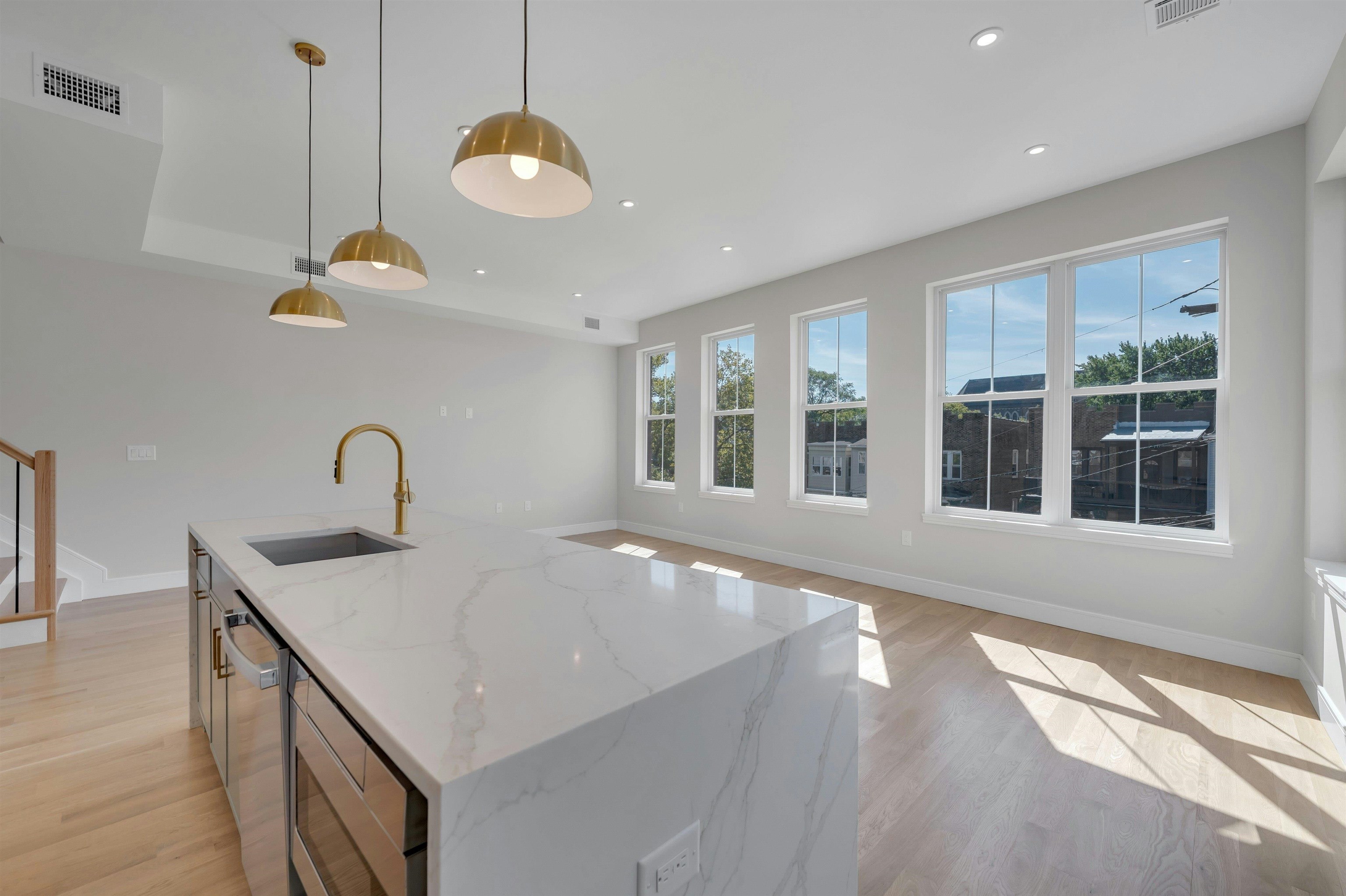 Step inside Unit 2 at 26 Clinton Avenue, an exceptional new-construction condominium offering sophisticated design, elevated finishes, and modern functionality in the heart of Bergen-Lafayette. Spanning 1,536 sq ft, this three-bedroom, two-bathroom residence blends clean architectural lines with warm textures. 10-foot ceilings,8-foot doors, and white oak hardwood floors create an expansive, light-filled atmosphere that feels inviting at every hour of the day. The chef’s kitchen is a stunning centerpiece, featuring Fabuwood Lunacabinetry, a Pistachio island, and quartz countertops and backsplash. Brass fixtures and hardware lend a timeless elegance that perfectly complements the home’s modern design. Each bathroom is carefully curated with backlit designer mirrors and premium finishes, creating a sophisticated, spa-like feel. All bedrooms are generously sized with abundant natural light, while primary suites feature private balconies and en-suite bathrooms for a touch of luxury and privacy. This unit boasts a finished private roofdeck with Manhattan and Downtown Jersey City skyline views—the perfect space for entertaining or unwinding above the neighborhood. Additional highlights include brand-new Rheem HVAC systems, 40-gallon powervent hot water tanks, and energy-efficient construction with Andersen 100 Series windows throughout. Set in Bergen-Lafayette—Jersey City’s fastest-growing and most rapidly appreciating neighborhood—this location is surrounded by a wave of investment, development, and community growth. 26 Clinton Ave offers the perfect balance of urban convenience and long-term value.