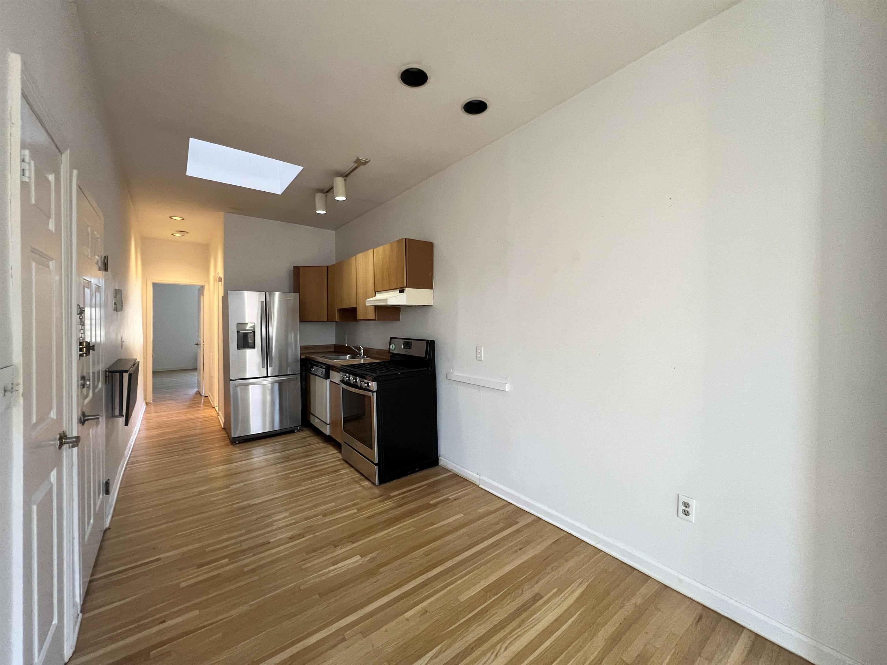 Why rent when you can own a place of your own in prime Downtown Hoboken close to Path, restaurants and Washington Street shopping. This 1-bedroom condo offers a smart layout and endless potential for the buyer ready to bring their vision to life. The home welcomes you with a spacious front living room, featuring high ceilings and two large windows that flood the space with natural light. A coat closet by the entrance adds everyday convenience, a skylight for additional light and hardwood floors throughout. The living room flows into a well-proportioned kitchen with great bones and plenty of room to reimagine a modern cooking and dining space. The bedroom sits in the back of the unit, away from the street, offering peacefulness, privacy, and two closets for ample storage. Additional perks include shared washer/dryer, dedicated storage space in basement, and access to a shared backyard. Sold as-is, this condo is the perfect canvas for a buyer looking to customize and build equity in one of Hoboken’s most sought-after areas. Own your home and invest in your future! Some photos are virtually staged