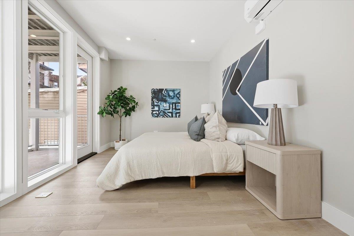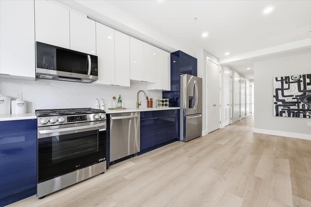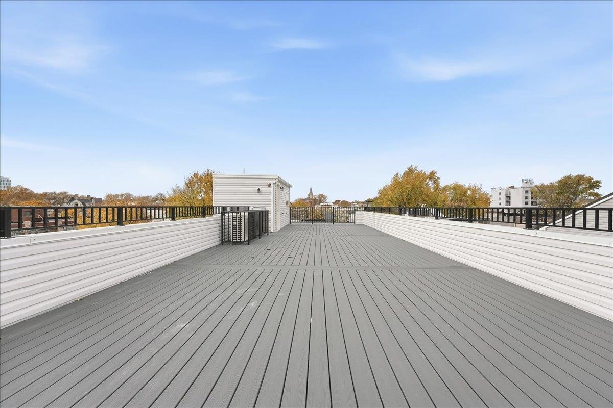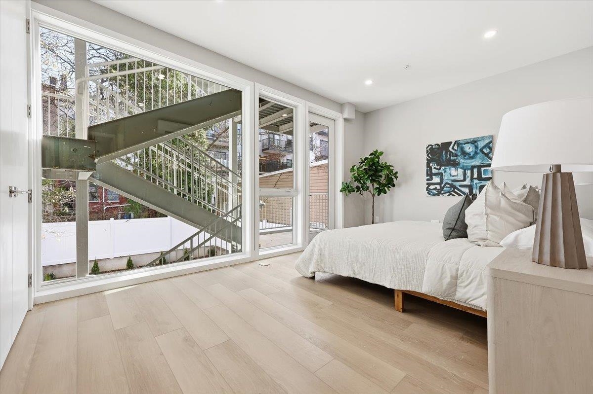 Designed for both serenity and sophistication, this elevated home offers modern finishes, tree-top views and an unbeatable Heights location just 1 block to 2nd Street stairs and Lightrail station. A hidden haven in the Heights, this beautifully crafted 3 bed, 2 bath residence blends bespoke finishes with gorgeous private rooftop-shared with unit 3- for a rare retreat. Wide plank floors ground the space, while natural light floods through the floor-to-ceiling windows illuminating the open floorplan. The kitchen offers clean lines and contemporary flair with modern white & blue cabinetry, gleaming quartz countertops, herringbone tile backsplash, sleek brass-accented fixtures and stainless steel appliances. Both bathrooms are beautifully finished with floor-to-ceiling porcelain tile, herringbone floors, and luxurious rainhead multi-spray shower systems and soaking tub. One bedroom is shielded with privacy glass giving both sunshine and seclusion, while the primary ensuite showcases a full wall of glass for a gorgeous view & lots of natural light. Top it off with a brand new stacking LG washer and dryer for everyday ease and convenience. Situated just one block from the 2nd Street Light Rail station, this home not only provides direct access to Hoboken and NYC connections, but also Riverview Fisk and Pershing Field Park and Reservoir. Jersey City Heights is known for its vibrant community, excellent parks and schools, boutique shops and restaurants and close proximity to NYC and surrounding areas.