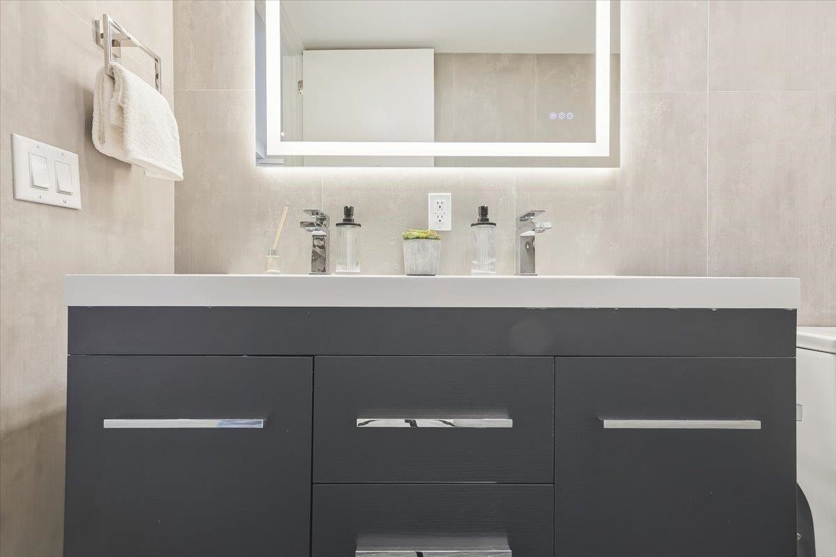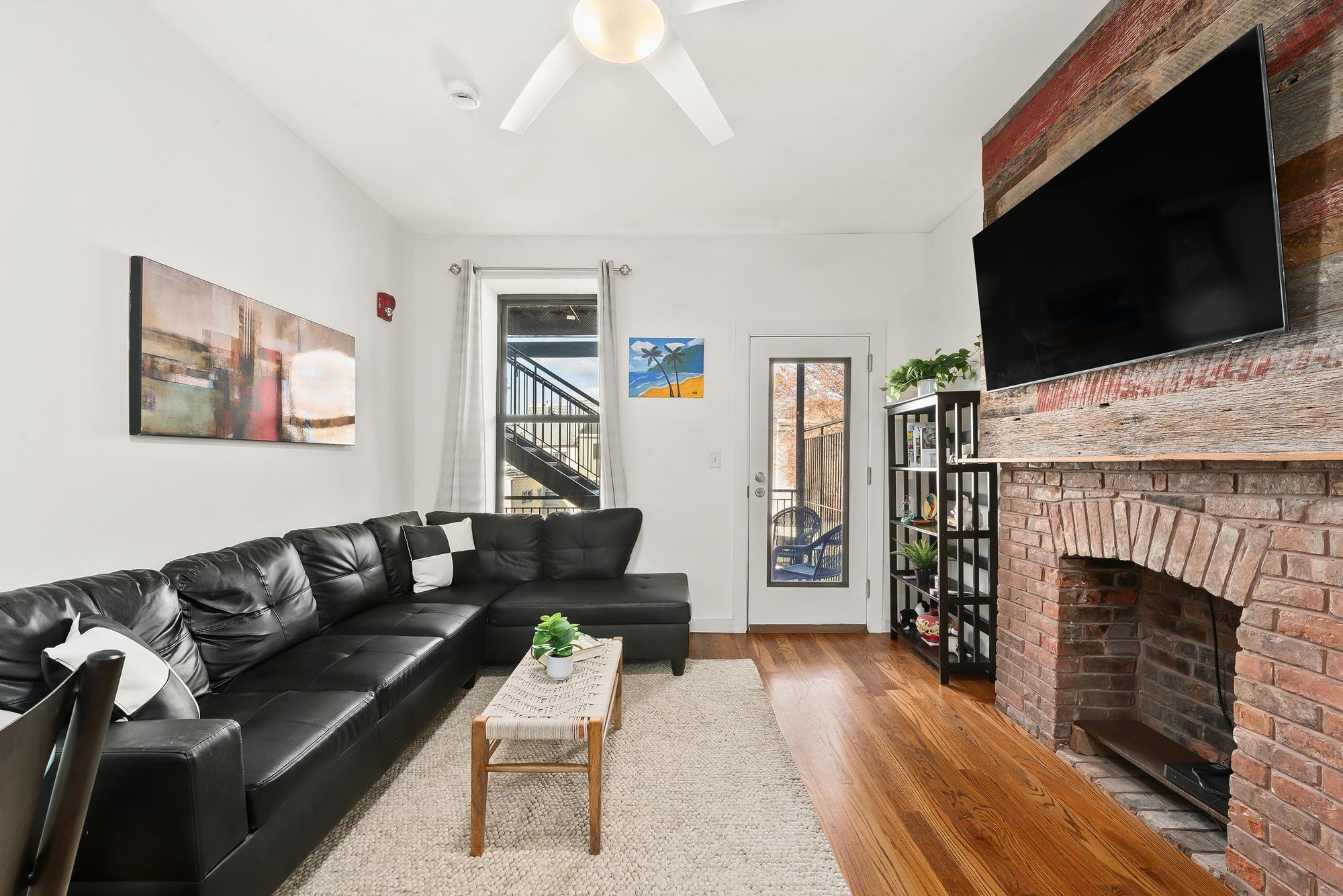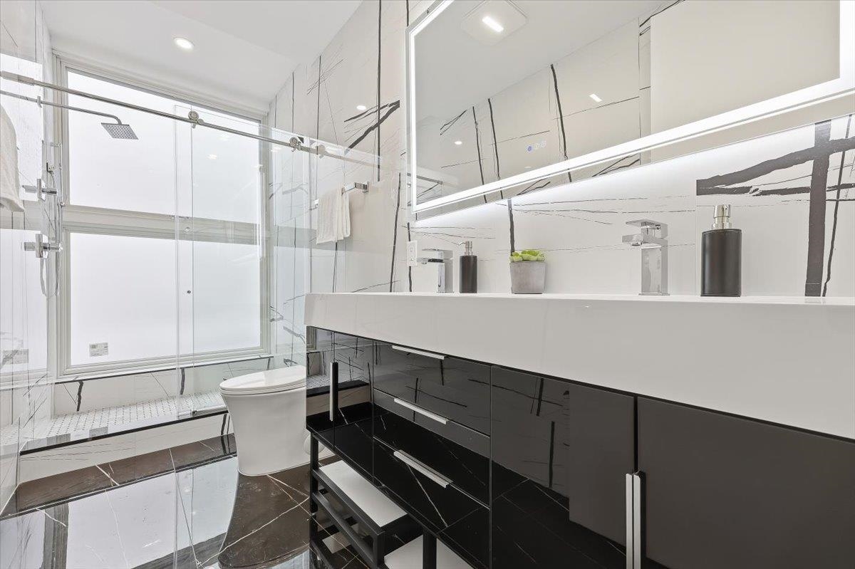 Designed for both serenity and sophistication, this elevated home offers modern finishes, tree-top views and an unbeatable Heights location just 1 block to 2nd Street stairs and Lightrail station. A hidden haven in the Heights, this beautifully crafted 3 bed, 2 bath residence blends bespoke finishes with gorgeous private rooftop-shared with unit 3- for a rare retreat. Wide plank floors ground the space, while natural light floods through the floor-to-ceiling windows illuminating the open floorplan. The kitchen offers clean lines and contemporary flair with modern white & blue cabinetry, gleaming quartz countertops, herringbone tile backsplash, sleek brass-accented fixtures and stainless steel appliances. Both bathrooms are beautifully finished with floor-to-ceiling porcelain tile, herringbone floors, and luxurious rainhead multi-spray shower systems and soaking tub. One bedroom is shielded with privacy glass giving both sunshine and seclusion, while the primary ensuite showcases a full wall of glass for a gorgeous view & lots of natural light. Top it off with a brand new stacking LG washer and dryer for everyday ease and convenience. Situated just one block from the 2nd Street Light Rail station, this home not only provides direct access to Hoboken and NYC connections, but also Riverview Fisk and Pershing Field Park and Reservoir. Jersey City Heights is known for its vibrant community, excellent parks and schools, boutique shops and restaurants and close proximity to NYC and surrounding areas.