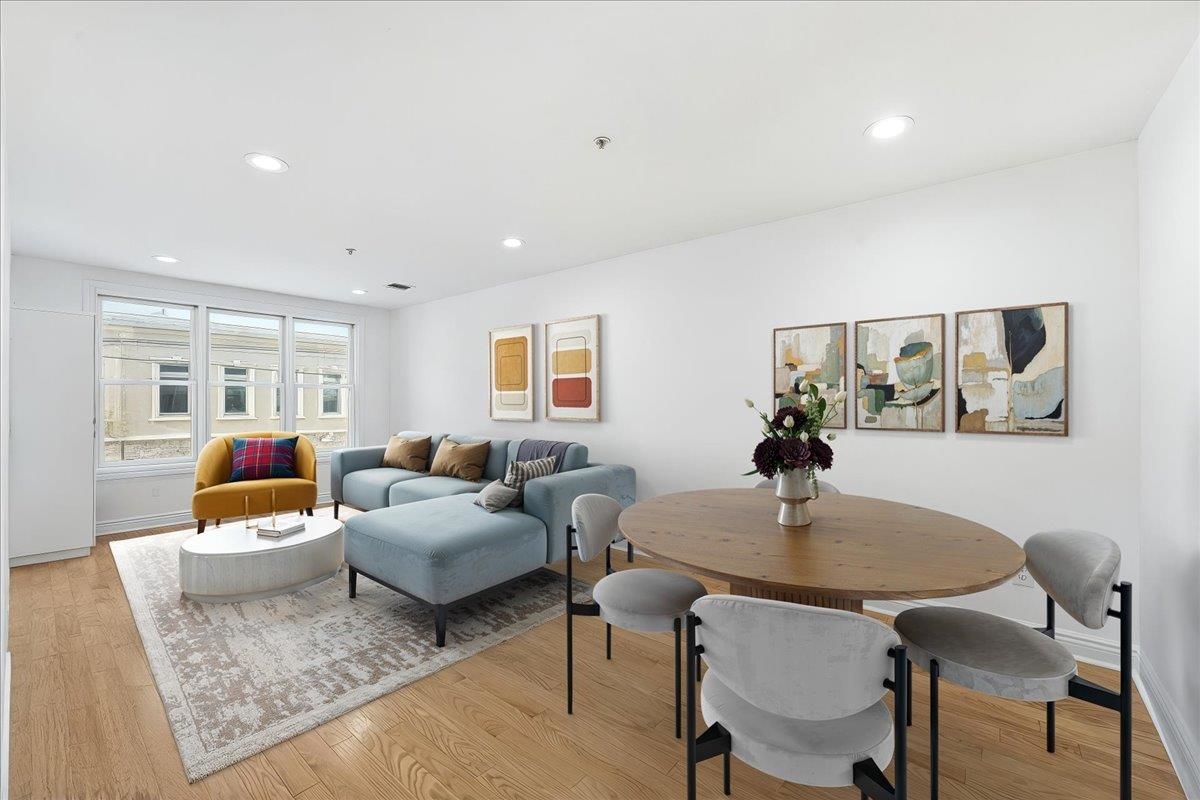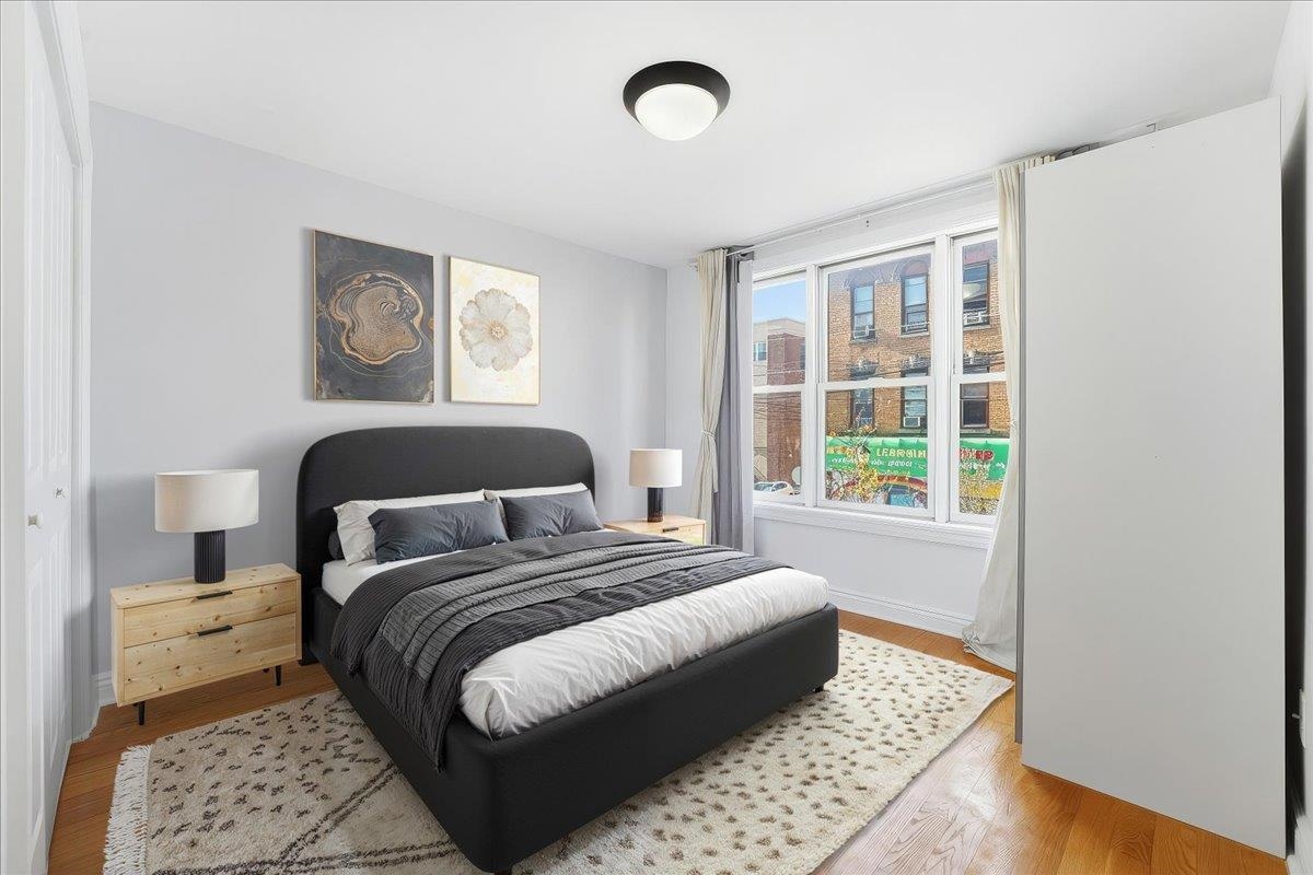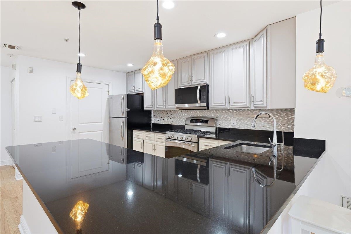Welcome to 544 28th Street, Apt. 202, a spacious and modern condo in the heart of Union City. This residence perfectly balances urban convenience with stylish comfort, and it comes with its own deeded garage parking spot, a rare find in the neighborhood. The bright open layout flows through the living spaces, anchored by an open-concept kitchen with a wrap-around island. The kitchen features sleek stainless-steel appliances, black granite countertops, and ample cabinetry, with newer appliances including a microwave, dishwasher, and in-unit washer/dryer. In the living and dining areas, recessed LED lighting (hi-hats) enhances the modern aesthetic. The home also includes smart home upgrades, such as smart appliances, smart switches, a smart lock, and even a smart lobby entrance for added convenience. Two sizable bedrooms with generous closet space (including built-ins) provide plenty of storage room. The modern bathroom features porcelain tile and a glass-enclosed shower. The home has refreshed paint and refreshed flooring, and central air and heat with hardwood floors and quality finishes throughout underscore the unit’s premium feel. As mentioned, a garage space provides ultimate urban comfort. There is also a separate storage area near the garage. The elevator building offers a security intercom, adding both ease and security. This area of Union City is densely walkable, filled with local shops, cafés, restaurants, and everyday conveniences. Commuters will benefit from close proximity to NYC, with nearby transit buses running frequently.