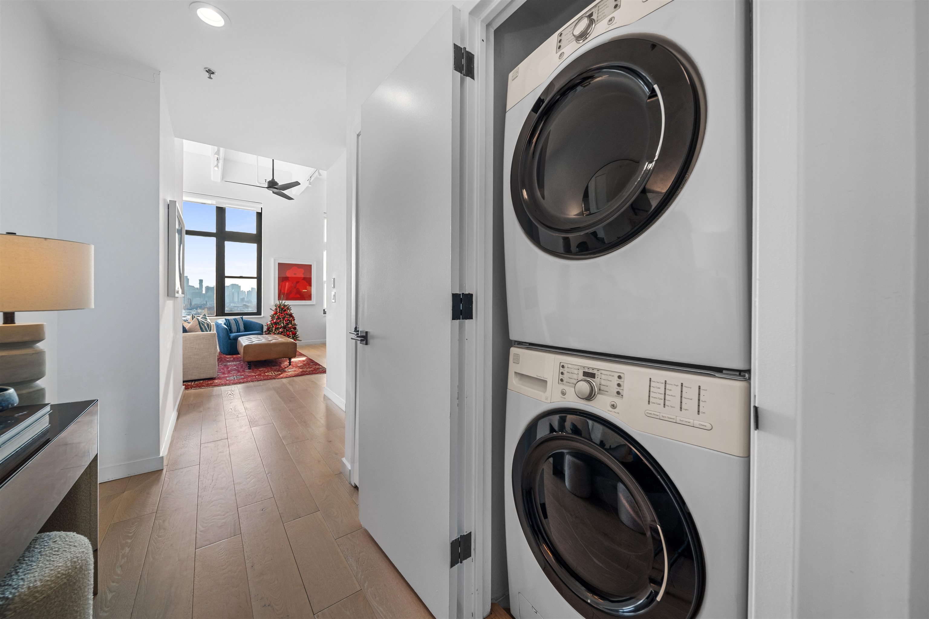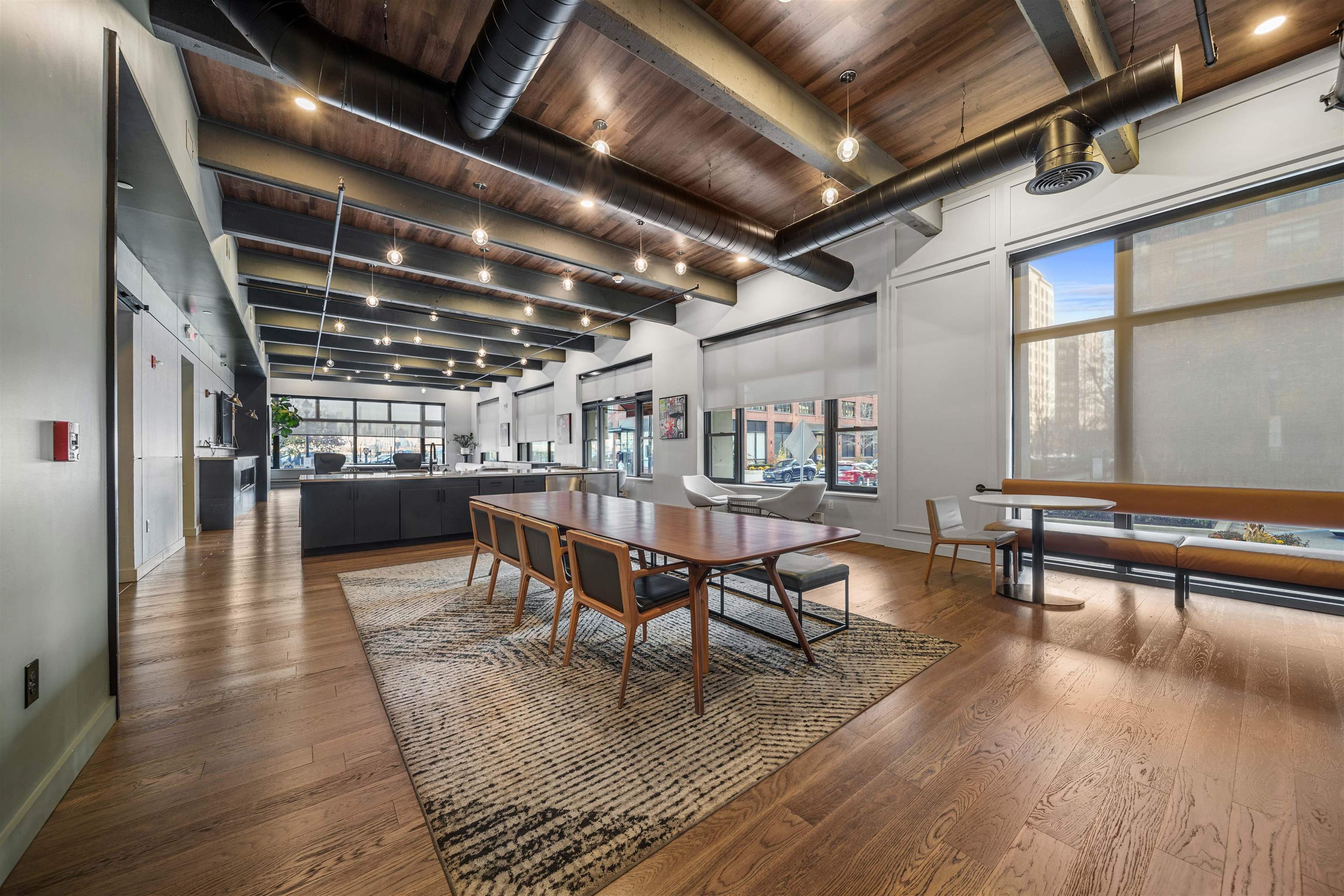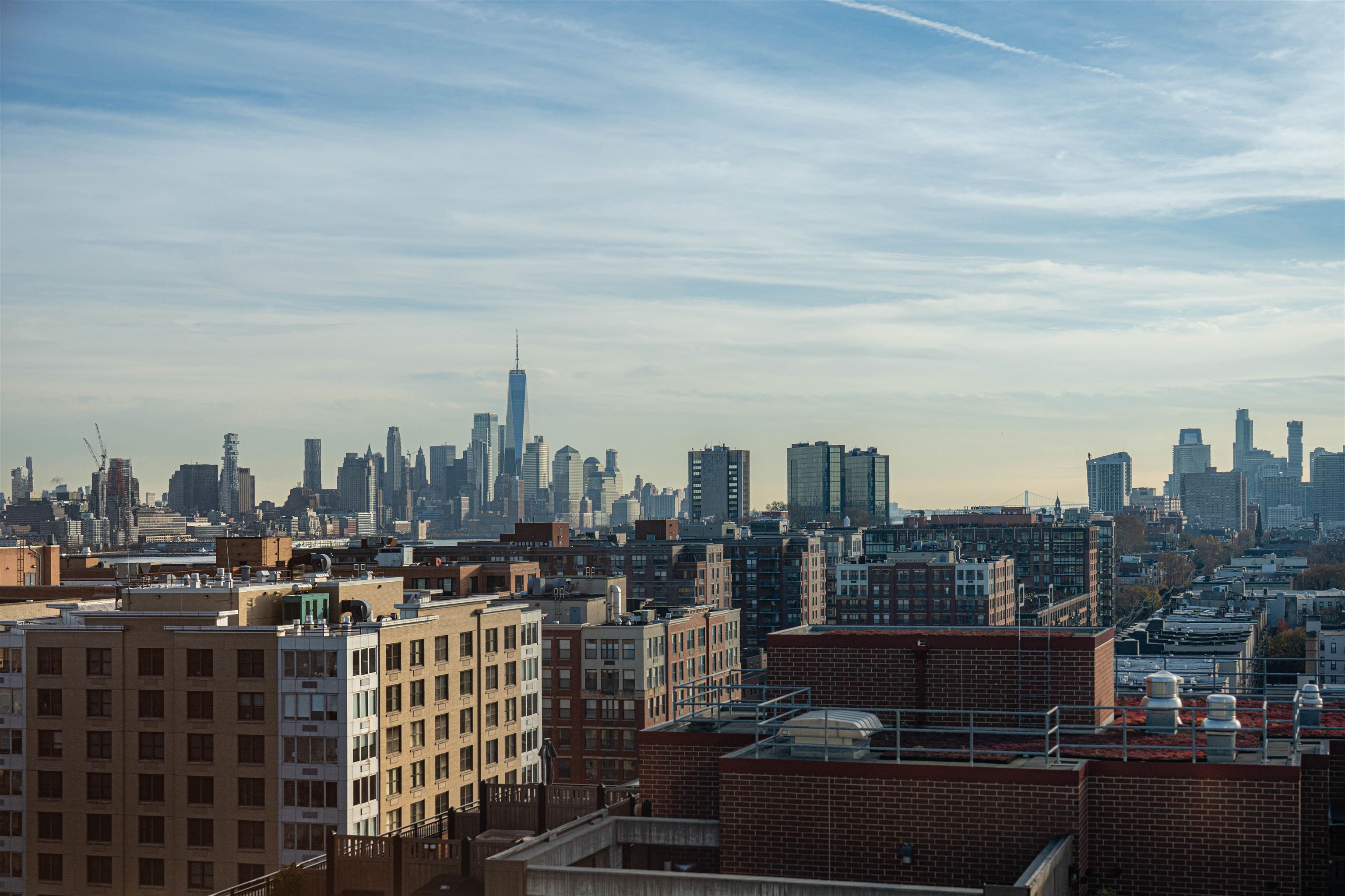 Welcome to Residence 11P at the iconic Hudson Tea — a bright, south-facing true one-bedroom with soaring 14-foot ceilings and open New York City skyline views, including the Freedom Tower. Spanning 755 square feet, this beautifully upgraded home blends historic loft character with modern finishes and an effortless uptown lifestyle. The open layout features light oak wide-plank floors, oversized windows, and incredible natural light. The kitchen is outfitted with espresso cabinetry, full granite counters, stainless steel appliances, and a sleek backsplash. The spacious bedroom enjoys NYC views and includes a custom walk-in closet with built-ins. Additional comforts include full-size washer/dryer, abundant hallway storage, and an oversized crawl space for seasonal items. Hudson Tea amenities include a 24-hour doorman, on-site gym, resident lounge, children’s playroom, and shuttle to the PATH. Perfectly located along the uptown waterfront near the ferry to NYC, shops, cafés, parks, schools, and dining. One covered garage parking space is included in nearby garage with a $140/mo HOA.