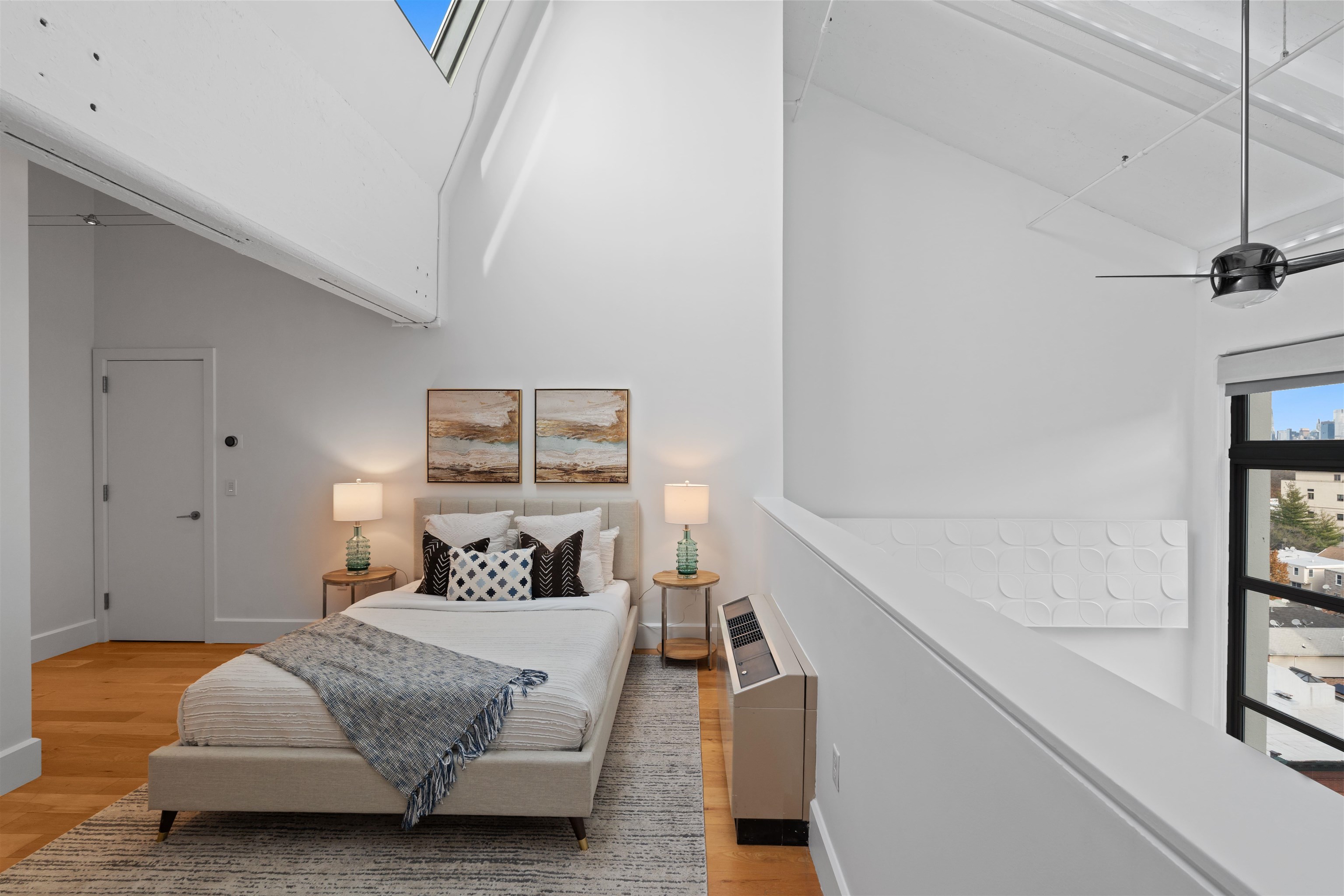 This 1,400 sq.ft. 2 bedroom, 2 bathroom duplex penthouse at Canco Lofts is a must see! The open floor plan highlights soaring 28’ ceilings with north and east facing floor to ceiling windows capturing dramatic Empire State Building views and city views. The first floor offers a large living space with a dry bar next to the kitchen, built in fireplace and tons of custom touches throughout. The kitchen and two full bathrooms maintain a contemporary design with an industrial feel: finishes like white lacquer cabinets, engineered stone countertops, glass tile backsplash & high-end stainless steel appliances complete the look. The oversized space upstairs accommodates 2 large bedrooms, both of which have vaulted ceilings and skylights. Other key features of the home include 5" plank white oak flooring & multi-zone A/C and heat; garage parking can be rented for an additional cost. Canco Lofts is a full service, 24 hour doorman building that features over 10,000 sq.ft. of amenity space including screening room, entertainment room, indoor basketball court, sun deck, outdoor grills, a massive gym that competes with private gyms, dog park & spa, and children’s play room. Canco Lofts is also footsteps away from bustling Newark Avenue and a short walk or resident shuttle ride to the PATH. Plus there is almost 15 years left on Canco’s 30 year tax abatement!