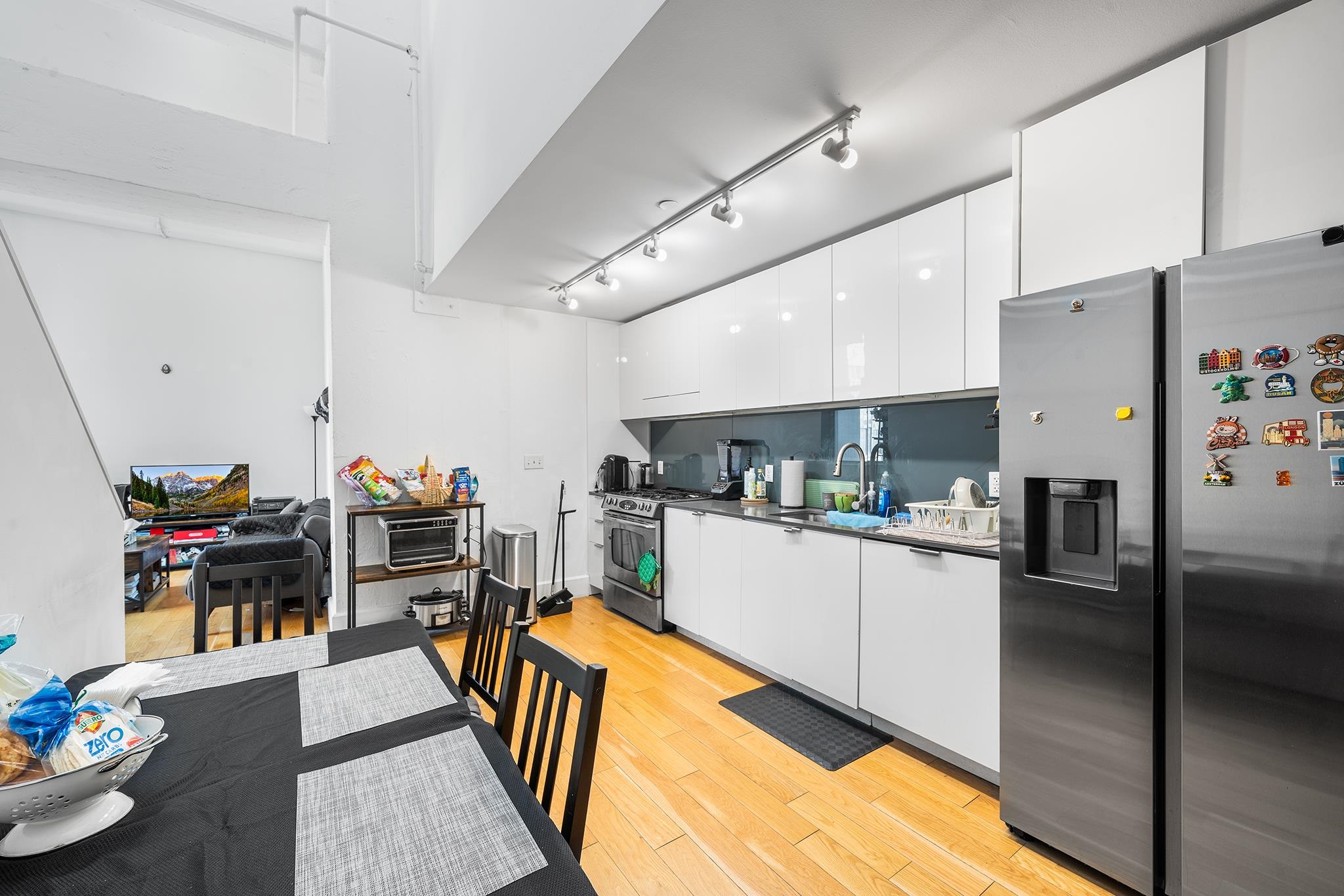 Soaring ceilings, sun-drenched spaces, and modern elegance define this one-of-a-kind penthouse duplex loft in the iconic Canco Lofts — just minutes from the Journal Square PATH. Experience true loft living inside this dramatic industrial conversion, features 27-foot ceilings, 14-foot windows, and a skylight that fills the home with brilliant natural light. The first level opens through a bright foyer into a designer eat-in kitchen with white lacquer cabinetry, engineered stone countertops, a glass tile backsplash, and premium stainless steel appliances — including a hidden dishwasher and disposal. The open living area, accented by exposed concrete and beautiful views, offers the perfect space for entertaining or unwinding. Upstairs, your private retreat awaits with vaulted ceilings, skylight, and a walk-in closet for abundant space and serenity. Residents enjoy world-class amenities: a 24-hour concierge, fitness center, theater, half basketball court, pool tables, lush gardens with BBQ areas, sun deck, dog park, spa, and children’s playroom. A private shuttle offers direct service to the PATH. Additional highlights include 5-inch white oak flooring, multi-zone A/C and heating, and available garage parking for rent. With nearly 15 years left on Canco’s 30-year tax abatement, this 1-bedroom, 1-bath penthouse duplex is loft living at its finest, a must-see gem in Jersey City’s most vibrant neighborhood.