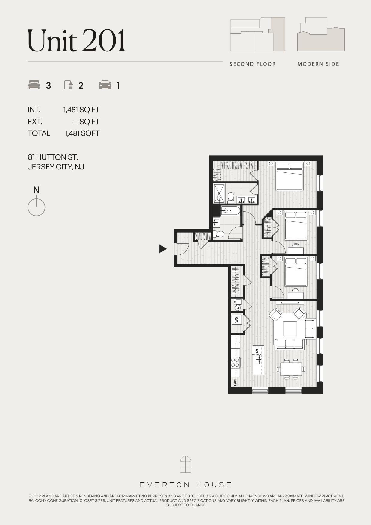 Welcome to Everton House. A nine-residence elevator building in Jersey City Heights, distinguished by curtain-wall glass imported from Spain, creating light-filled interiors with sweeping views of New York City. Everton House offers two, three, and four-bedroom residences, with select homes featuring private outdoor spaces and all residents enjoying access to a shared rooftop. Interiors are defined by dramatic ceiling heights and thoughtfully considered layouts. Kitchens are outfitted with JennAir appliances, including signature Black Obsidian interiors and a built-in coffee system. Primary bathrooms feature radiant heated floors, delivering a refined, spa-like experience. Additional amenities include garage parking with EV charging, a Swiftlane smart entry system, and a dedicated mail and package room designed for modern convenience. Renderings showcase select units and are for illustration only; actual unit details may vary.
