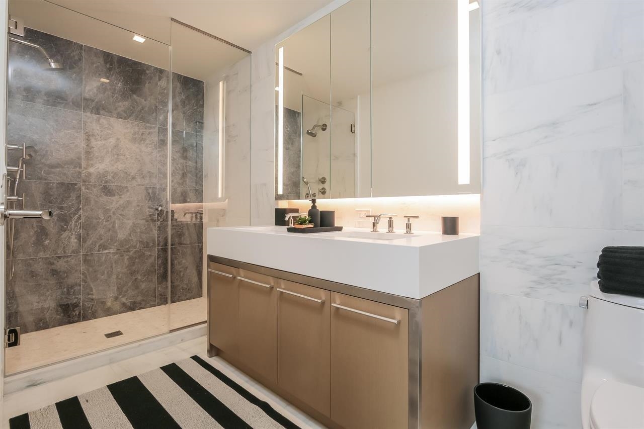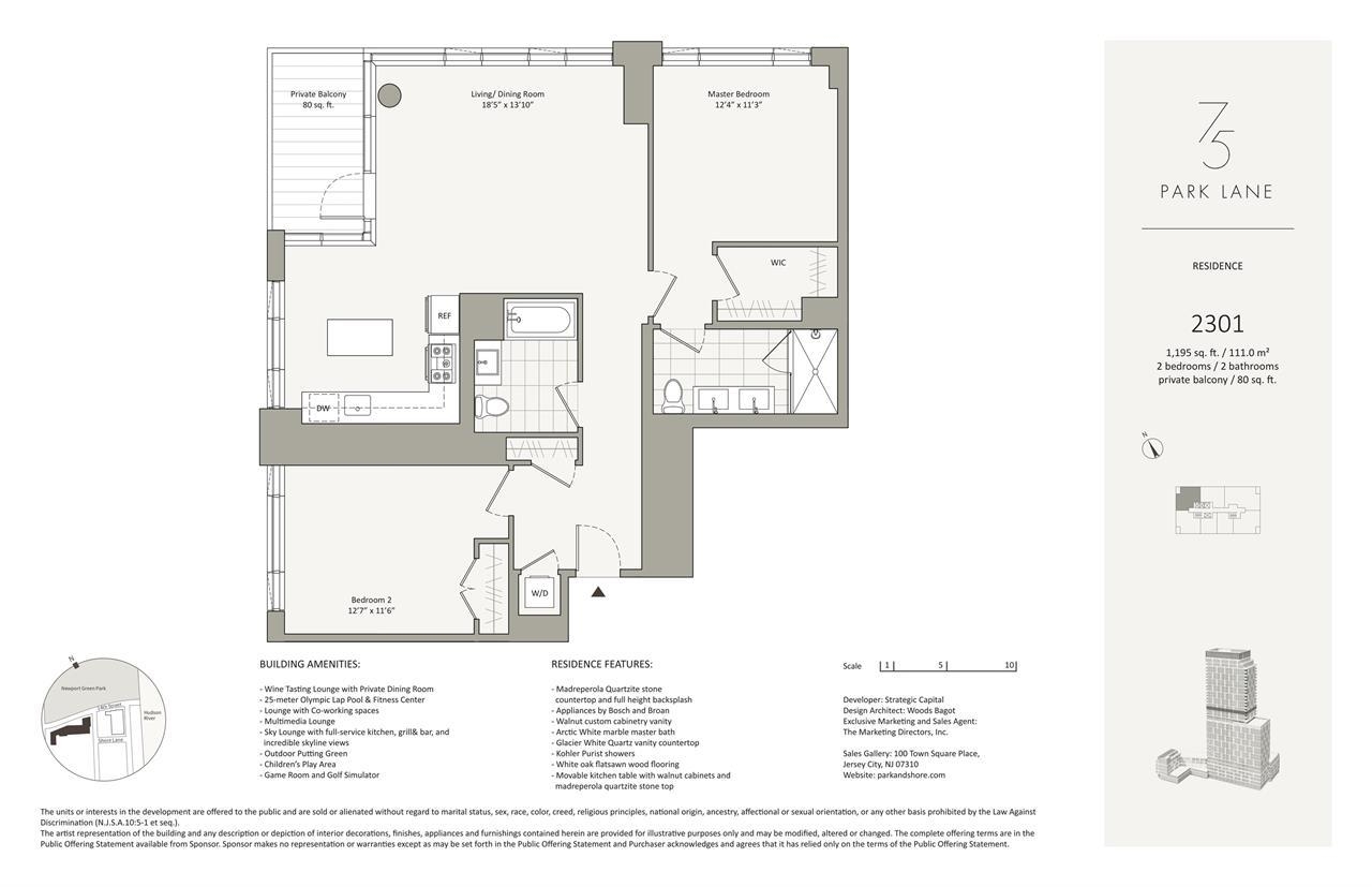 Residence 2301 is a premier northwest corner two-bedroom home featuring a private balcony. The split floor plan provides enhanced privacy—ideal for working from home or hosting guests. Designed for culinary enthusiasts, the alcove kitchen is equipped with an integrated Bosch appliance package, a kitchen island with Madreperola Quartzite countertop, and abundant cabinetry for ample storage. Notably, the range hood features a functional exhaust fan that vents outside. This unit features protected views of the Hudson River and Manhattan to the east, along with open, unblocked views to the west—perfect for enjoying golden hour sunsets from your private balcony. The master bath is thoughtfully designed with clean lines and precise craftsmanship, featuring Stellar White marble floors and walls, a frameless all-glass shower, and a custom dual vanity. Modern essentials include an in-unit washer/dryer, adjustable central A/C with a Google Nest Thermostat, and a suite of smart home features, including keyless entry. Motorized shades and curtains are installed for added convenience. The Building Located between two PATH terminals on a flourishing park adjacent to the Hudson River waterfront, 75 Park Lane is a warm and stylish addition to Jersey City’s vibrant Newport neighborhood. Standing 37 stories high, this sanctuary in the sky offers residents peace at home set against panoramic vistas. These intelligently crafted luxury condominiums are surrounded by light, air, and green space. The Amenities Whether for work or play, the amenities at 75 Park Lane create a homeowner’s paradise. Residents enjoy an indoor Olympic-sized heated lap pool and an adjacent fitness center, complete with a yoga room, teak-lined spa, and steam rooms. For socializing, the wine tasting lounge and private dining room sit alongside a co-working space, private conference room, and a multimedia lounge for movie nights or karaoke. Outdoor highlights include a sixth-floor putting green set against views of Midtown Manhattan and Newport Green Park. Finally, the Sky Lounge—a landscaped rooftop area with a full prep kitchen—provides a tranquil place to unwind or host large gatherings of friends.