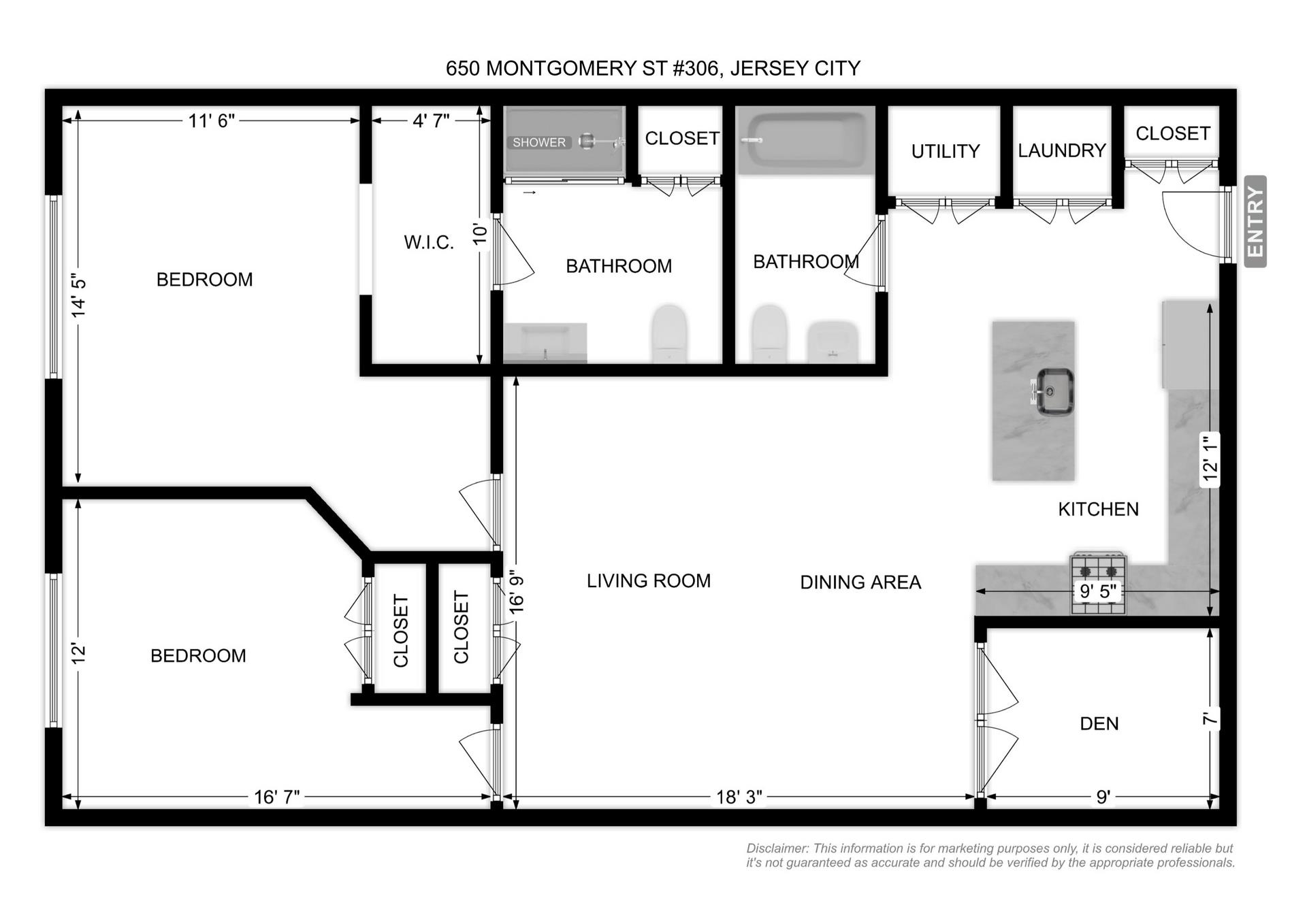 Modern 2BR/2BA loft-style condo with a flexible den in a full-service elevator building, ideally located in the heart of Jersey City. This expansive 1,150-square-foot home features sleek European kitchen cabinetry, an open-concept living and dining area, and striking exposed brick walls that add authentic loft character. The spacious primary suite offers generous closet space and a spa-inspired bath with a double vanity, a walk-in shower. and a heated towel bar. The second bedroom is equally well-proportioned and includes ample closet storage. The versatile den provides endless possibilities—perfect for a home office, nursery, or guest space. Additional highlights include hardwood floors throughout, central air, and an in-unit washer/dryer and covered garage parking. Residents enjoy building amenities such as a rooftop deck with sweeping panoramic views and a 24-hour virtual doorman. Located in the vibrant Journal Square area near shopping, restaurants and New York City transportation.