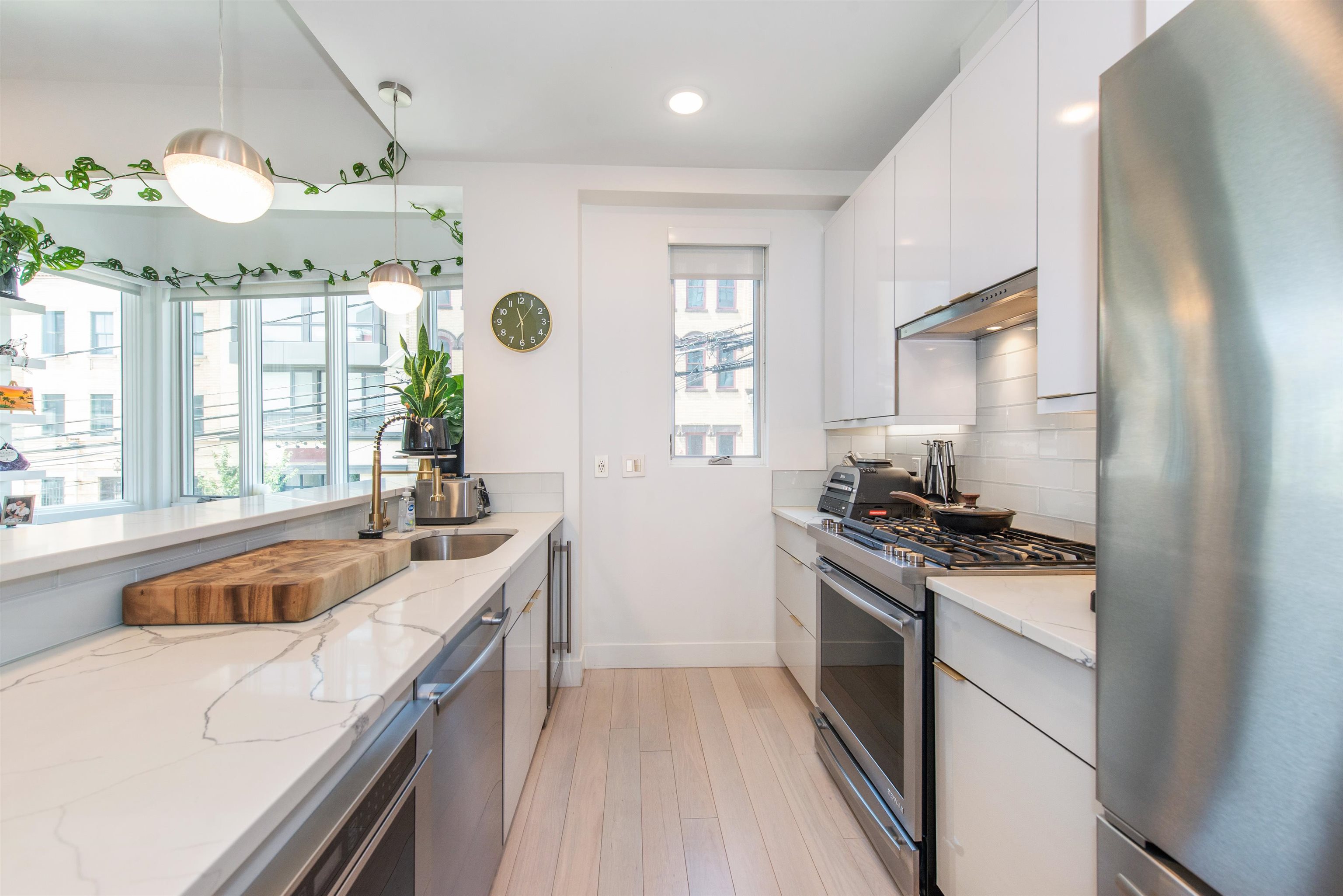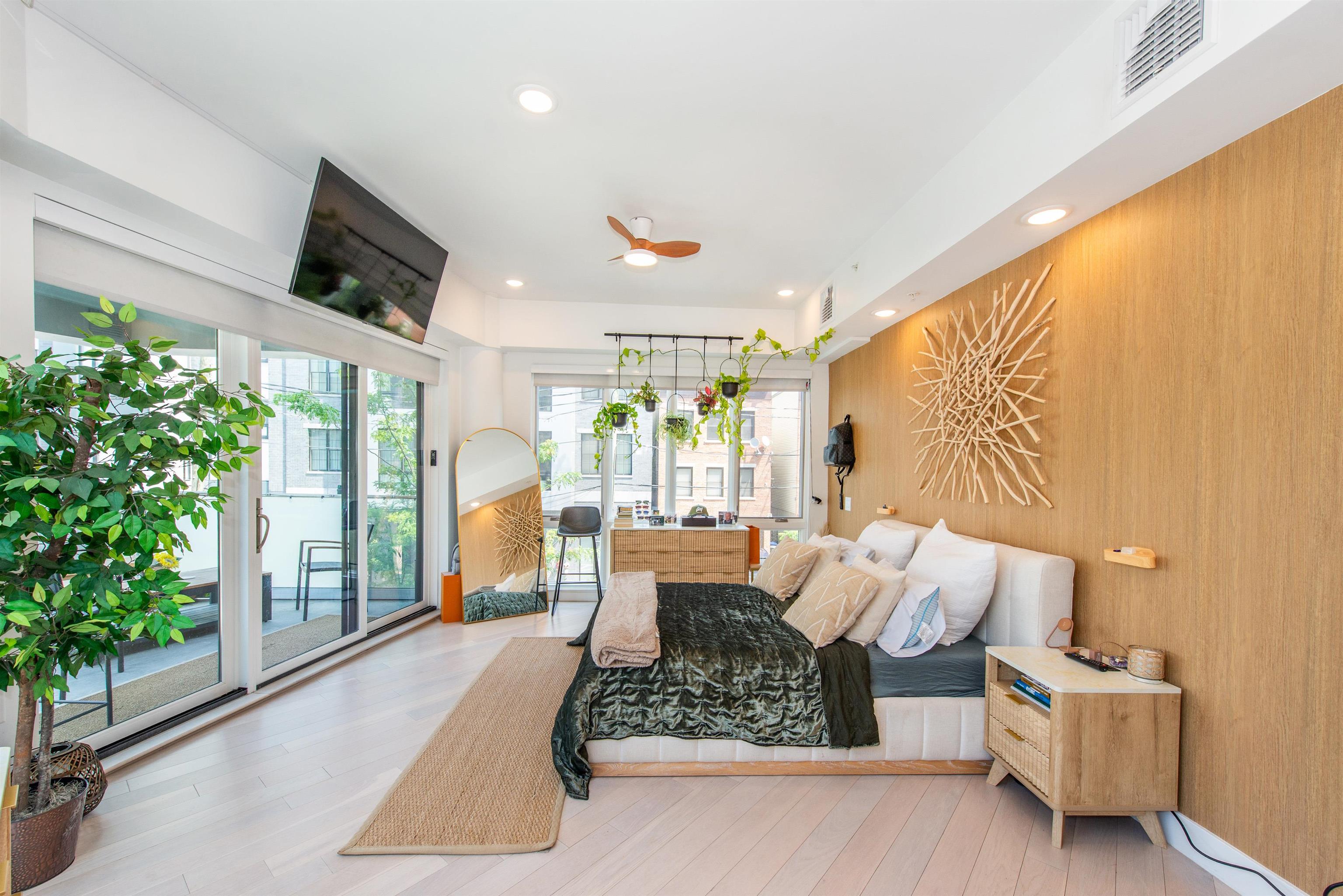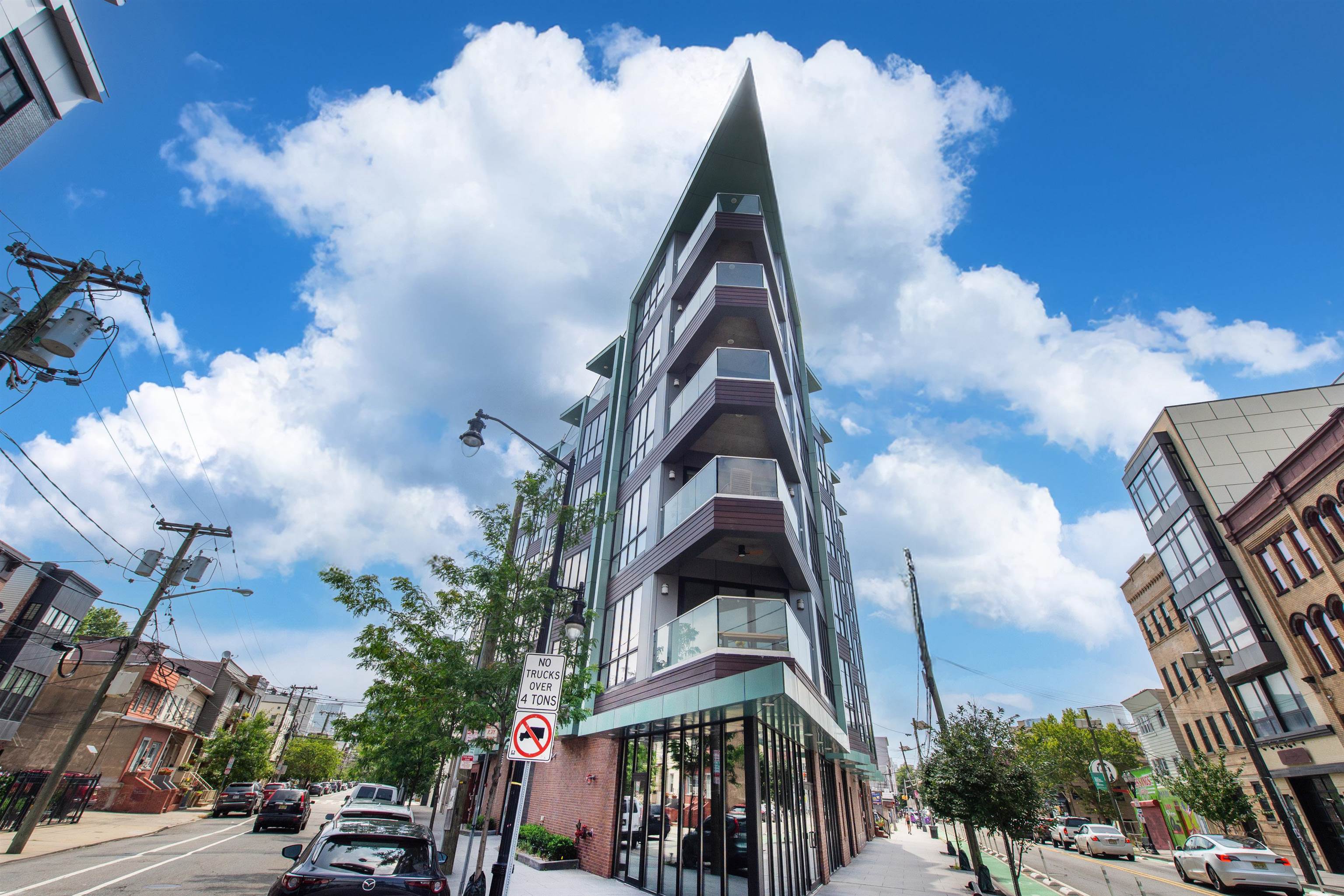 Welcome to The Cornerstone Lofts where modern luxury meets timeless design. This stunning 2-bedroom, 2-bath residence offers soaring 10-foot ceilings, rich hardwood floors, and a private balcony off the primary suite perfect for morning coffee or evening relaxation. The chef-inspired kitchen is a true showstopper, featuring top-of-the-line JennAir stainless steel appliances, custom lacquer cabinetry, sleek quartz countertops, a built-in wine fridge, and a fully vented hood ideal for entertaining or everyday gourmet cooking. Floor-to-ceiling Sierra Pacific windows flood the space with natural light while providing exceptional sound dampening and energy efficiency. Thoughtful details like custom window shades and high-performance heating and cooling systems enhance both comfort and sustainability. Residents enjoy exclusive access to a private fitness center on the 7th floor and a beautifully landscaped rooftop deck your personal urban oasis. Perfectly located near top-rated restaurants, parks, boutique shopping, and just minutes from NYC via convenient transportation options, this home offers the best of city living with a neighborhood feel. Designed by acclaimed MVMK Architecture and built by Kocher Construction, The Cornerstone Lofts are a rare blend of form, function, and elegance a place you'll be proud to call home.