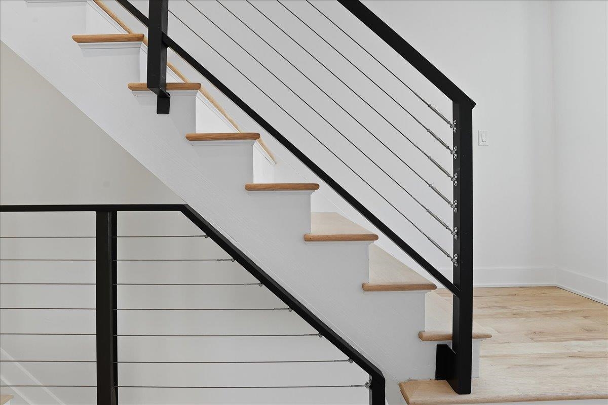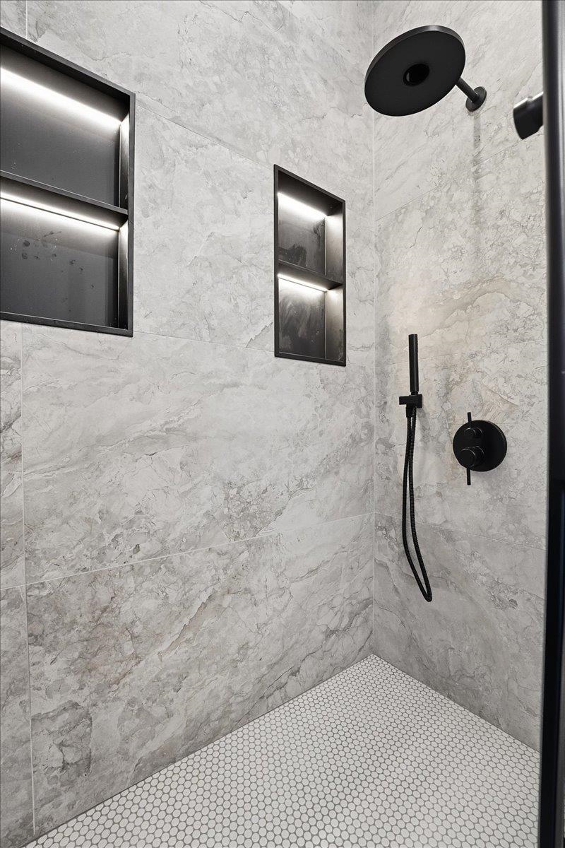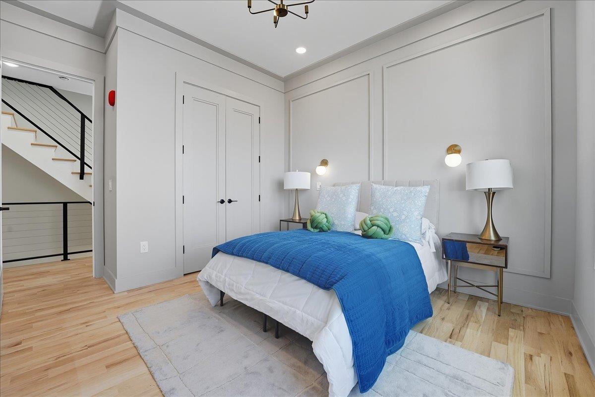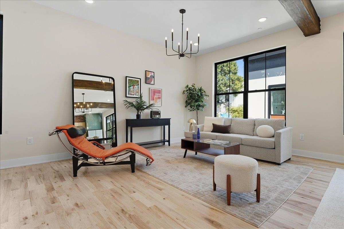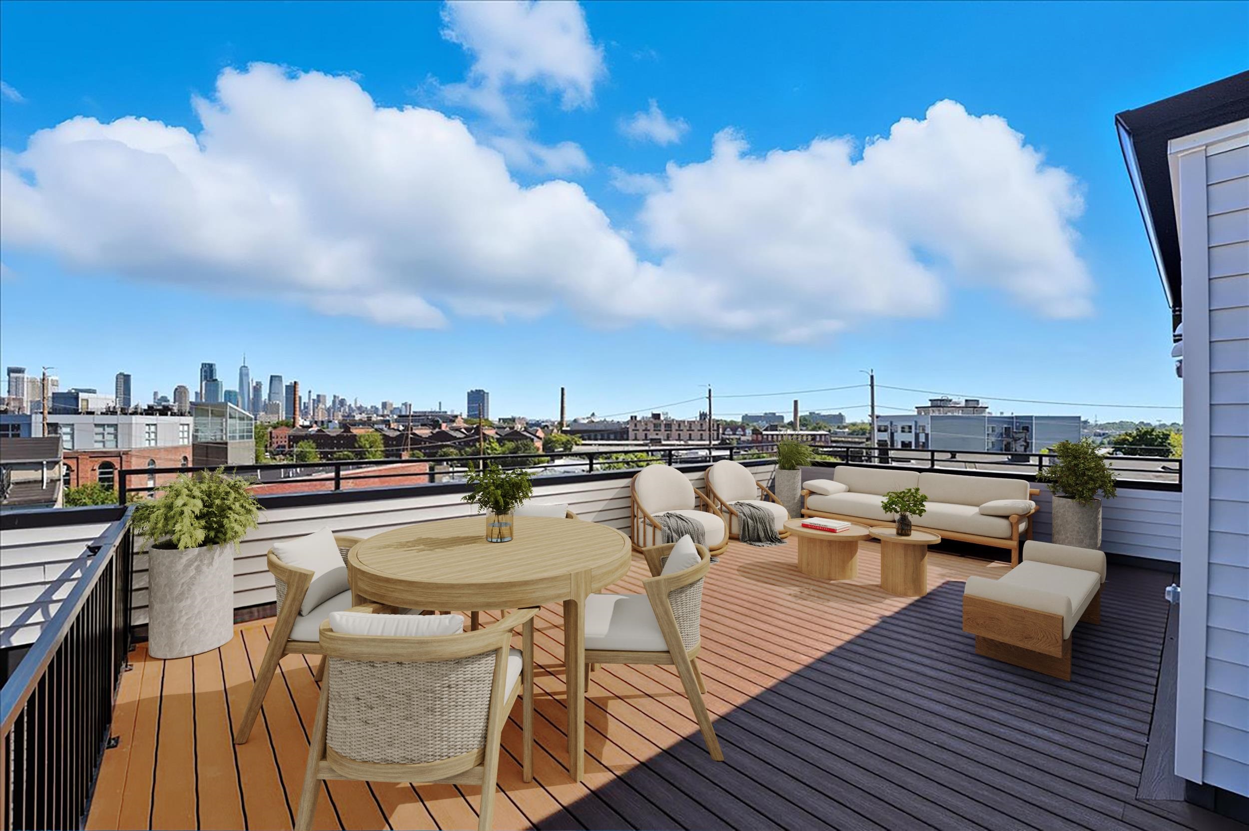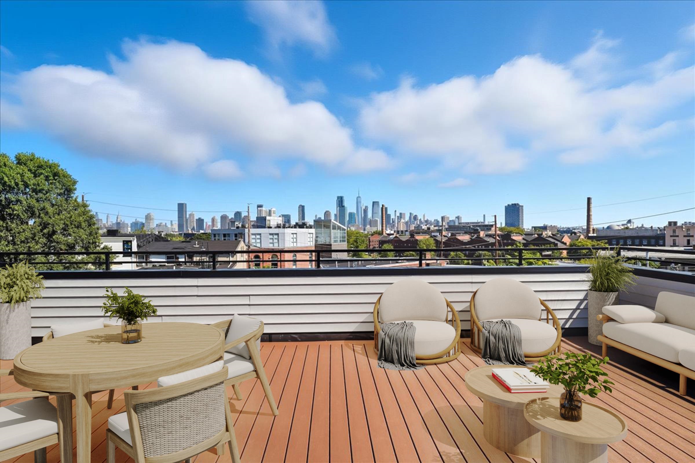 Seller's are now offering 1 year of pre-paid parking two doors down (at $200/mo per space)! Step out of the ordinary and enter a curated canvas—a designer showcase bringing Manhattan-level sophistication to the heart of Bergen-Lafayette. Spanning two stories with three bedrooms, two-and-a-half baths, and a private roof deck with skyline views, this residence is anything but cookie-cutter. From the moment you step inside, thoughtful design takes center stage. Light pine floors stretch beneath rich dark wood ceiling beams, while oversized windows invite natural light to flood the open-concept living, dining, and kitchen areas. A statement dry bar alcove—wrapped in emerald wood panelling, shadowy floral wallpaper, and crowned by a playful gold monkey sconce—adds just the right amount of edge and intrigue. The magazine-worthy kitchen combines exposed brick and modern polish, showcasing velvety deep sage cabinetry, grey quartz counters, brass fixtures, and stainless appliances—a space equally suited for weeknight dinners or friendly gatherings. Elevated at every turn, even the powder room surprises, dressed in deep-hued walls, wainscoting ceiling trim, and gleaming gold fixtures. Crowning it all is your own private rooftop—an urban oasis where the New York City and surrounding skylines stretch across the horizon, perfect for sunrise coffee or sunset cocktails. Upstairs, the primary suite feels serene yet tailored with soft grey panel molding and generous proportions. The ensuite bath is a masterclass in modern luxury with dark porcelain counters, a glass shower framed in matte black, penny tile floors, double vanity, and luxe gold-and-black fixtures. Everyday living is made easy with sizeable bedrooms, an additional double vanity, and a full laundry closet with side-by-side Samsung washer and dryer. Bringing beauty and brilliance to Bergen Lafayette, this home is moments from Berry Lane Park, the Hudson-Bergen Light Rail, and a growing collection of local cafés and eateries like The Roxy, Root + Nectar Café, and The Grind Shop. Liberty State Park’s waterfront paths and kayak launches wait just east for weekend wanderings while weekday commutes are a breeze with nearby Liberty State Lightrail Station with PATH and ferry connections. Bergen-Lafayette has quickly become one of Jersey City’s most exciting and fast-evolving neighborhoods with evolving culture, glowing community, and a blend of urban energy and local charm.
