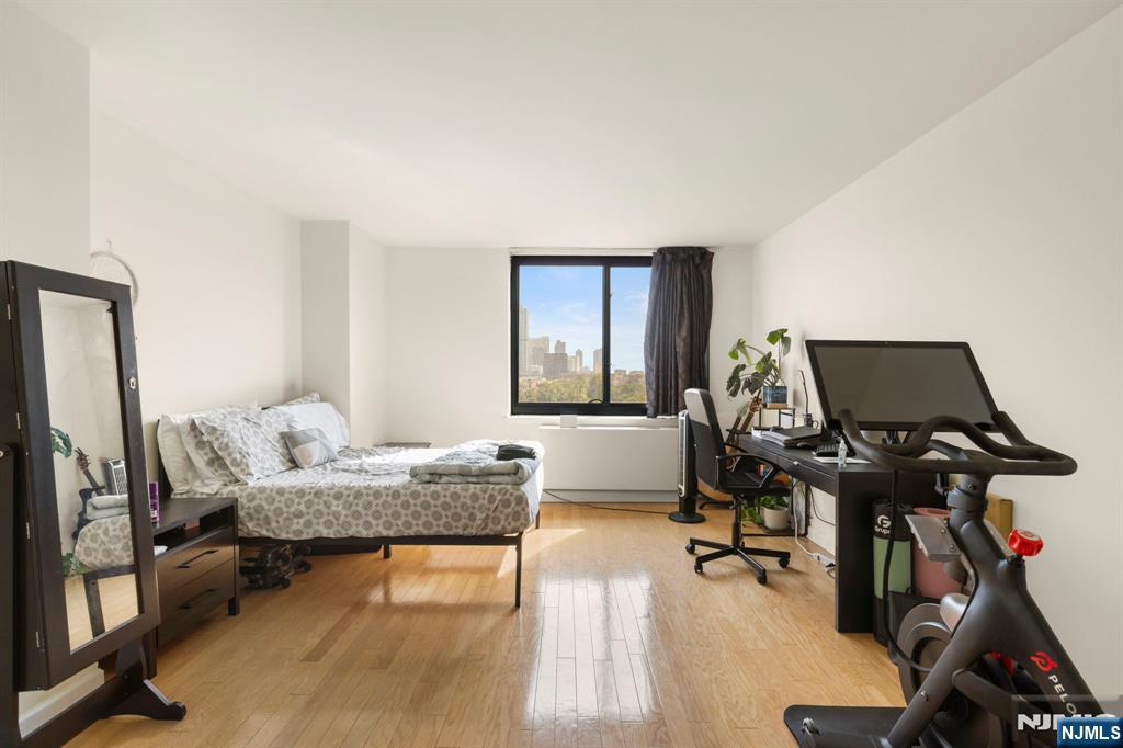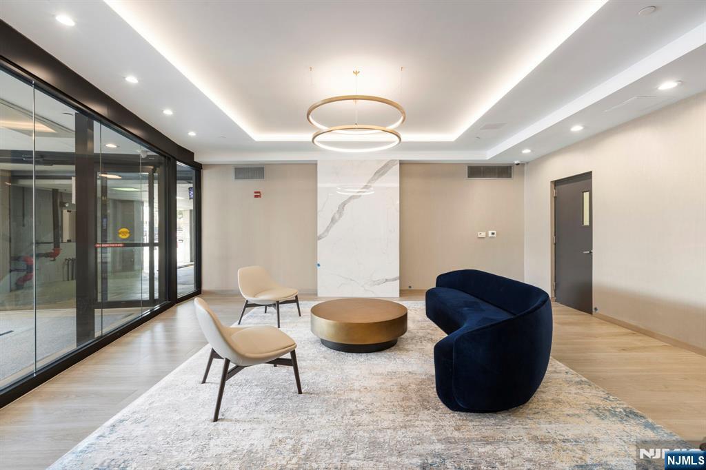 Beautiful and spacious 1-bedroom plus Den, 2 bath home with a private balcony in luxury community of 700 Grove St. The south facing exposure and open floor plan provides an abundance of natural light. Chef's kitchen features granite countertops, stainless steel appliances and breakfast bar. Primary bedroom has two walk-in closets and an ensuite bath. The home also includes custom entertainment center, hardwood floors, and in-unit washer/dryer. The exclusive community includes 24/7 doorman, shuttle to the Path, gym, community room, shared courtyard with BBQs, and playroom.