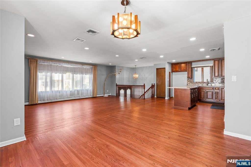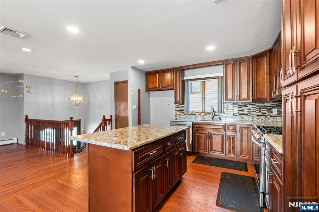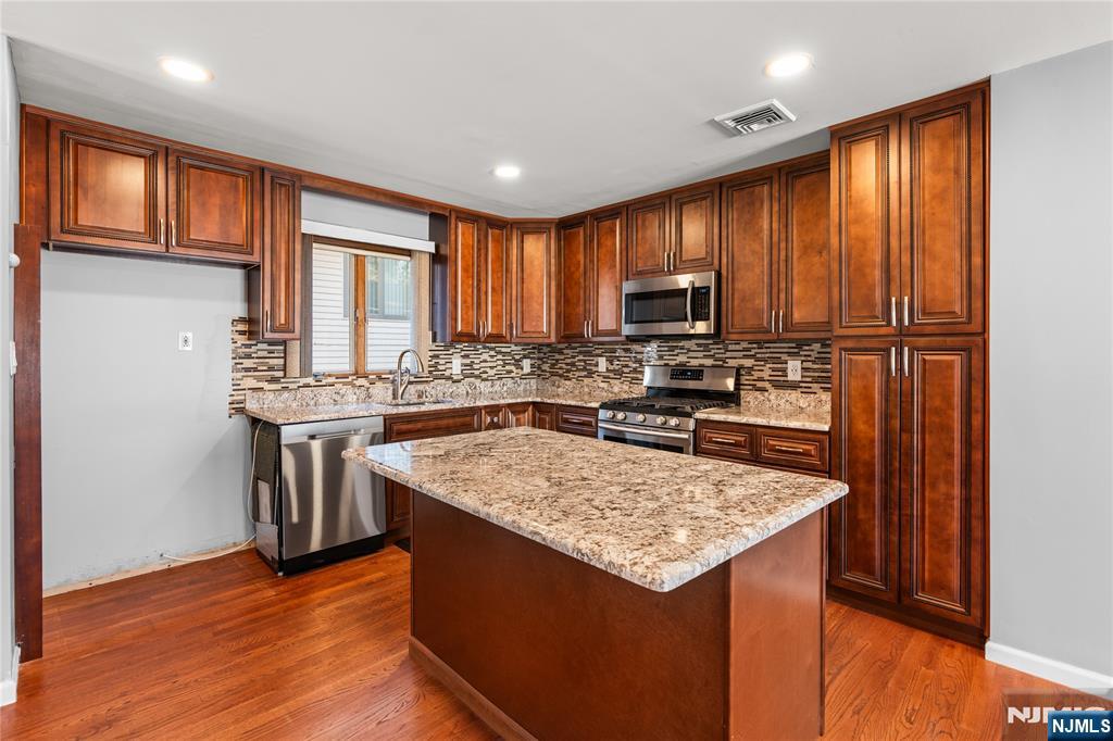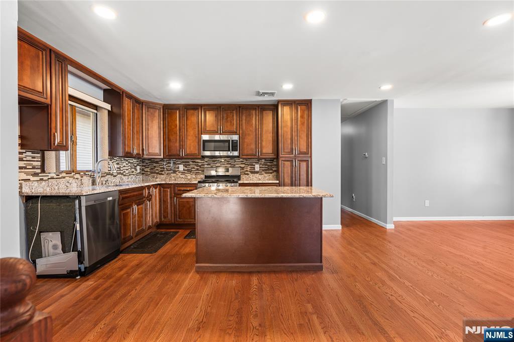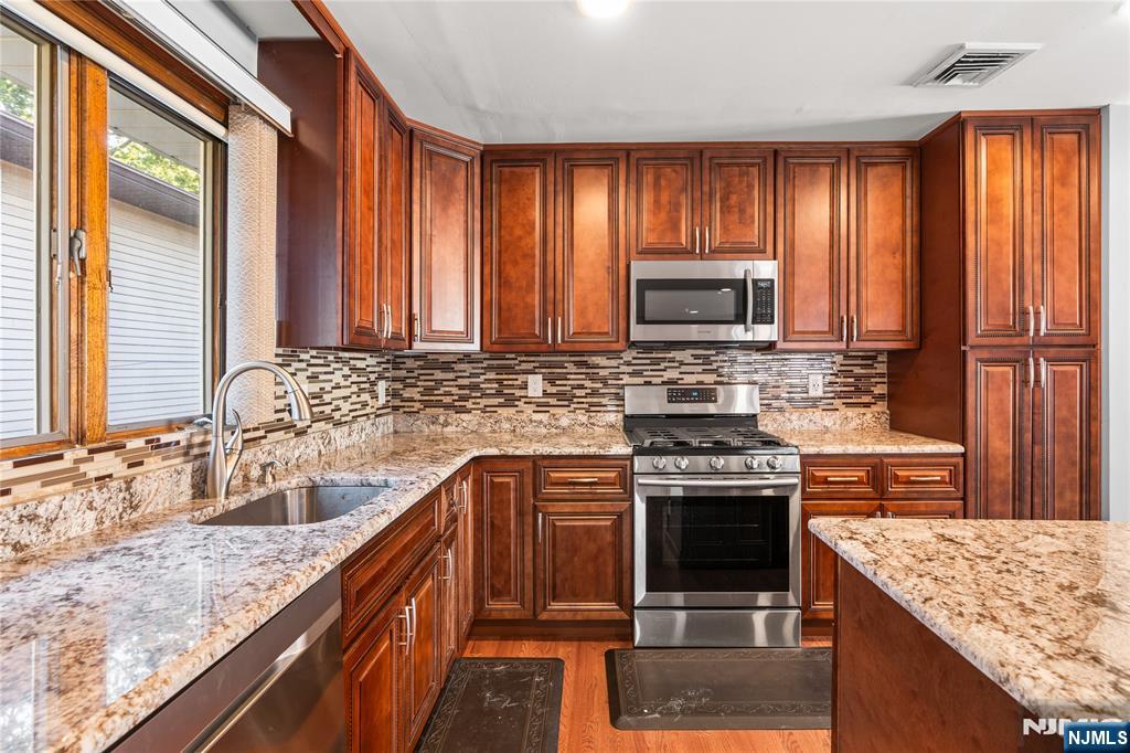 This exceptional bi-level home in Hasbrouck Heights offers 2,666 sq. ft. of versatile living space with a unique multi-level layout. The ground floor features a spacious mother-daughter style apartment, ideal for multi-generational living or rental potential, with a full kitchen, a large bedroom with ample closet space, a full bathroom, and a flexible room perfect as an additional bedroom or home office. A separate entrance and laundry area add convenience. The upper level boasts an open-concept design perfect for entertaining, with a modern granite kitchen, a generous living room, and a dining area. It includes three bedrooms, including a primary suite with a full bath and two large closets. New hardwood flooring graces all bedrooms and hallways. The home features a one-car garage, central air conditioning, and an outdoor shed on beautifully maintained grounds. Located close to town, local amenities, and with easy access for commuting to NYC, this home combines comfort, style, and functionality in one cherry-picked package. Perfect for families seeking space and versatility in a friendly neighborhood.