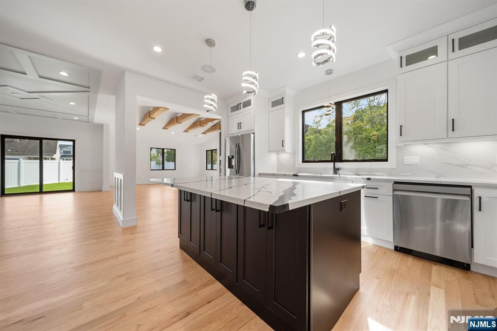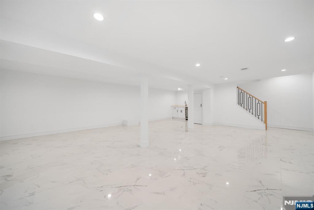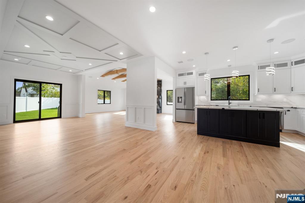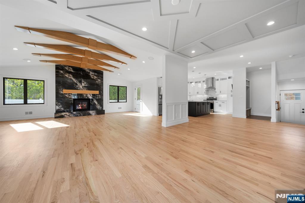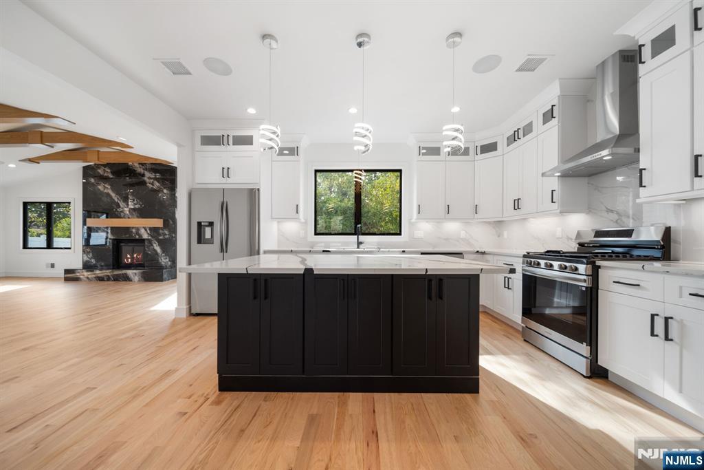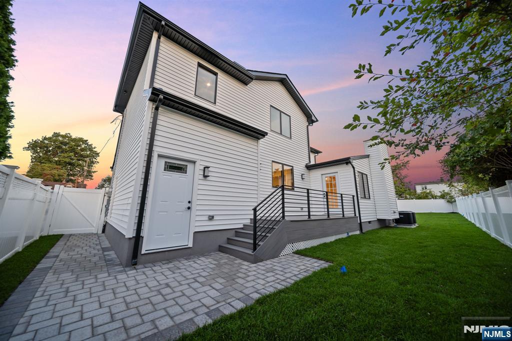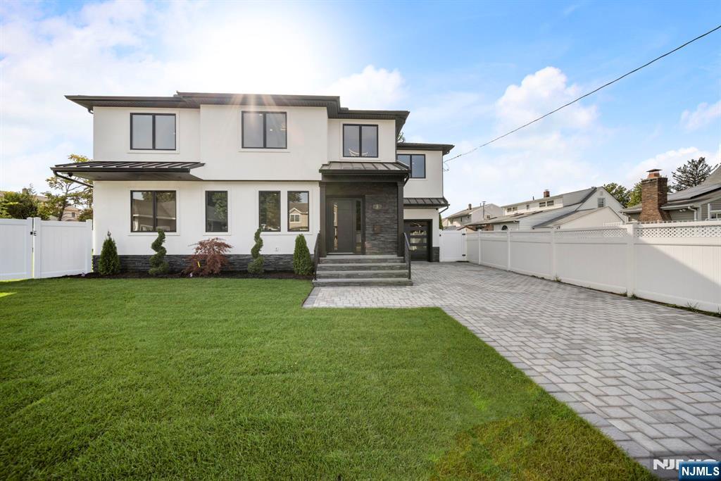 Experience refined living in this stunning new-construction 5-bedroom, 3-bath home, located on a cul-de-sac and thoughtfully crafted on an existing foundation with today’s modern lifestyle in mind. A paver driveway, and professional landscaping with fresh sod create exceptional curb appeal. The fenced backyard with 6’ vinyl fencing and multi-zone sprinkler system ensures both privacy and convenience. Step into a dramatic 2-story foyer leading to wide-plank white oak floors, modern staircase with rod iron balusters, bold accent wall, ceiling and mudroom leading to attached garage access. The inviting living room features a wood-burning fireplace framed by decorative exposed beams, while the chef’s kitchen impresses with quartz counters and backsplash, an oversized island, and premium Samsung & Sharp appliances. The first floor offers a versatile bedroom, full bath, and open-concept flow designed for entertaining. Upstairs, find four spacious bedrooms and two baths, including a luxurious primary suite with a custom walk-in closet and spa-like bathroom with a custom double vanity. A second-floor laundry with washer/dryer hookups adds ease. The finished basement offers a large family room with tiled floors, a wine bar with sink, and plenty of space for gatherings. Additional comforts include 2-zone heating/cooling and central vacuum. Conveniently located and close to NYC transportation, this home blends elegance, comfort, and function in every detail, truly a must-see.