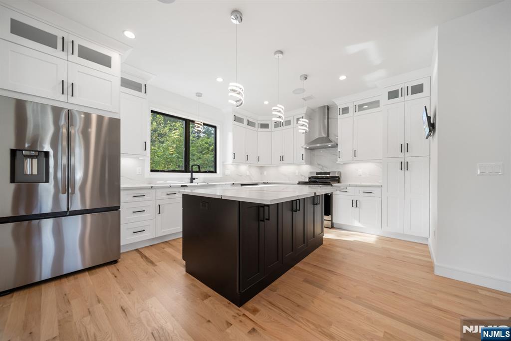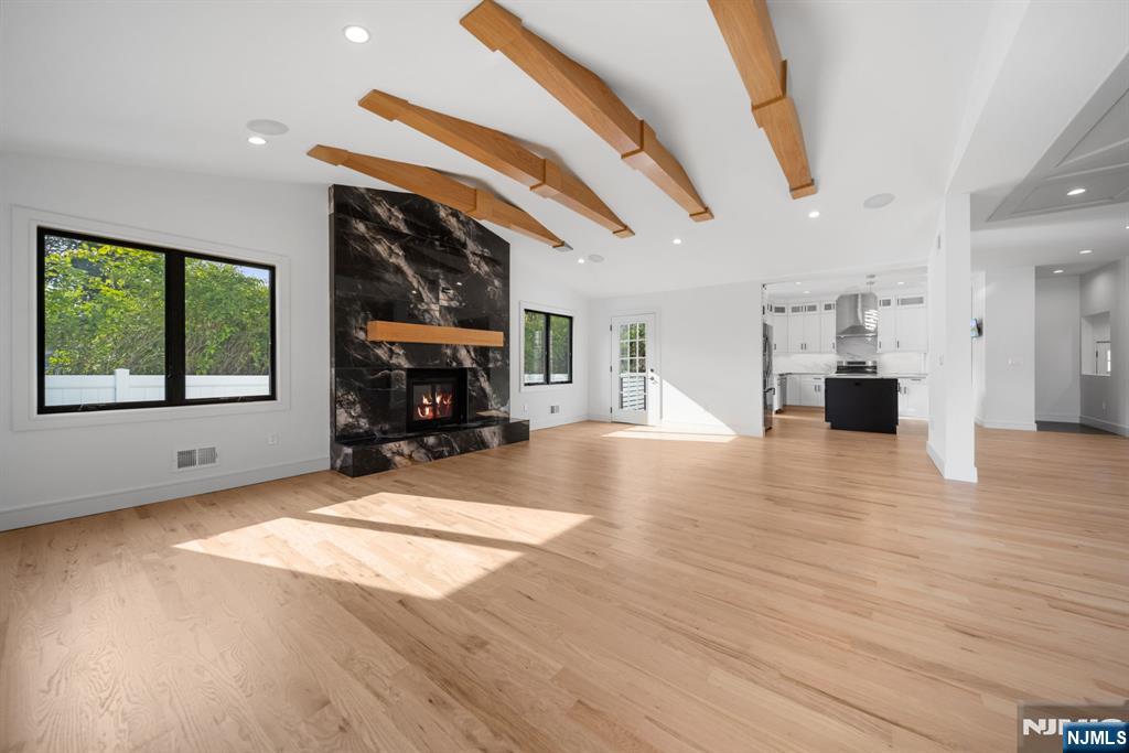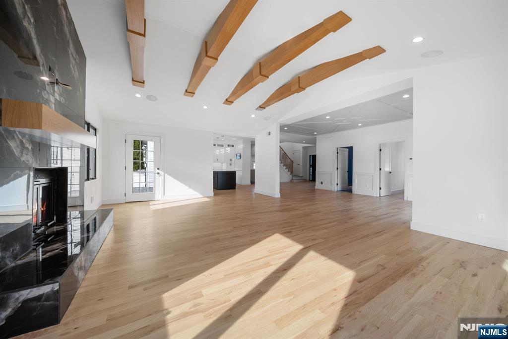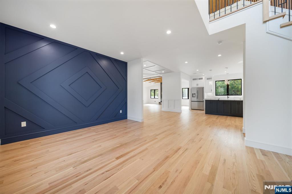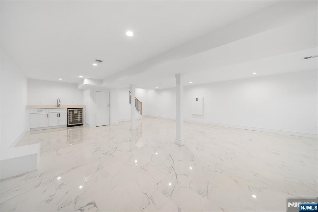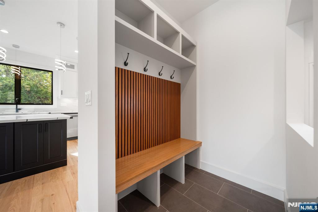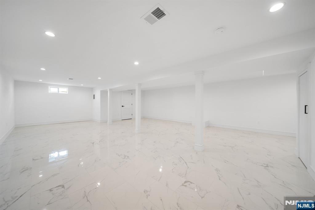 Experience refined living in this stunning new-construction 5-bedroom, 3-bath home, located on a cul-de-sac and thoughtfully crafted on an existing foundation with today’s modern lifestyle in mind. A paver driveway, and professional landscaping with fresh sod create exceptional curb appeal. The fenced backyard with 6’ vinyl fencing and multi-zone sprinkler system ensures both privacy and convenience. Step into a dramatic 2-story foyer leading to wide-plank white oak floors, modern staircase with rod iron balusters, bold accent wall, ceiling and mudroom leading to attached garage access. The inviting living room features a wood-burning fireplace framed by decorative exposed beams, while the chef’s kitchen impresses with quartz counters and backsplash, an oversized island, and premium Samsung & Sharp appliances. The first floor offers a versatile bedroom, full bath, and open-concept flow designed for entertaining. Upstairs, find four spacious bedrooms and two baths, including a luxurious primary suite with a custom walk-in closet and spa-like bathroom with a custom double vanity. A second-floor laundry with washer/dryer hookups adds ease. The finished basement offers a large family room with tiled floors, a wine bar with sink, and plenty of space for gatherings. Additional comforts include 2-zone heating/cooling and central vacuum. Conveniently located and close to NYC transportation, this home blends elegance, comfort, and function in every detail, truly a must-see.