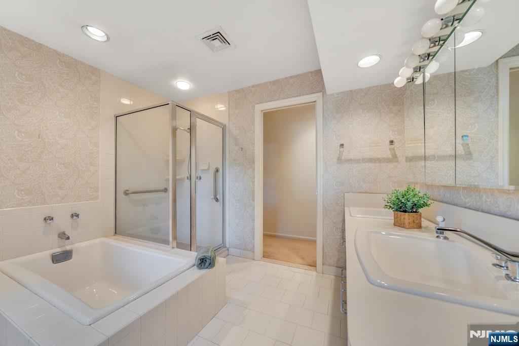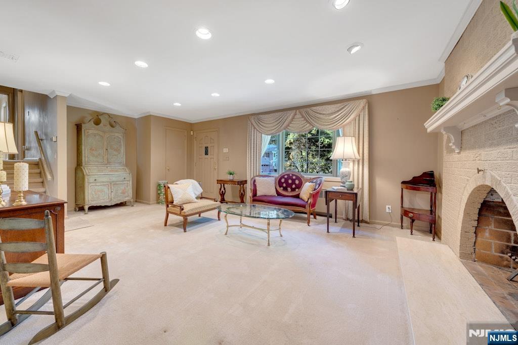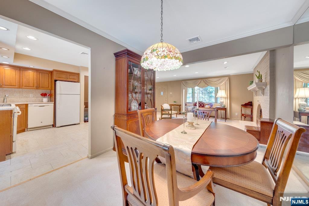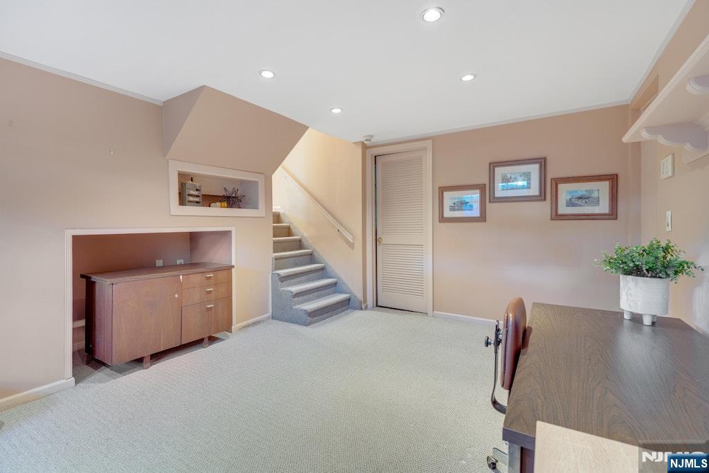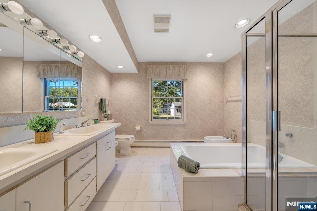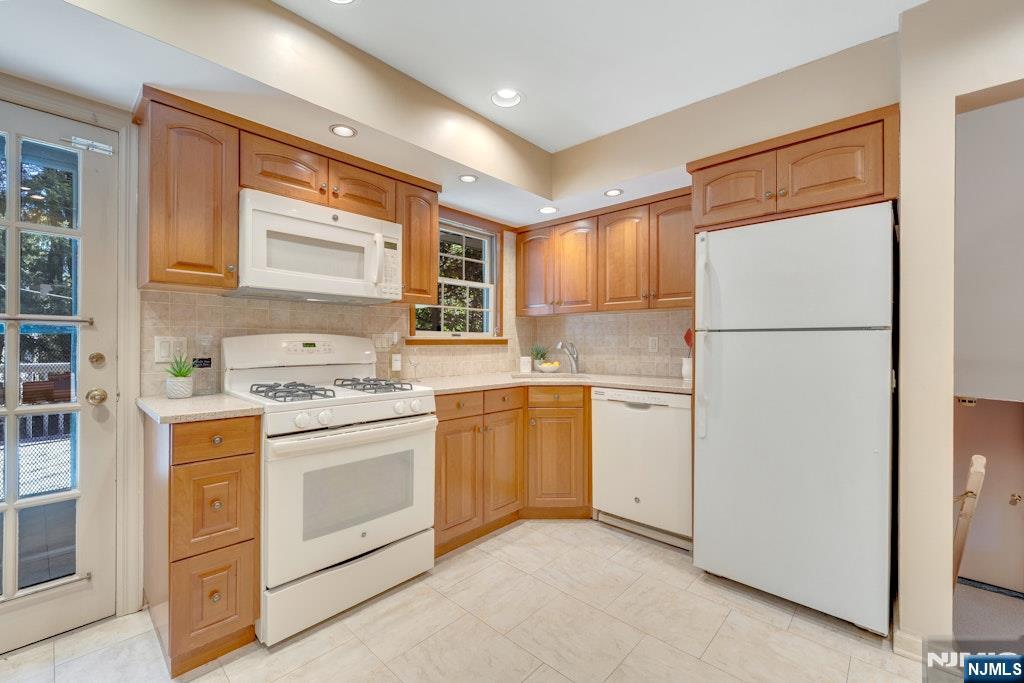 Seize the opportunity in quintessential Ho-Ho-Kus - one of New Jersey’s most sought-after towns! Nearly 2,000 sq. ft. of living space, this 3-bedroom, 2.5-bath expanded split level offers the perfect blend of town, space, and potential. The living room features a beautiful bay window, a floor to ceiling brick fireplace, recessed lighting and wood floors hidden beneath the carpet. Lovely dining room with double windows opens into a 10-year-old eat in kitchen with tiled backsplash and door to huge rear deck plus shed. Grade level den/office offers recessed lighting and built in shelves and leads out to the oversized 2 car garage. Laundry room/utility room has access to additional crawl space. The expanded primary suite impresses with vaulted ceilings, Palladium windows, 2 walk-in closets, and an impressively sized private full bath with stall shower and jetted tub. The original primary suite has a walk-in closet plus powder room while the 3rd bedroom with track lighting has access to the full bath off hallway. Central air, sprinkler system, security system, tiled entry, large driveway, and Bessler stairs to the attic are just a few of the extras. This tree-lined neighborhood with connecting streets boasts a “close-to-everything†locationâ€â€top-rated K-8 school, charming downtown with shops and dining, and easy NYC commute via bus and train. Bring your vision and personal touches to make this home your own!