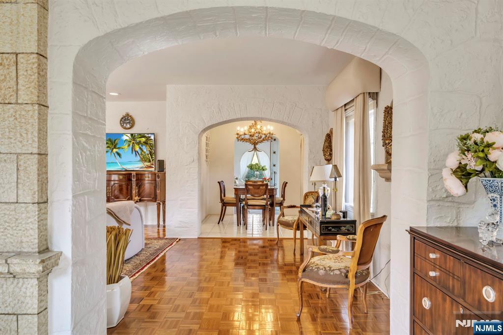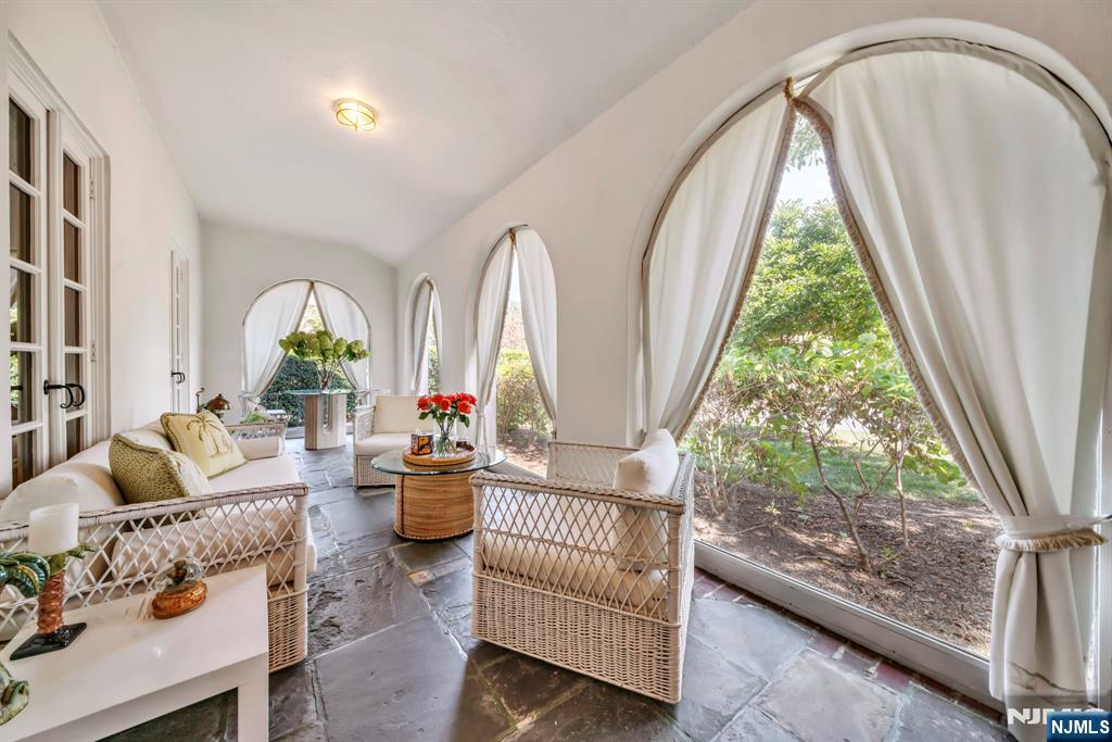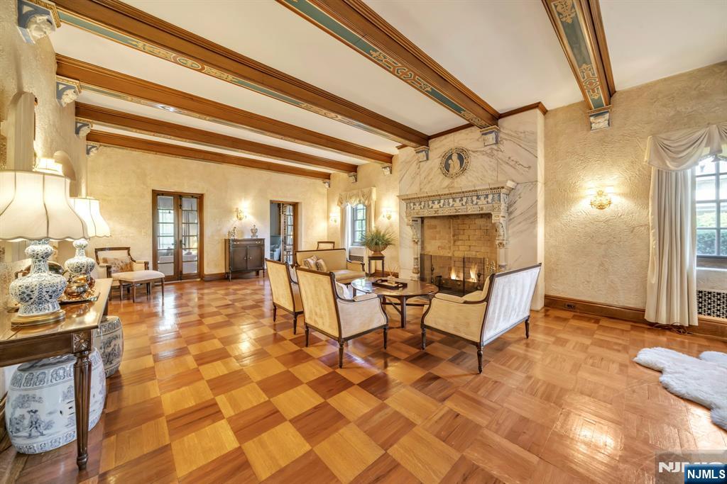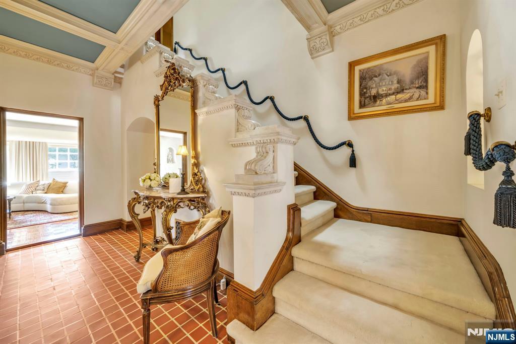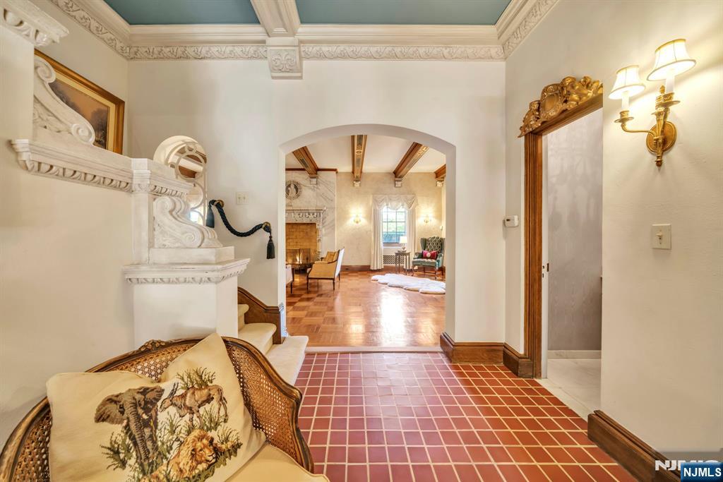 Built in 1927, this Spanish Colonial Revival estate offers 4,866 square feet of elegant living space on nearly half an acre in one of Glen Rock’s most distinguished residential settings. Defined by its mission tile roof, arched entries, and original millwork, the home blends historic character with expansive interiors suited for modern living. High ceilings enhance every level, beginning with a grand living room with fireplace, a sunlit family room, and a front sitting area enclosed by a series of large arched windows. The formal dining room is crowned with architecturally detailed coffered ceilings, while a library with built-ins provides a refined retreat. A versatile kitchen with pantry and a well-placed powder room complete the main level. Multiple exits lead outdoors to a private side courtyard and to a patterned-paver driveway that extends to the detached three-car garage. The upper level offers five bedrooms and two full baths, with the primary bedroom serving as a serene focal point for the floor. The finished lower level expands the living space with a recreation hall, media lounge, custom wine cellar, full bath, laundry, and ample storage. Landscaped grounds and extensive hardscaping unify the exterior and reinforce the estate’s architectural presence. This is a rare opportunity to own a residence of lasting quality and distinction in the heart of Glen Rock.