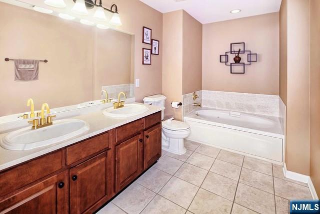 Distinguished Chatham style home tastefully upgraded throughout!! Magnificent soaring ceilings and oversized windows. Flooded with natural sunlight all day long. Cherry cabinets, quartz counters and stainless steel appliances in designer kitchen. Hardwood floors. Wall fireplace. Lofted area on second level with newer wide plank hardwood floors; could be third bedroom. Recessed and custom lighting. California closets in master bedroom closet. Upgraded fixtures in master bathroom. Jacuzzi tub. Alarm. Parking for two cars; one in private garage and one in driveway. Community features two pools with jacuzzis, tot lot, waterfront promenade and shuttle to Ferry and Light Rail. Steps to 158 bus to NYC. Close to restaurants and shopping.