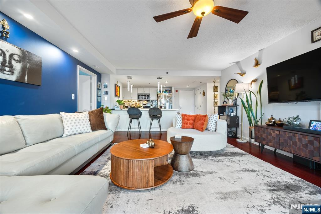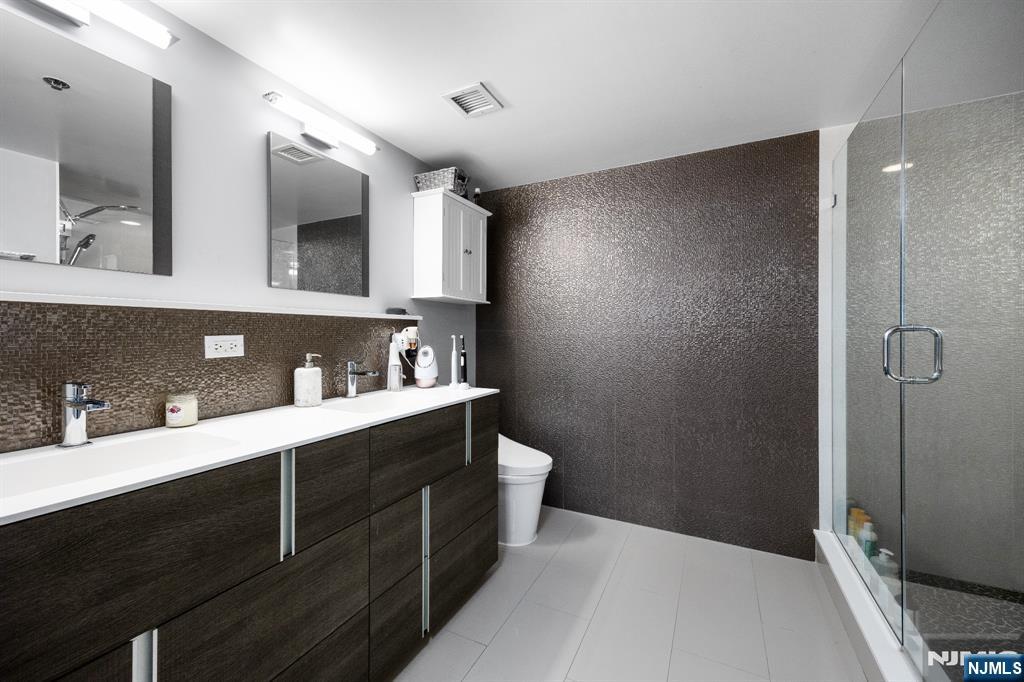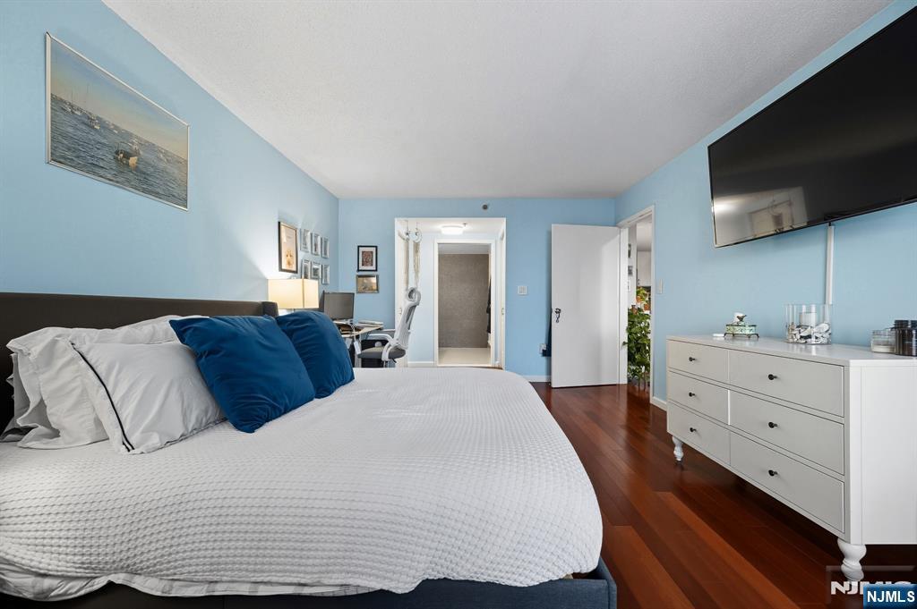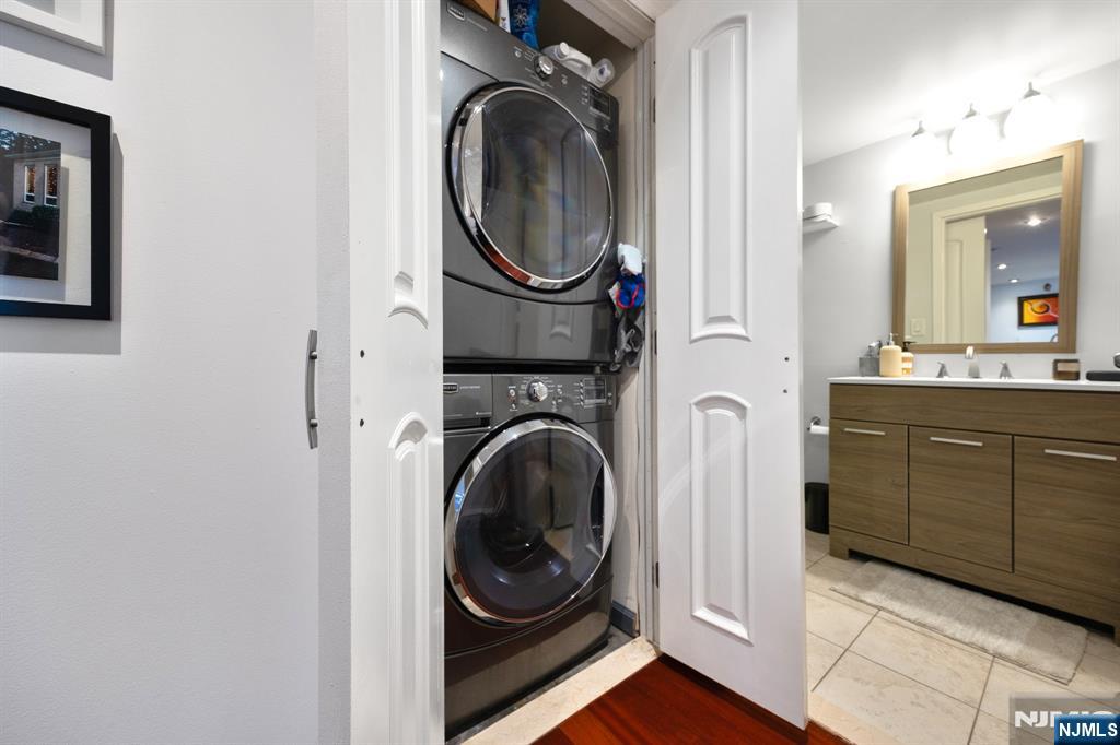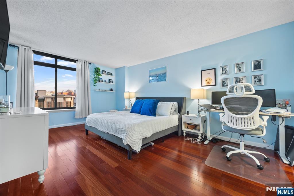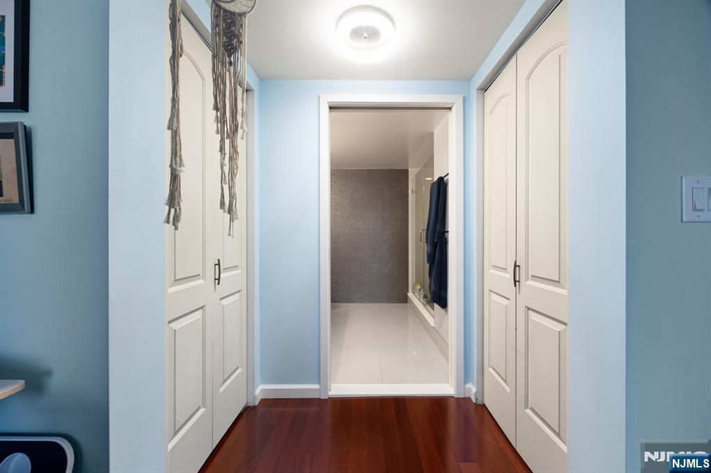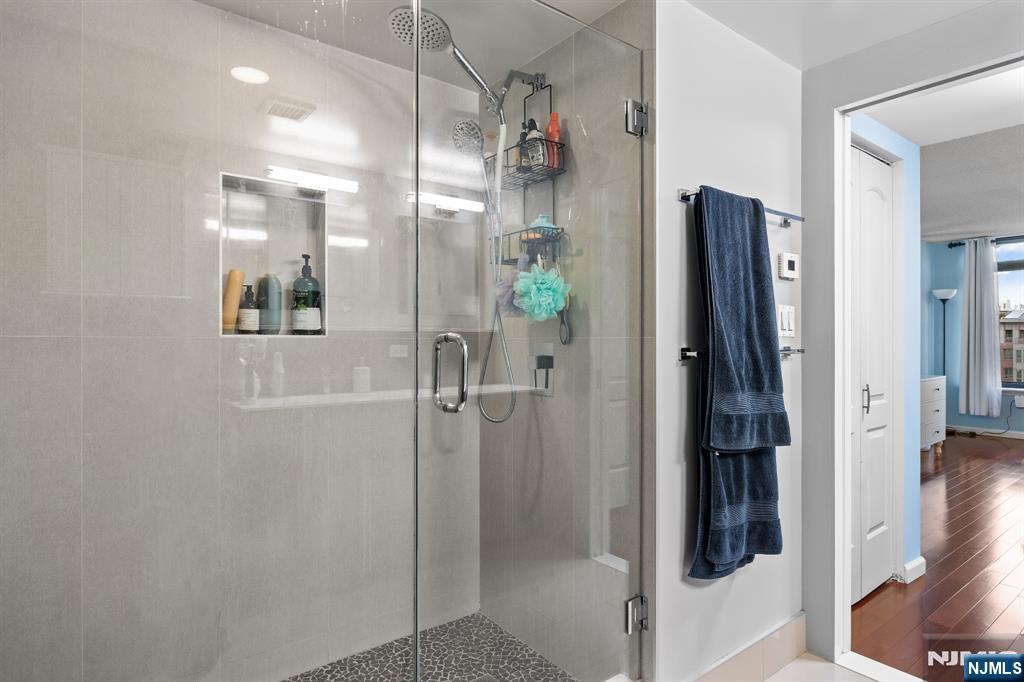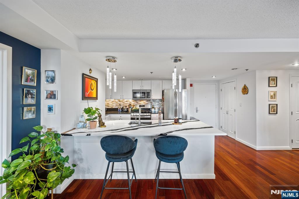 Welcome home to this beautiful fully renovated 2 bed, 2 bath with NYC views and a private balcony in the prestigious Sky Club. Enjoy a chef's kitchen with GE stainless steel appliances, quartz countertops, custom backsplash and a breakfast bar. The spacious primary bedroom has walk in closets and a renovated ensuite bathroom with radiant under floor heating. The second bedroom is large with a renovated shared bathroom. The home also features hardwood floors, recessed lighting, central AC via a Nest thermostat, bidets in both bathrooms, and an in-unit washer/dryer. The Sky Club building amenities include 24/7 concierge, elevator, and shuttle to the PATH. On-site garage parking, gym, and pool are available for an additional fee. Conveniently located near a light rail station, bus stops, and all the shops and restaurants that Hoboken has to offer. Move in 11/1/25.