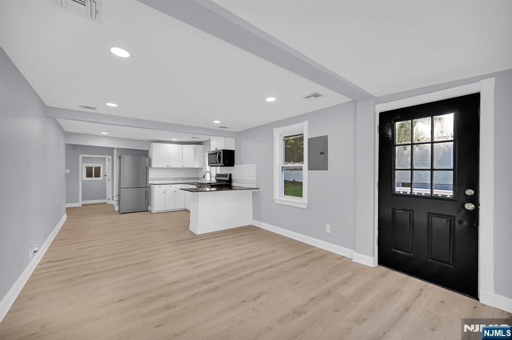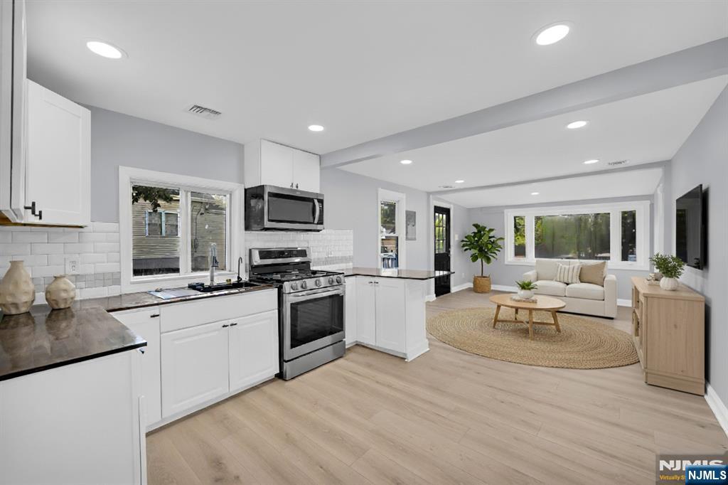 Renovated 2 Bedroom Ranch! This move-in ready home offers a modern, open-concept design in desirable West Milford. The brand-new kitchen features sleek white cabinetry, stainless steel appliances, a subway tile backsplash, and a breakfast bar. The living space is brightened by a large bay window and beautiful new plank flooring throughout. A fully updated bathroom boasts a modern vanity and tiled shower. Enjoy easy outdoor living with a deck and patio access via a sliding glass door. This is the perfect turn-key starter home or downsize opportunity!