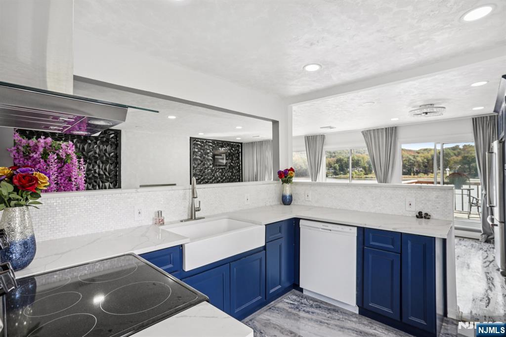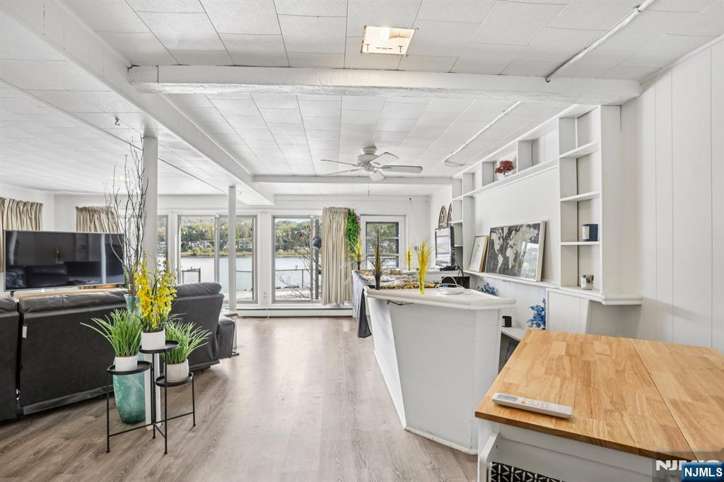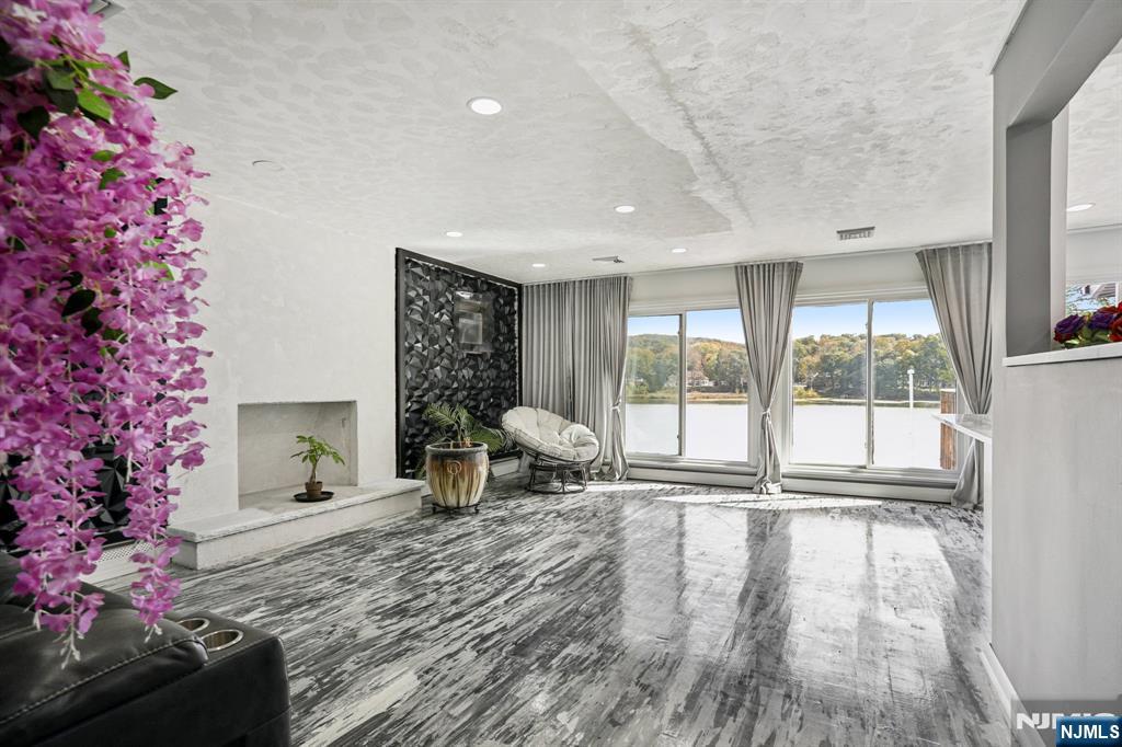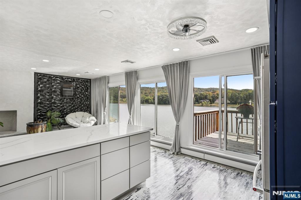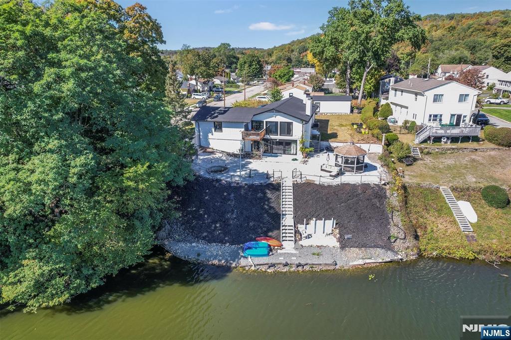 Welcome home to this exceptional 3 bedroom, 2 bathroom open concept Ranch, nestled on an oversized corner lot with what might be the best panoramic lake views in town! Step inside the welcoming foyer and into the stunning living room, where soaring ceilings, wood-burning fireplace, and floor-to-ceiling windows showcase the lake in all its beauty, creating an ambiance of serenity. The open flow continues into the designer kitchen, featuring custom cabinetry, quartz countertops, a stylish backsplash, pantry, and center island with seating. Sliding glass doors extend your living space outdoors to the deck perfect for entertaining or savoring peaceful mornings surrounded by nature. Down the hall, the home offers a spacious primary bedroom with a large closet and opportunity for an en suite, while two additional bedrooms and a full bath complete the level. The full finished walkout basement boasting kitchenette, full bath, family room with soaring ceilings, second fireplace, and bar all framed by breathtaking lake views. Glass doors lead to the patio, gazebo, and fire pit, inviting evenings of relaxation and conversation.Stairs lead down to the water's edge, with the option to add a floating dock for boating, kayaking, or swimming. With a two-car attached garage, detached garage/shed, and ample parking, this residence blends luxury and convenience. Just moments from NYC transportation, shopping, and dining, this home offers an unmatched lifestyle of refined lakefront living.